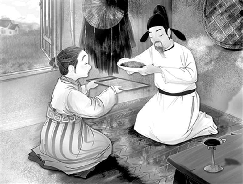 荀媪“跪进雕胡饭”,唐人仍旧席地而坐,跪坐是一种常见的姿势。李白吃饭时跪坐在案旁,荀媪将饭端进来时也是跪下身子呈给他,突显出荀媪对李白的尊重。“雕胡”就是“菰”,俗称茭白,生在水中,秋天结实,叫做菰米,田家以此为待客之美馔。农家呈给诗人的不是山珍海味、美味佳肴,可是已经是农家最好的食物,进一步深化荀媪待李白之诚挚。“月光明素盘”,素盘与明月交辉,皎洁灿烂,诗人由此礼赞荀媪诚以待人、慷慨无私的贤德。“令人惭漂母,三谢不能餐”,这里用的是韩信受漂母之恩而后重金相报的典故,以“漂母”比荀媪,荀媪如漂母为韩信提供饮食一样款待自己,诗人被深深感动,再三拜谢,不忍心享用这一顿美餐。