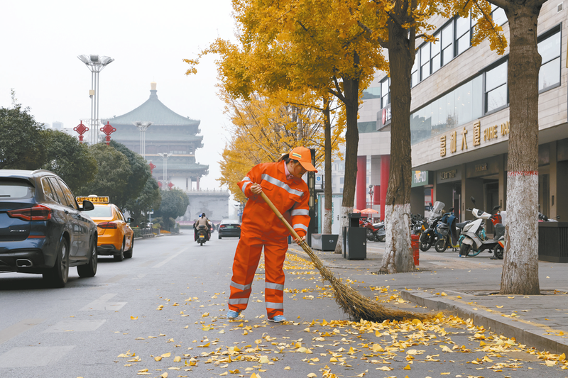 11月24日清晨,环卫工华师傅在一排金黄色的银杏树下清扫落叶。每到秋末初冬,西安市南大街两旁的银杏树由绿渐黄,金灿灿的银杏树将整个街道装扮得格外靓丽,美不胜收。 巴新建 摄