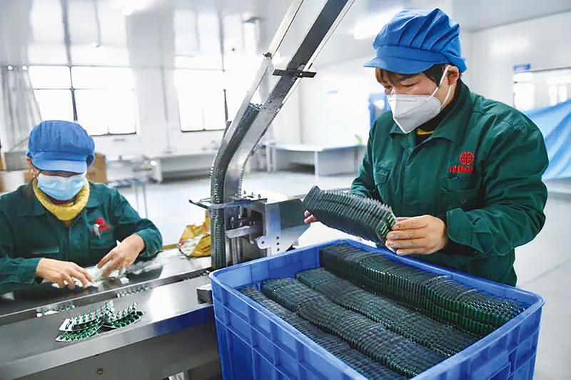 在利君制药鄠邑生产基地,固体制剂生产中心内一片繁忙景象。片剂、颗粒剂、胶囊剂生产线上,工人们各司其职。通过称量、干燥、压片等工序,一片片克感敏药片通过生产线传送带进入了包装环节。