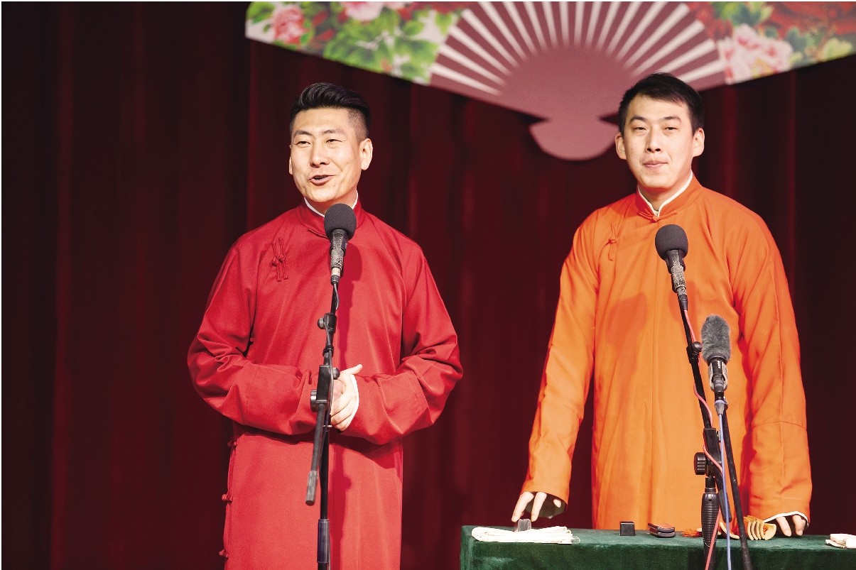 “祝我们今天在场的朋友们,一帆风顺、二龙戏珠、三阳开泰、四季发财、五福临门、六六大顺、七星报喜、八面威风、九九吉祥、十全十美!”“谢谢大家的掌声鼓励!冲着你各位,今儿我在这卖卖力气,我在这唱一段。”台上相声“包袱”一个又一个,台下的笑声持续不断,观众们不时拍手叫好,与演员们一起互动,仿佛一整年的烦恼就此烟消云散。
