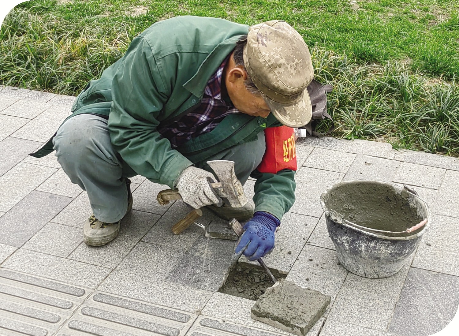 工人正在对广场上的人行道进行维护。(骆红燕)