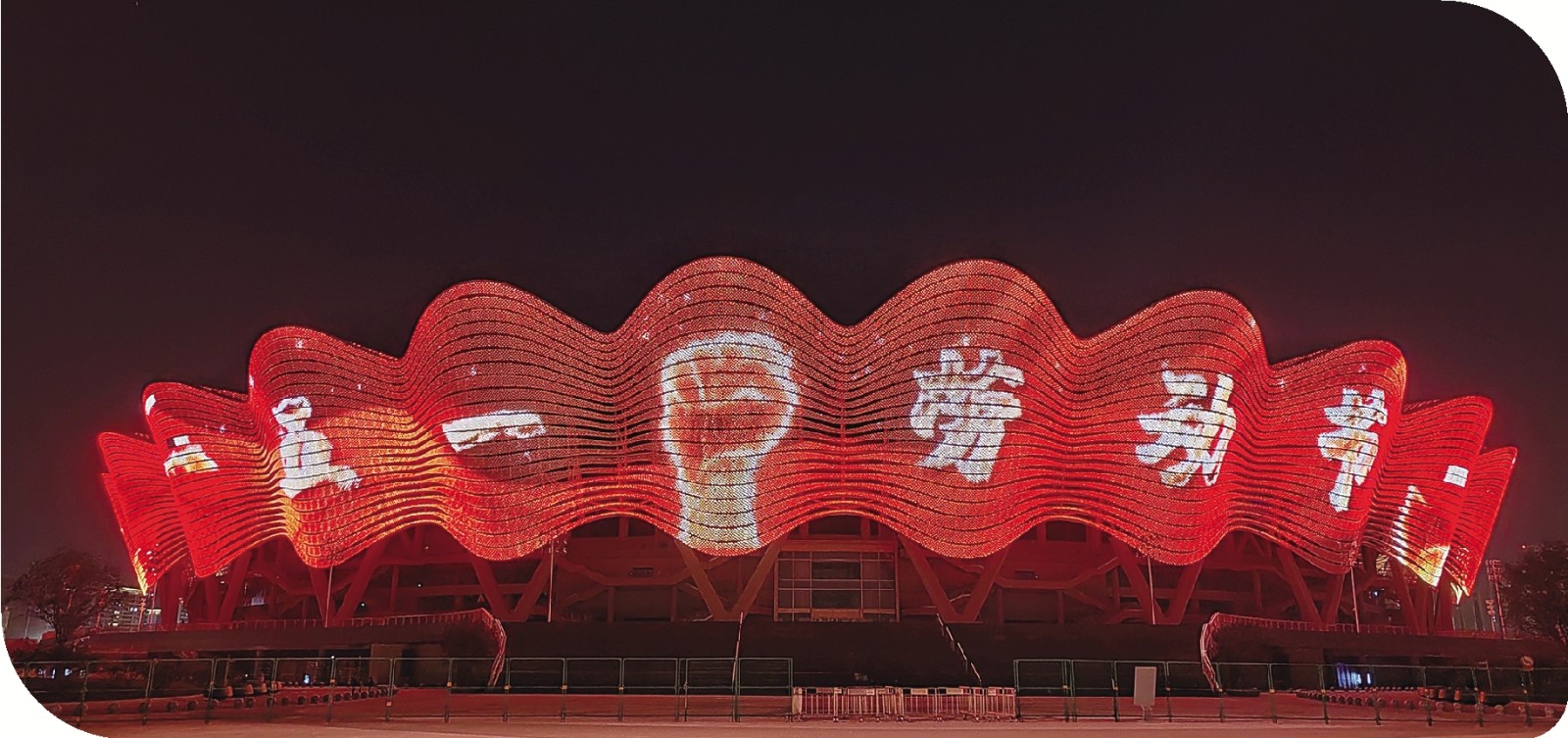 五一前夕,西安市奥体中心亮起灯光,致敬劳动者。(孙雯)