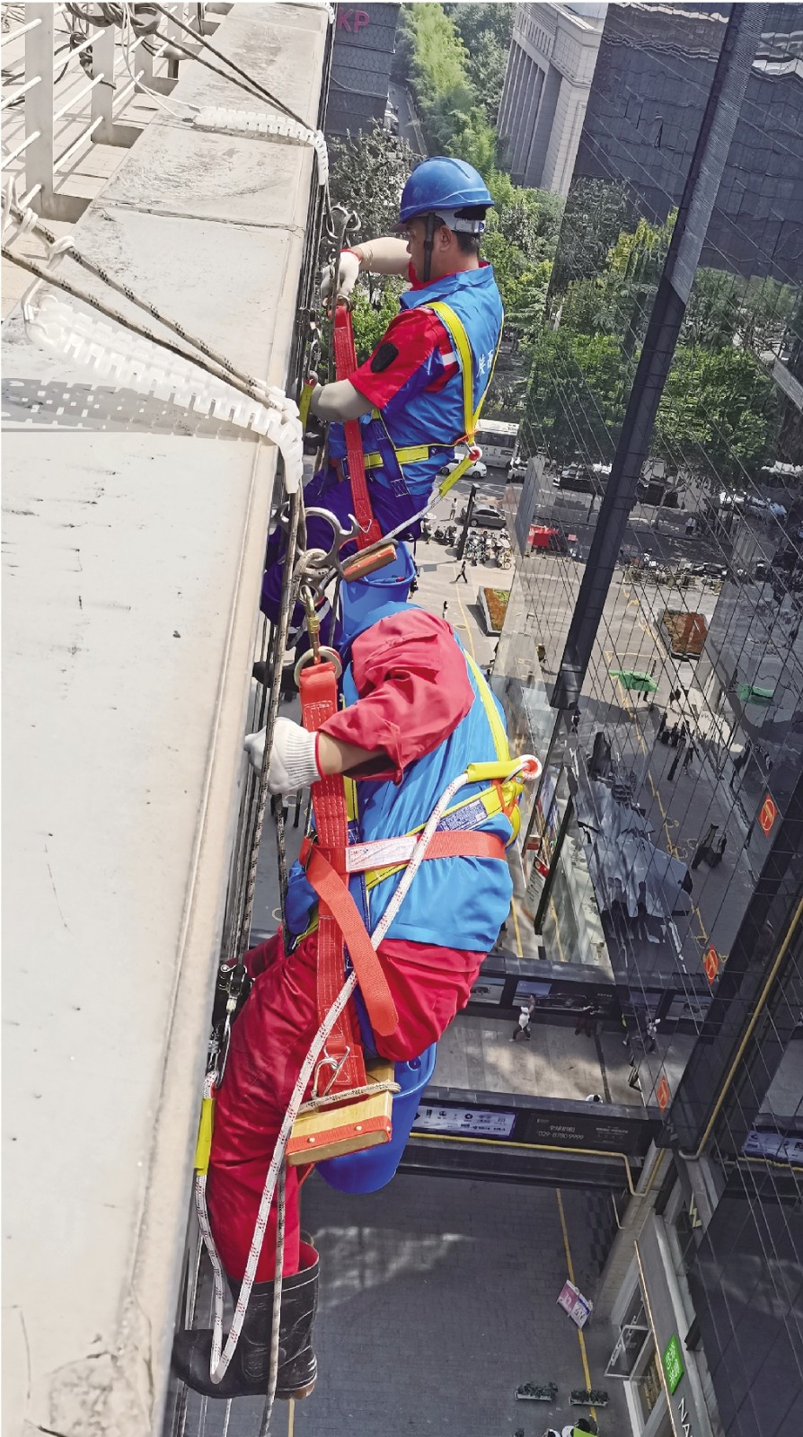 与此同时,位于南门外的长安国际大厦的玻璃外墙上,两名“蜘蛛侠”全副武装,进行擦拭,不一会玻璃外墙就光亮如新;手握清洁工具的参赛选手“左右开弓”,仔细地擦拭着比赛现场的玻璃板道具,短短几分钟便完成了比赛……
