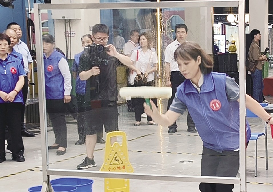 当天,来自全省的168名清洗保洁行业从业者,在西安“大华1935”和长安国际大厦打擂“比武”。竞赛内容包含公共卫生间清洁、高空清洗、玻璃清洁、不锈钢清洁、洗地机操作等。