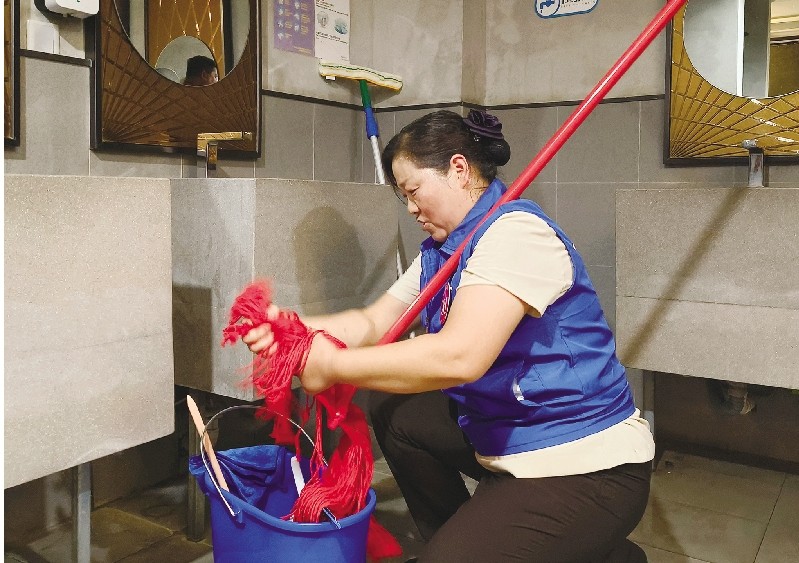 9月7日,西安“大华1935”4号直梯旁边的公共卫生间门前,一间写有“清扫中”提示牌的公共卫生间内,一场清洁“比武”正在进行。81号选手戴上手套,垃圾收集清理、刷洗便器、擦拭开关,收干水渍。短短三分钟,卫生间的里里外外就被打扫得洁净如新,一尘不染。
