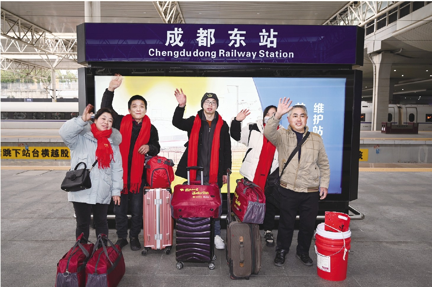 “我们到家啦!”谢正飞一家四口和老乡在成都东站台上合影留念,五个人满脸笑容地朝镜头挥手,带着激动的心情喊出了这句话。