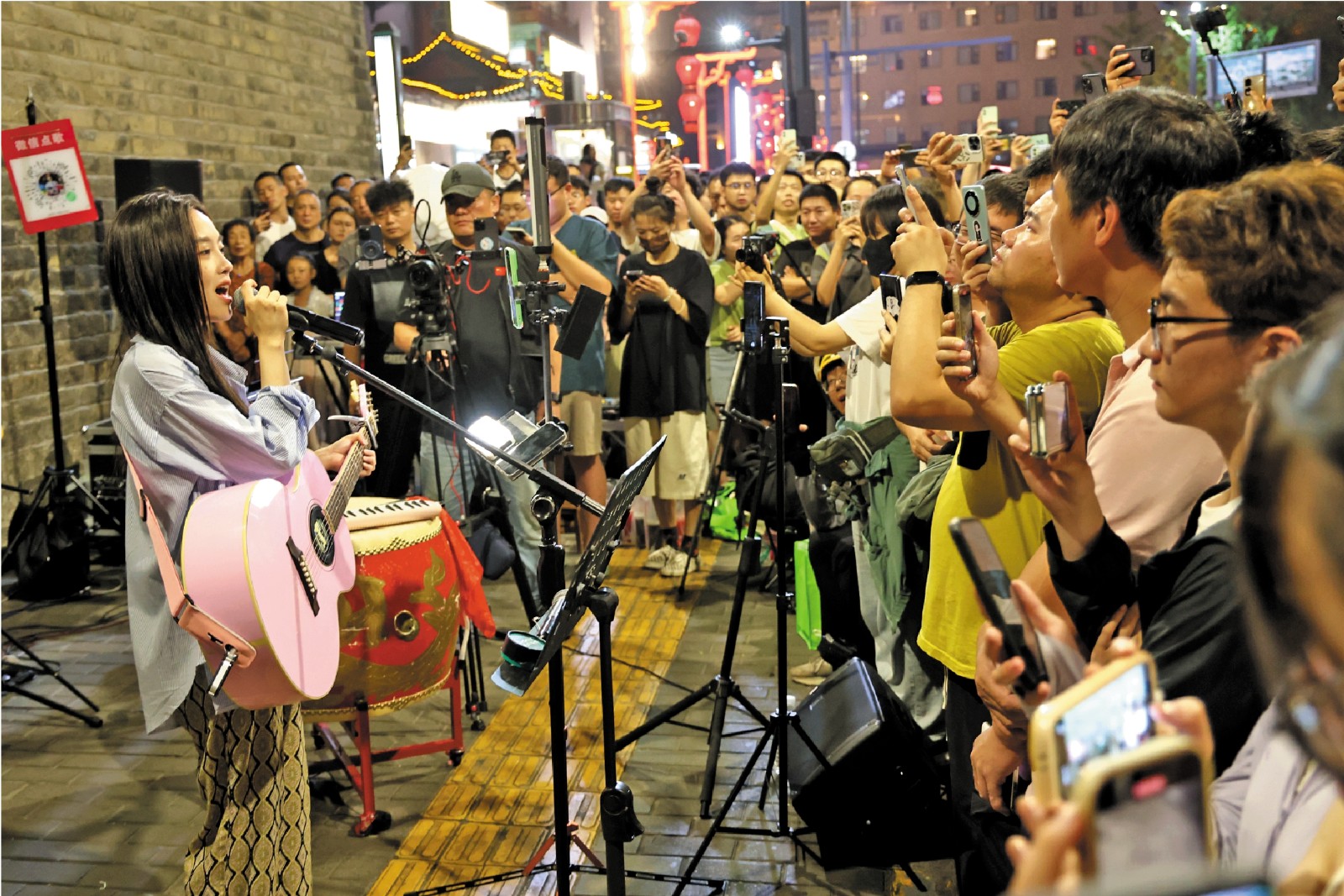 “西安人的城墙下是西安人的火车,西安人不管到哪都不能不吃泡馍。600年的城墙如今让你随便触摸,在西安人的心中这是西安人的歌……”每周一的晚上九点,民间网红歌手韩小九和她的乐队便会如约来到老地方——西安城墙南门城门洞开始演出,提前守候的网友们一下子便将乐队和歌手围了起来。用陕西关中方言演唱的《西安人的歌》几乎是她每晚必唱的曲目。在古城西安,这首歌已是家喻户晓,人人会唱,但对于歌迷们来说,能在城墙下和歌手一起合唱这首陕味十足的歌曲,总是充满激情,百唱不厌。
