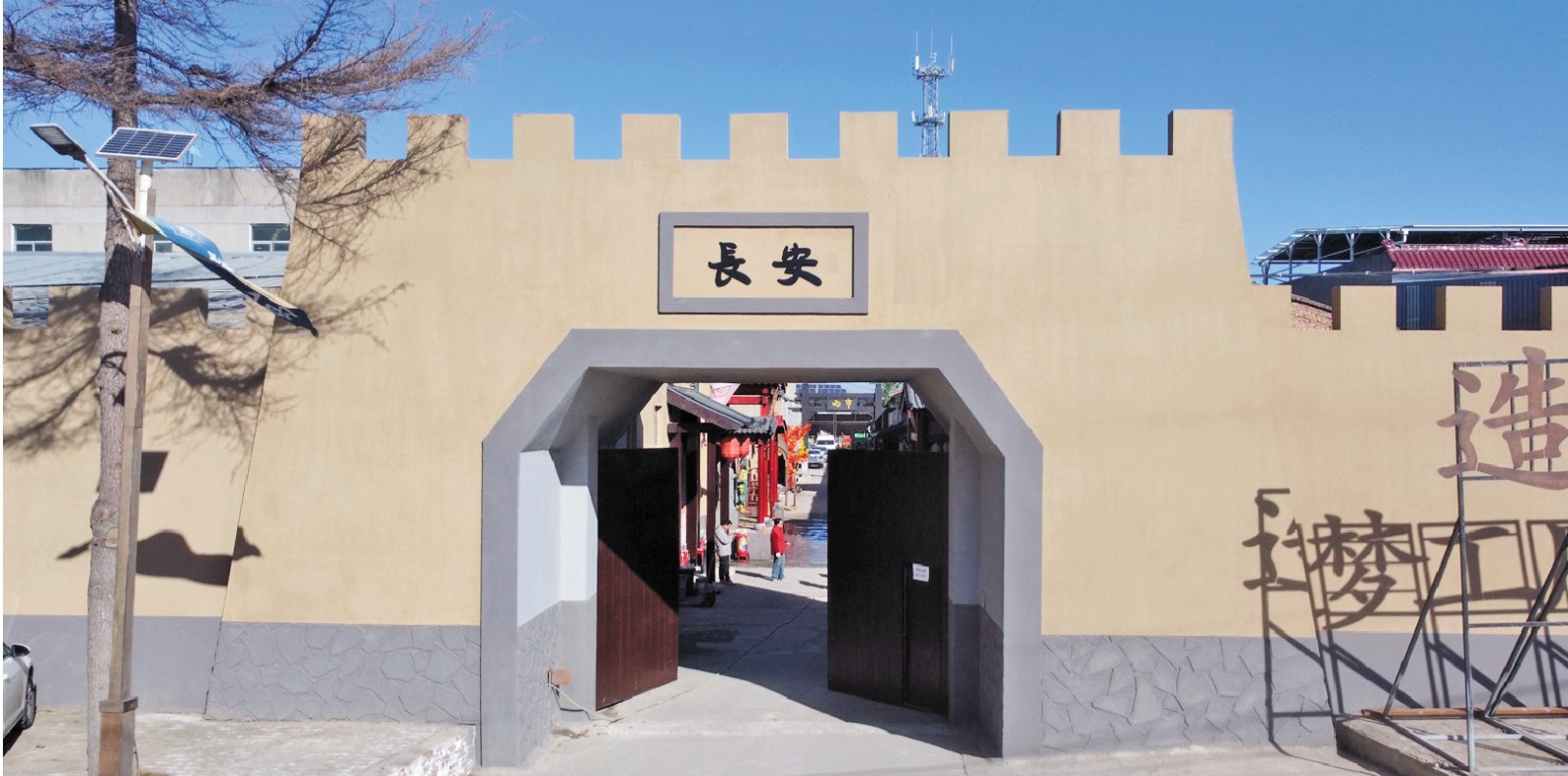 西咸新区沣西新城造梦工厂影视基地于2023年12月开始投资建设。陕西沣镐影工场文化传媒有限公司利用新泥河村的废旧纺纱厂房,进行了整体提升改造。一踏入基地大门,映入眼帘的是一座城墙,上面赫然写着“长安”两个大字。穿过城门,仿佛穿越了时空,两侧错落有致的古代场景让人目不暇接,店铺林立,从售卖腊肠、玉米的小铺到制作布匹的小店,无一不让人感受到市井生活的热闹非凡。