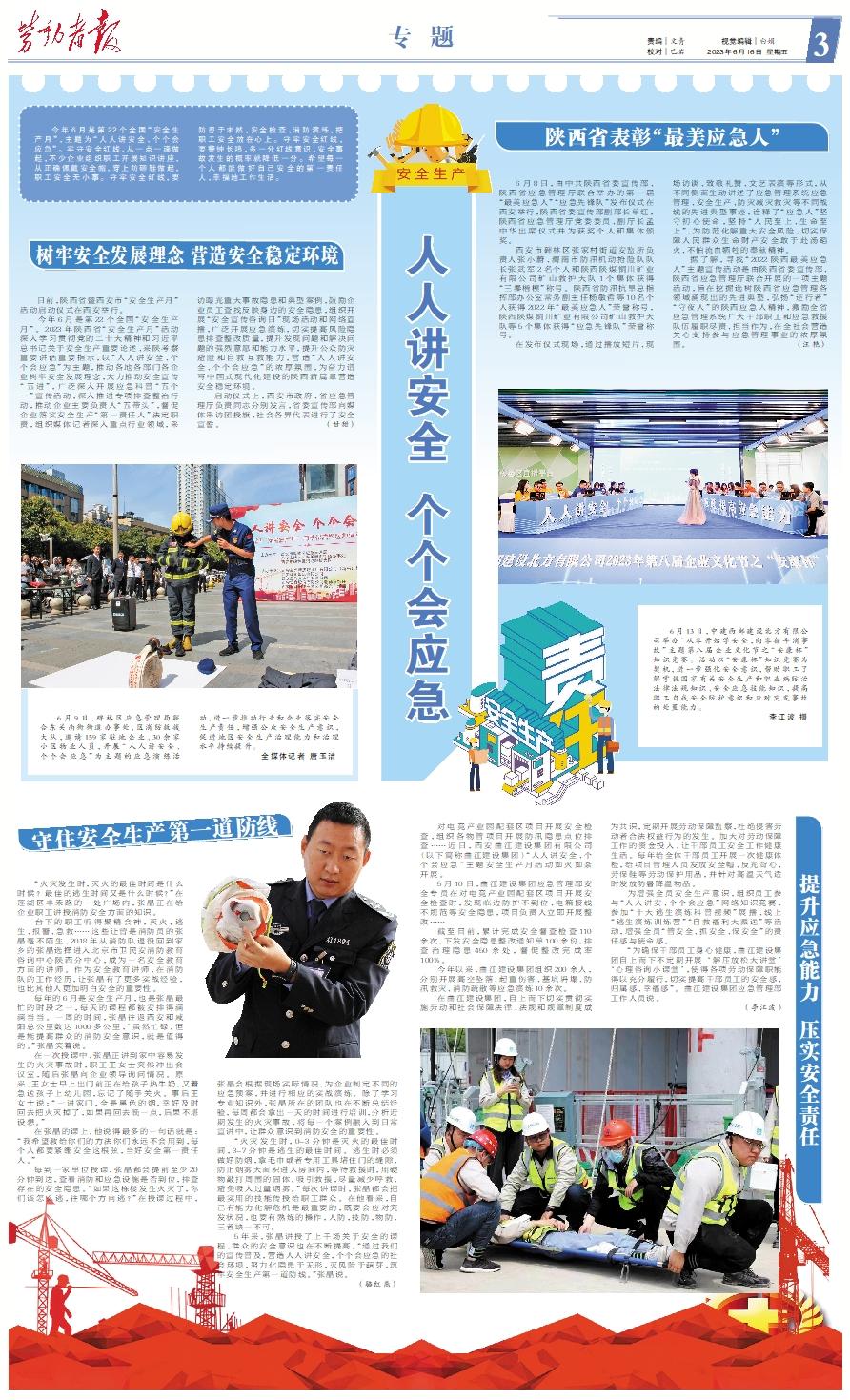今年6月是第22个全国“安全生产月”,主题为“人人讲安全、个个会应急”。牢守安全红线,从一点一滴做起,不少企业组织职工开展知识讲座,从正确佩戴安全帽、穿上防砸鞋做起,职工安全无小事。守牢安全红线,要防患于未然,安全检查、消防演练,把职工安全放在心上。守牢安全红线,要警钟长鸣,多一分红线意识,安全事故发生的概率就降低一分。希望每一个人都能做好自己安全的第一责任人,幸福地工作生活。树牢安全发展理念 营造安全稳定环境 日前,陕西省暨西安市“安全生产月”活动启动仪式在西安举行。 今年6月是第22个全国“安全生产月”。2023年陕西省“安全生产月”活动深入学习贯彻党的二十大精神和习近平总书记关于安全生产重要论述、来陕考察重要讲话重要指示,以“人人讲安全、个个会应急”为主题,推动各地各部门各企业树牢安全发展理念,大力推动安全宣传“五进”,广泛深入开展应急科普“五个一”宣传活动,深入推进专项排查整治行动,推动企业主要负责人“五带头”,督促企业落实安全生产“第一责任人”法定职责,组织媒体记者深入重点行业领域,采访曝光重大事故隐患和典型案例,鼓励企业员工查找反映身边的安全隐患,组织开展“安全宣传咨询日”现场活动和网络直播,广泛开展应急演练,切实提高风险隐患排查整改质量,提升发现问题和解决问题的强烈意愿和能力水平,提升公众防灾避险和自救互救能力,营造“人人讲安全、个个会应急”的浓厚氛围,为奋力谱写中国式现代化建设的陕西新篇章营造安全稳定环境。 启动仪式上,西安市政府、省应急管理厅负责同志分别发言,省委宣传部向媒体采访团授旗,社会各界代表进行了安全宣誓。 (甘甜)陕西省表彰“最美应急人” 6月8日,由中共陕西省委宣传部、陕西省应急管理厅联合举办的第一届“最美应急人”“应急先锋队”发布仪式在西安举行,陕西省委宣传部副部长单红,陕西省应急管理厅党委委员、副厅长孟中华出席仪式并为获奖个人和集体颁奖。 西安市碑林区张家村街道安监所负责人张小蔚、渭南市防汛机动抢险队队长张武军2名个人和陕西陕煤铜川矿业有限公司矿山救护大队1个集体获得“三秦楷模”称号。陕西省防汛抗旱总指挥部办公室常务副主任杨敏哲等10名个人获得2022年“最美应急人”荣誉称号,陕西陕煤铜川矿业有限公司矿山救护大队等5个集体获得“应急先锋队”荣誉称号。 在发布仪式现场,通过播放短片、现场访谈、致敬礼赞、文艺表演等形式,从不同侧面生动讲述了应急管理系统应急管理、安全生产、防灾减灾救灾等不同战线的先进典型事迹,诠释了“应急人”坚守初心使命,坚持“人民至上、生命至上”,为防范化解重大安全风险,切实保障人民群众生命财产安全敢于赴汤蹈火、不怕流血牺牲的奉献精神。 据了解,寻找“2022陕西最美应急人”主题宣传活动是由陕西省委宣传部、陕西省应急管理厅联合开展的一项主题活动,旨在挖掘选树陕西省应急管理各领域涌现出的先进典型,弘扬“逆行者”“守夜人”的陕西应急人精神,激励全省应急管理系统广大干部职工和应急救援队伍履职尽责、担当作为,在全社会营造关心支持参与应急管理事业的浓厚氛围。 (汪艳) 6月9日,碑林区应急管理局联合东关南街街道办事处、区消防救援大队,邀请159家驻地企业、30余家小区物业人员,开展“人人讲安全、个个会应急”为主题的应急演练活动,进一步推动行业和企业落实安全生产责任,增强公众安全生产意识,促进地区安全生产治理能力和治理水平持续提升。 全媒体记者 唐玉洁 6月13日,中建西部建设北方有限公司举办“从零开始学安全,向零奋斗消事故”主题第八届企业文化节之“安康杯”知识竞赛。活动以“安康杯”知识竞赛为契机,进一步强化安全意识,帮助职工了解掌握国家有关安全生产和职业病防治法律法规知识、安全应急技能知识,提高职工自我安全防护意识和应对突发事故的处置能力。 李江波 摄守住安全生产第一道防线 “火灾发生时,灭火的最佳时间是什么时候?最佳的逃生时间又是什么时候?”在莲湖区丰禾路的一处广场内,张晶正在给企业职工讲授消防安全方面的知识。 台下的职工听得聚精会神,灭火、逃生、报警、急救……这些让曾是消防员的张晶毫不陌生,2018年从消防队退役回到家乡的张晶选择进入北京市卫民安消防教育咨询中心陕西分中心,成为一名安全教育方面的讲师。作为安全教育讲师,在消防队的工作经历,让张晶有了更多实战经验,也比其他人更加明白安全的重要性。 每年的6月是安全生产月,也是张晶最忙的时段之一,每天的课程都被安排得满满当当。一周的时间,张晶往返西安和咸阳总公里数达1000多公里,“虽然忙碌,但是能提高群众的消防安全意识,就是值得的。”张晶笑着说。 在一次授课中,张晶正讲到家中容易发生的火灾事故时,职工王女士突然冲出会议室,随后张晶向企业领导询问情况。原来,王女士早上出门前正在给孩子热牛奶,又着急送孩子上幼儿园,忘记了随手关火。事后王女士说:“一进家门,全是黑色的烟,幸好及时回去把火灭掉了,如果再回去晚一点,后果不堪设想。” 在张晶的课上,他说得最多的一句话就是:“我希望教给你们的方法你们永远不会用到,每个人都要紧绷安全这根弦,当好安全第一责任人。