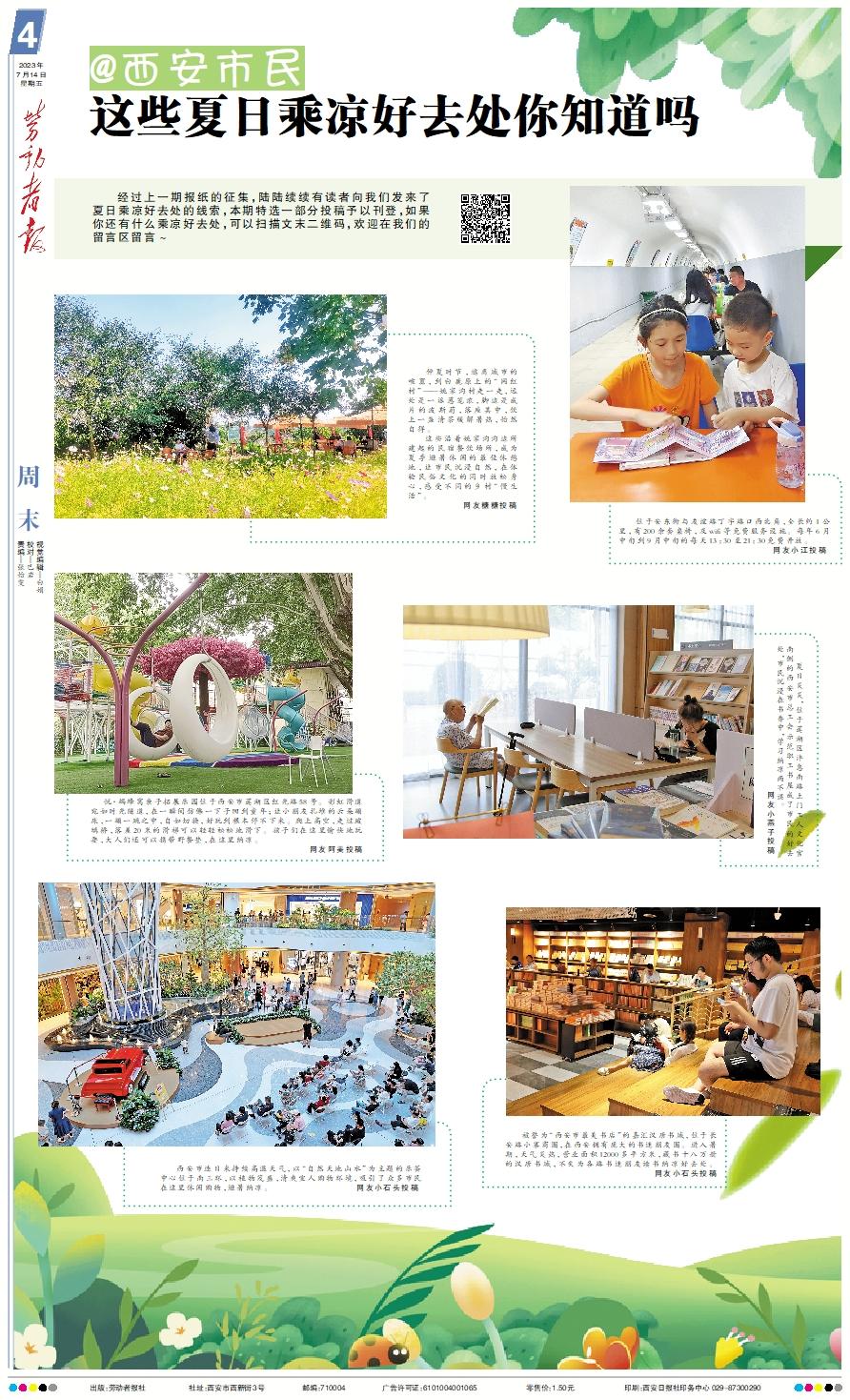 经过上一期报纸的征集,陆陆续续有读者向我们发来了夏日乘凉好去处的线索,本期特选一部分投稿予以刊登,如果你还有什么乘凉好去处,可以扫描文末二维码,欢迎在我们的留言区留言~ 仲夏时节,逃离城市的喧嚣,到白鹿原上的“网红村”——姚家沟村走一走,远处是一派葱茏浓,脚边是成片的波斯菊,落座其中,饮上一盏清茶缓解暑热,怡然自得。 这些沿着姚家沟沟边所建起的民宿餐饮场所,成为夏季避暑休闲的最佳休憩地,让市民沉浸自然,在体验民俗文化的同时放松身心,感受不同的乡村“慢生活”。 网友糖糖投稿 位于安东街与友谊路丁字路口西北角,全长约1公里,有200余套桌椅,及wifi等免费服务设施。每年6月中旬到9月中旬的每天13:30至21:30免费开放。 网友小江投稿 悦·蚂蜂窝亲子拓展乐园位于西安市莲湖区红光路58号。彩虹滑道宛如时光隧道,在一瞬间仿佛一下子回到童年;让小朋友扎堆的云朵蹦床,一蹦一跳之中,自如切换,好玩到根本停不下来。爬上高空,走过玻璃桥,落差20米的滑梯可以轻轻松松地滑下。孩子们在这里愉快地玩耍,大人们还可以携带野餐垫,在这里纳凉。 网友阿美投稿 夏日炎炎,位于莲湖区沣惠南路土门工人文化宫南侧的西安市总工会示范职工书屋成了市民的好去处,市民沉浸在书香中,学习纳凉两不误。 网友小燕子投稿 西安市连日来持续高温天气,以“自然天地山水”为主题的乐荟中心位于南三环,以植物茂盛,清爽宜人购物环境,吸引了众多市民在这里休闲购物,避暑纳凉。 网友小石头投稿 被誉为“西安市最美书店”的嘉汇汉唐书城,位于长安路小寨商圈,在西安拥有庞大的书迷朋友圈。进入暑期,天气炎热,营业面积12000多平方米,藏书十八万册的汉唐书城,不失为各路书迷朋友读书纳凉好去处。 网友小石头投稿