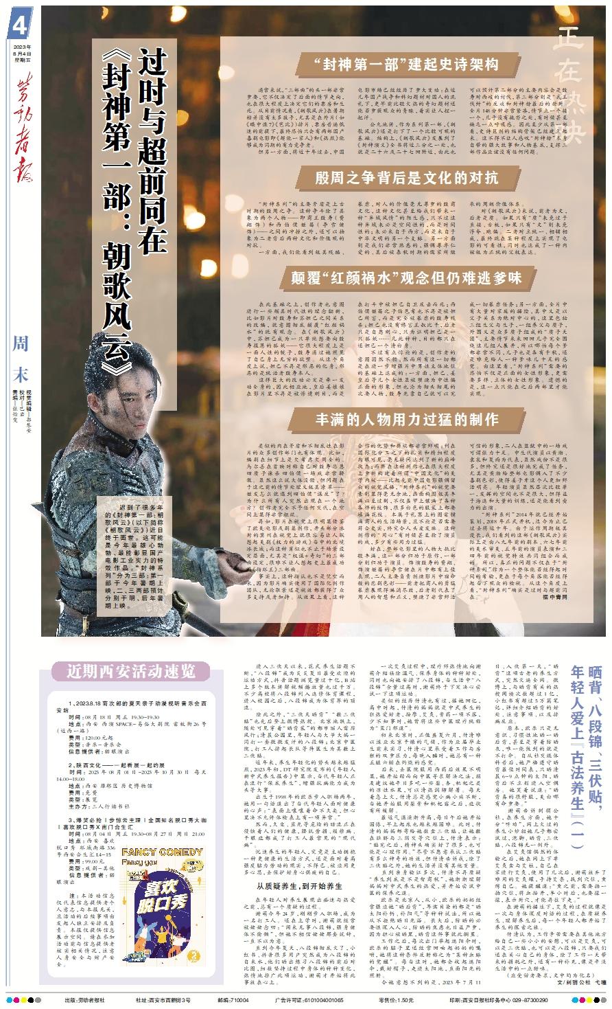 “封神第一部”建起史诗架构 通常来说,“三部曲”的头一部非常重要,它不仅决定了后面的情节走向,也在很大程度上决定它们的票房和生死。从目前情况看,《朝歌风云》在暑期档并没有太多敌手,尤其是在外片(如《碟中谍7》《芭比》)排片、票房普遍低迷的前提下,最终恐怕只会有两部国产喜剧电影即《超能一家人》和《热烈》能够成为同期的有力竞争者。 但另一方面,将近十年过去,中国电影市场已经经历了重大变动:在近几年国产战争和科幻题材对国人的洗礼下,更早前比较火热的奇幻题材还能否重获观众的青睐,着实让人捏一把汗。 公允地讲,作为系列第一部,《朝歌风云》还是打下了一个比较可观的基础。结构上,《朝歌风云》发展到了《封神演义》全书将近三分之一处,也就是二十六或二十七回附近,由此也可以预计第二部分的主要内容会是殷寿对西岐的讨伐,第三部分则是“武王伐纣”的反攻和封神榜最后的册封。全片148分钟非常紧凑,情节点一个接一个,几乎没有拖沓之处,有时候甚至缺乏一点呼吸感。因此至少从第一部看,史诗巨制的结构骨架已经建立起来。这不得不让人感叹“封神榜”本身自带的强大故事和人物基底,支撑三部作品应该没有任何问题。殷周之争背后是文化的对抗 “封神系列”的主要矛盾是上古时期的殷周之争。这种争斗除了具象为两个人物——即商王殷寿(费翔饰)和西伯侯姬昌(李雪健饰)——之间的冲撞之外,还可以抽象为二者背后两种文化和价值观的对抗。 一方面,我们能看到极其残酷、暴虐,对人的价值毫无尊重的殷商文化,这种文化甚至给我们带来一种“异域风情”的陌生感,只不过这种异域未必是空间性的,而是时间性的;未必来自于西方,而是来自于中华文明的另一个支脉。另一方面则是我们非常熟悉的,强调尊卑仁爱的、其后被春秋时期的儒家所继承的周朝价值体系。 对《朝歌风云》来说,前者为文,后者是质。如果只有“质”未免过于直接、古板,如果只有“文”则未免浮夸、跑偏。二者对立统一、相辅相成,最终既在某种程度上实现了电影的可看性,同时也达成了一种内核极为正统的父权表达。颠覆“红颜祸水”观念但仍难逃爹味 在此基础之上,创作者也意图进行一些颇具时代性的理念翻新,比如影片对殷寿和苏妲己之间关系的改编,就意图彻底颠覆“红颜祸水”的既有观念。在《朝歌风云》中,苏妲己成为一只单纯想要向殷寿报恩的狐妖——它很大程度上是一面人性的镜子,殷寿通过她照见了自己身上无穷的欲望。从这个角度上说,妲己不再是邪恶的化身,邪恶的是统治者殷寿本人。 这样巨大的改动必定是牵一发动全身的,因此相应地,皇后姜娘娘在影片里不再是被惨遭剜目,而是在打斗中被妲己自卫反击而死;西伯侯姬昌之子伯邑考也不再是被妲己所害,而是完全被暴虐的殷寿残杀;妲己也没有谗害王叔比干,后者只是自愿剜心,只为证明妲己是一只狐妖……凡此种种,目的都只在还妲己一个清白身。 不过有点悖论的是,创作者的意图固然不错,然而所有这一切都是在进一步增强片中男性主体地位的基础上达成的:一方面,妲己、姜皇后等几个女性虽被塑造为中性偏正面的形象,但也沦为彻头彻尾的次要人物,殷寿光靠自己就可以完成一切暴虐任务;另一方面,全片中有大量对家庭的描绘,其中又是以父子关系为绝对中心的,这里包括三组生父与生子,一组养父与质子,外围又是众多质子组成的“质子天团”,主要情节来来回回几乎完全围绕这几组人展开,所以哪怕每个爹都非常不同,儿子也是各有千秋,还是难免给人一种爹味儿十足的感觉。由这里看,“封神系列”需要的恐怕不仅是正面的女性形象,更需要多样、立体的女性形象。遗憾的是,这一点只能在之后两部里才能实现。丰满的人物用力过猛的制作 类似的内在矛盾和不彻底性在影片的众多创作部门也有体现。比如,编剧在细节上是欠考虑欠周全的。乌尔善在首映时称自己对殷寿怂恿四质子诛杀四伯侯一场戏非常骄傲。虽然这么说大体没错,但问题在于这之前的情节处理又极其潦草——姬发怎么就遇到四伯侯“谋反”了?为什么所有人突然出现在一个地方?创作者完全不予任何交代,在空间上显得非常粗疏。 再如,影片在视觉上很明显借鉴了欧美电影或剧集制作,开头部分冰封的冀州在视觉上就很容易让人联想起美剧《权力的游戏》当中的北境冰长城;而这种肖似也不止于场景设定层面,尤其是“权谋+奇幻”的三部曲设定,很难不让人想起史上最成功的《指环王》三部曲。 事实上,这种指认也不是凭空而来,因为影片确实使用了国际化制作团队,无论取景还是视效都获得了众多支持或者加持。从效果上看,这种合作的优势和弊端都非常鲜明:利在国际化分工之下的扎实和精细程度肉眼可见,毫无疑问达到了新的巅峰状态;而弊在这种制作也在很大程度上重新构建着所谓“中国文化”的美学内核——比起先前中国电影强调留白的视觉风格,“封神系列”的视觉要素则显得毫无余地,画面构图极其丰满以至过剩,不仅盔甲上镶满了各种各样的纹饰,很多白色的服装上都要填满花纹。本属于礼器上的图案铺满商人的生活场景,且不论是否需要符合史实,终究令人头皮发麻。这种制作的“用心”有时候甚至抢了演员的戏,多少有些用力过猛。 好在,整部电影里的人物大