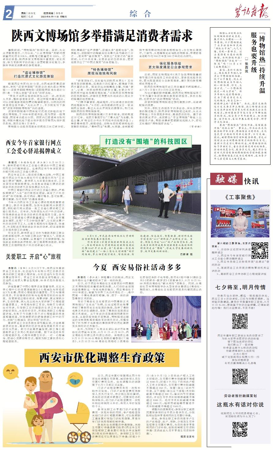 《工事聚焦》 第六期的工事聚焦,主要内容是: 1、劳动争议巡回审判法庭揭牌成立 2、西安市今年首家银行网点工会爱心驿站揭牌成立 3、西安市各级工会持续开展“送清凉”慰问活动 4、莲湖区总工会开展劳模故事进机关宣讲活动 5、高新区总工会举办职工心理健康讲座七夕将至,明月传情 你是否也在期待,邂逅一场浪漫的奔赴,西安工会x劳动者报,已经为你搭好鹊桥。这封爱的邀请函,请各位单身青年职工查收,8月11日15:00,领取属于你的恋爱锦囊,记得如期赴约哦!我们在直播间,不见不散!西安市青年职工联谊交友活动要来了为给大家带来更好的活动体验留下更加美好的回忆我们推出了一套问卷你希望这是什么样的活动呢你最想得到什么收获呢点击小程序或下划至底部长按图片扫一扫参加问卷调查有机会赢得精美小礼品哦劳动者报社融媒策划这瓶水有话对你说收到陌生人写的纸条和爱心水,面部彩绘师为什么哭了?