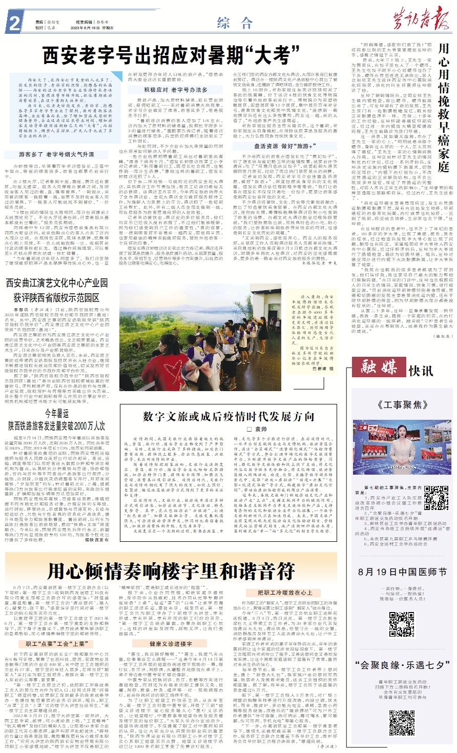 8月7日,西安高新区第一楼宇工会联合会(以下简称:第一楼宇工会)收到陕西友谊建工科技有限公司党支部和工会联合写的感谢信:“时值盛夏,高温酷暑,第一楼宇工会的‘清凉慰问’,暖人心,凝聚力,鼓干劲。”感谢信字里行间对第一楼宇工会的贴心服务表示肯定。 以党建带工建的第一楼宇工会成立于2021年6月。第一楼宇工会在第一楼宇党委的支持和指导下,沉下身子注重实干,想方设法聚焦解决职工的急难愁盼,用心倾情奏响楼宇里的和谐音符。 职工“点菜”工会“上菜” 位于西安高新区的新长安广场和摩尔中心共有6栋写字楼,聚集了包括科技、建筑、家政物业及金融等门类的企业近400家,其中建立工会组织的企业有27家。楼宇里的年轻人居多,怎样当好“娘家人”实打实为职工服好务,是摆在第一楼宇工会人面前的头等事、紧要事。 “第一楼宇工会建立之初,就把职工所需就是工会人的努力方向作为切入口,拉网式开展‘问需职工’调查问卷,结果职工反映最多的诉求就是举办一些提技能增素质的业务培训班,随后,职工‘点菜’工会‘上菜’式的楼宇大讲堂应运而生。”第一楼宇工会主席惠超良说。 2022年3月31日,楼宇大讲堂第一期开讲。大国工匠李莉、郝铎、何小虎轮番上场,“工匠精神”“航天精神”及他们的精彩人生,让现场50余家企业的职工代表心潮澎湃,掌声叫好声此起彼伏。“榜样的力量让我备受鼓舞,激励着我更有信心做好本职工作。”听完大讲堂的陕西新长安物业管理有限公司职工小张感慨地说,“楼宇大讲堂不仅是职工的‘精神家园’,更是职工成长进步的‘摇篮’”。 接下来,企业合同管理、和谐家庭幸福相伴、反诈防诈从我做起、技术合同认定等专题讲座轮番“上桌”,每道“菜”的“口味”让求学若渴的职工津津乐道,意犹未尽。截至目前,第一楼宇工会共为职工举办了7期楼宇大讲堂,学有所成、学有所获、学有所用的职工们纷纷表示,“第一楼宇工会说话算数,办事办到职工心坎上,这样的讲座如及时雨,润物无声,让我们受益匪浅。”健康义诊进楼宇 “医生,我肩膀好酸啊。”“医生,我湿气有点重,您看看该怎么调理……”这是今年4月14日第一楼宇工会开展的健康咨询进楼宇现场的一幕,理疗仪、血压计、刮痧油、火罐整齐地摆放在桌子上,桌子旁边是中医专家忙碌的身影。 中医专家从把脉问诊、血压、血糖等方面进行基础检查,同时还为有需求的职工提供艾灸、拔罐、刮痧、推拿、针灸、超声等一对一现场调理治疗,前来咨询问诊的职工络绎不绝。 为了让职工健康工作快乐生活,从去年至今,第一楼宇工会特邀中医专家,开展了三期“健康义诊进楼宇 爱心服务暖人心”医疗义诊活动。让健康理疗、中医推拿等健康咨询及服务惠及楼宇里的每位职工。“大家久坐办公室运动少,健康咨询进楼宇,不仅提高了职工对中医药知识的认识,也让大家充分认识预防职业病的重要性。”陕西华泽实业有限公司职工小李对楼宇工会心系职工健康表示点赞。健康义诊进楼宇活动已让1000余名职工享受了免费诊疗服务。把职工冷暖放在心上 作为职工的“娘家人”,楼宇工会时刻把职工的冷暖放在心上,真情实意让职工感到“ 娘家人”就在身边。 今年“三八”节,第一楼宇工会给女职工送鲜花送祝福。8月3日,烈日炎炎。第一楼宇工会副主席杜九义带领工会工作者,为20余家企业代表发放清凉大礼包、清凉饮品,给坚守在一线的交警、消防指战员及环卫工人送去清凉大礼包,让户外工作者感到丝丝清凉。 家政工作者老刘的妻子常年卧病在床,常年的求医问药让这个家庭的经济状况每况愈下。第一楼宇工会随即向老刘伸出了援手,又是送慰问金又是给发米面油,让这个困难家庭感到了温暖有了依靠,重拾对未来生活的信心。 每年春节前,第一楼宇工会工作者带上慰问金,提上 “新春大礼包”,挨家挨户走访慰问军烈属、独居老人及困难老党员,送去工会组织的关怀和温暖。据了解,两年来,楼宇工会用于送温暖的资金超过5万元。 眼下,第一楼宇工会投入3万余元,对广场上闲置的核酸采样亭进行升级改造,内设空调、饮水机、雨伞、微波炉、多功能充电宝、桌椅、急救小药箱等服务设施,改造后的“暖新驿站”可为户外工作者提供“冷可取暖、热可纳凉、渴可喝水、累可歇脚、伤可用药、手机充电”等暖心服务。 “下一步,在高新区总工会和第一楼宇党委领导下,继续扎实做细做实第一楼宇工会联合会工作,服务好工会联合会覆盖下各单位工会,维护好各会员单位职工合理合法诉求。”惠超良说。 (李江波)