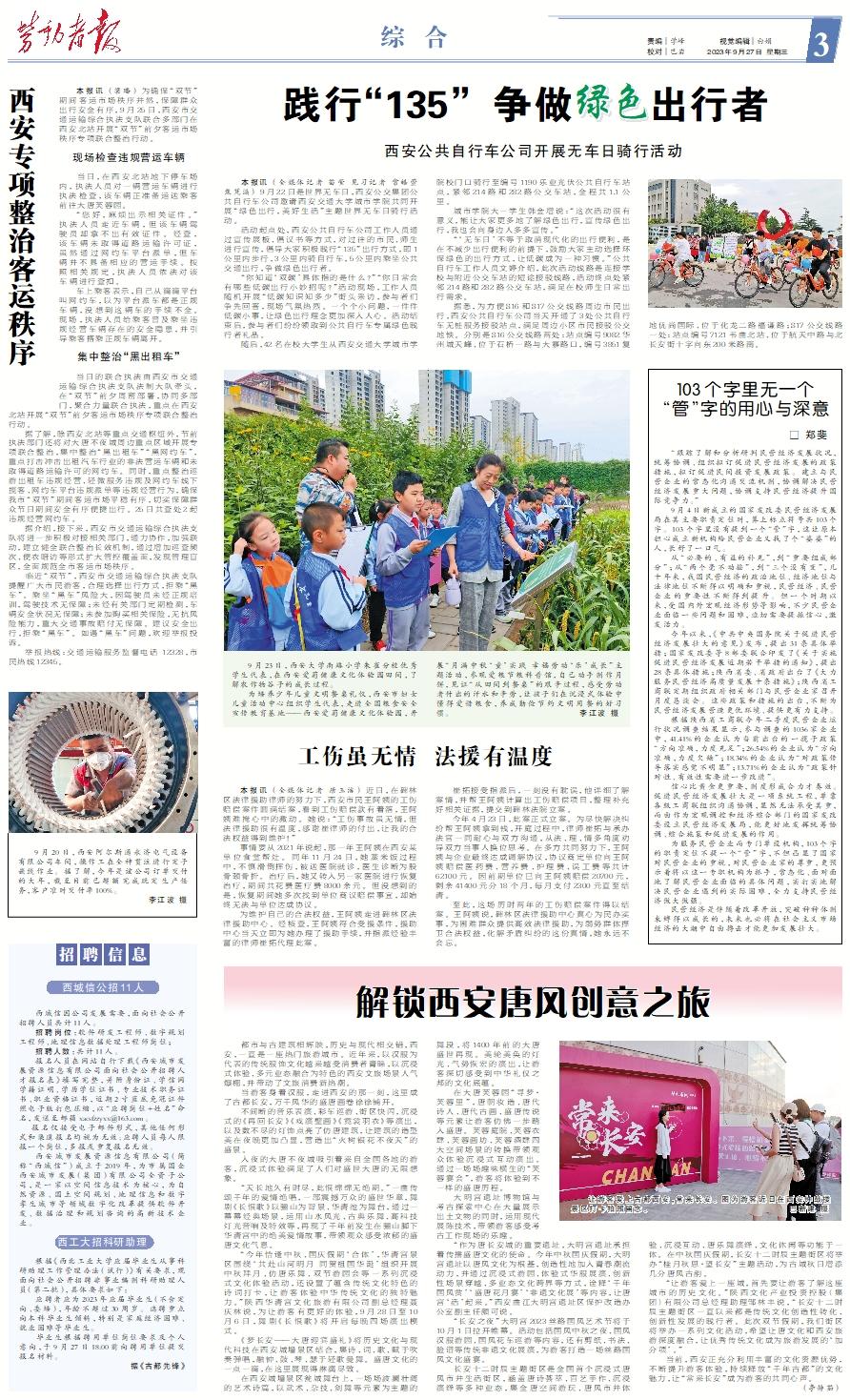 本报讯 (全媒体记者 苗莹 见习记者 常皓萱 焦芃滈) 9月22日是世界无车日,西安公交集团公共自行车公司邀请西安交通大学城市学院共同开展“绿色出行,美好生活”主题世界无车日骑行活动。 活动起点处,西安公共自行车公司工作人员通过宣传展板、倡议书等方式,对过往的市民、师生进行宣传,倡导大家积极践行“135”出行方式,即1公里内步行,3公里内骑自行车,5公里内乘坐公共交通出行,争做绿色出行者。 “你知道‘双碳’具体指的是什么?”“你日常会有哪些低碳出行小妙招呢?”活动现场,工作人员随机开展“低碳知识知多少”街头采访,参与者们争先回答,现场气氛热烈。一个个小问题,一件件低碳小事,让绿色出行理念更加深入人心。活动结束后,参与者们纷纷领取到公共自行车专属绿色践行者礼品。 随后,42名在校大学生从西安交通大学城市学院校门口骑行至编号1190乐业光伏公共自行车站点,紧邻214路和282路公交车站,全程共1.1公里。 城市学院大一学生韩金增说:“这次活动很有意义,能让大家更多地了解绿色出行,宣传绿色出行,我也会向身边人多多宣传。” “‘无车日’不等于取消现代化的出行便利,是在不减少出行便利的前提下,鼓励大家主动选择环保绿色的出行方式,让低碳成为一种习惯。”公共自行车工作人员文婷介绍,此次活动线路是连接学校与附近公交车站的短途接驳线路,活动终点处紧邻214路和282路公交车站,满足在校师生日常出行需求。 据悉,为方便S16和S17公交线路周边市民出行,西安公共自行车公司当天开通了3处公共自行车无桩服务接驳站点,满足周边小区市民接驳公交地铁。分别是S16公交线路两处:站点编号9082华州城天峰、位于石桥一路与大寨路口,编号3851复地优尚国际、位于化龙二路福谦路;S17公交线路一处:站点编号7121韦曲北站、位于航天中路与北长安街十字向东200米路南。