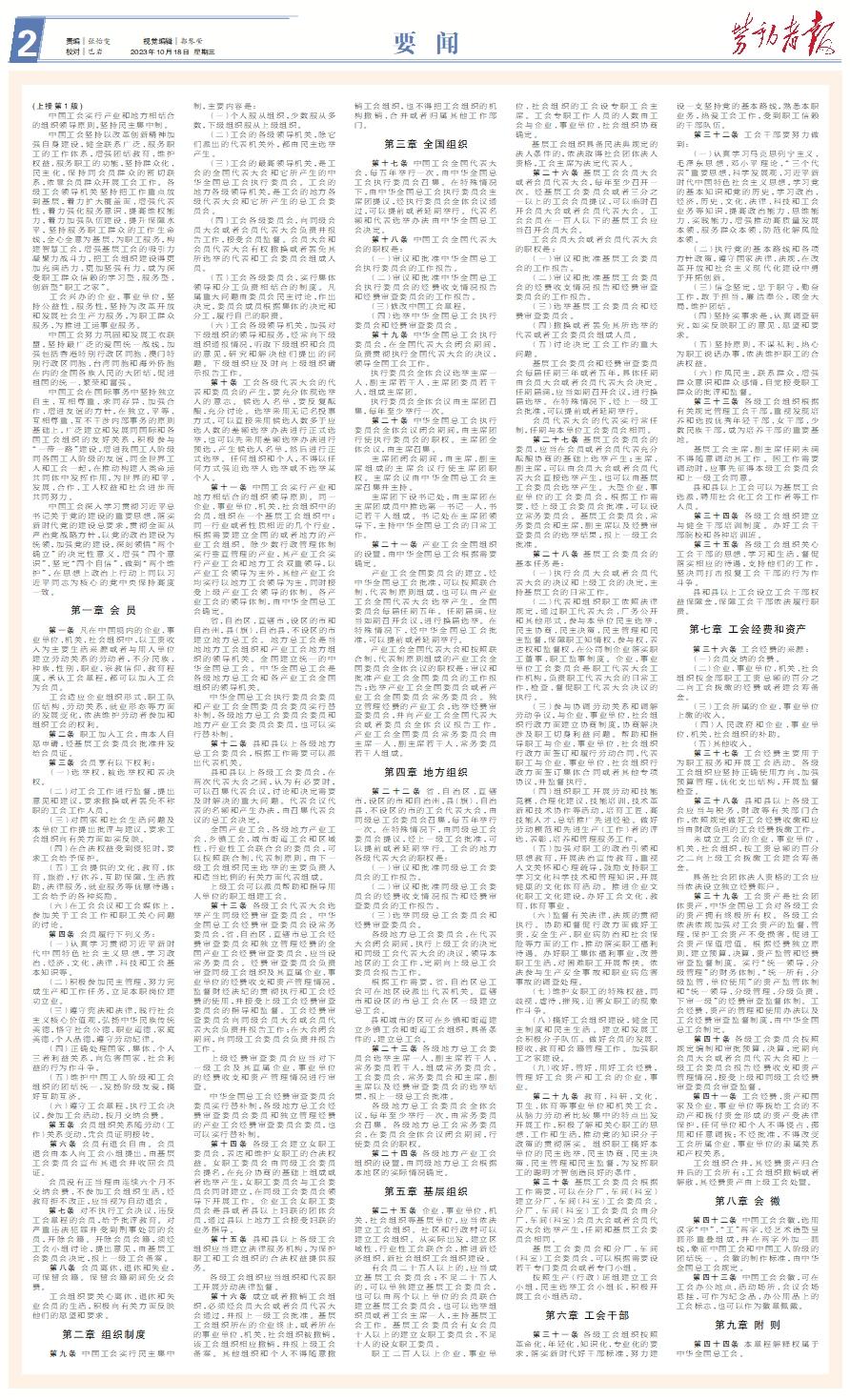 (上接第1版) 中国工会实行产业和地方相结合的组织领导原则,坚持民主集中制。 中国工会坚持以改革创新精神加强自身建设,健全联系广泛、服务职工的工作体系,增强团结教育、维护权益、服务职工的功能,坚持群众化、民主化,保持同会员群众的密切联系,依靠会员群众开展工会工作。各级工会领导机关坚持把工作重点放到基层,着力扩大覆盖面、增强代表性,着力强化服务意识、提高维权能力,着力加强队伍建设、提升保障水平,坚持服务职工群众的工作生命线,全心全意为基层、为职工服务,构建智慧工会,增强基层工会的吸引力凝聚力战斗力,把工会组织建设得更加充满活力、更加坚强有力,成为深受职工群众信赖的学习型、服务型、创新型“职工之家”。 工会兴办的企业、事业单位,坚持公益性、服务性,坚持为改革开放和发展社会生产力服务,为职工群众服务,为推进工运事业服务。 中国工会努力巩固和发展工农联盟,坚持最广泛的爱国统一战线,加强包括香港特别行政区同胞、澳门特别行政区同胞、台湾同胞和海外侨胞在内的全国各族人民的大团结,促进祖国的统一、繁荣和富强。 中国工会在国际事务中坚持独立自主、互相尊重、求同存异、加强合作、增进友谊的方针,在独立、平等、互相尊重、互不干涉内部事务的原则基础上,广泛建立和发展同国际和各国工会组织的友好关系,积极参与“一带一路”建设,增进我国工人阶级同各国工人阶级的友谊,同全世界工人和工会一起,在推动构建人类命运共同体中发挥作用,为世界的和平、发展、合作、工人权益和社会进步而共同努力。 中国工会深入学习贯彻习近平总书记关于党的建设的重要思想,落实新时代党的建设总要求,贯彻全面从严治党战略方针,以党的政治建设为统领,加强党的建设,深刻领悟“两个确立”的决定性意义,增强“四个意识”、坚定“四个自信”、做到“两个维护”,在思想上政治上行动上同以习近平同志为核心的党中央保持高度一致。第一章 会 员 第一条 凡在中国境内的企业、事业单位、机关、社会组织中,以工资收入为主要生活来源或者与用人单位建立劳动关系的劳动者,不分民族、种族、性别、职业、宗教信仰、教育程度,承认工会章程,都可以加入工会为会员。 工会适应企业组织形式、职工队伍结构、劳动关系、就业形态等方面的发展变化,依法维护劳动者参加和组织工会的权利。 第二条 职工加入工会,由本人自愿申请,经基层工会委员会批准并发给会员证。 第三条 会员享有以下权利: (一)选举权、被选举权和表决权。 (二)对工会工作进行监督,提出意见和建议,要求撤换或者罢免不称职的工会工作人员。 (三)对国家和社会生活问题及本单位工作提出批评与建议,要求工会组织向有关方面如实反映。 (四)在合法权益受到侵犯时,要求工会给予保护。 (五)工会提供的文化、教育、体育、旅游、疗休养、互助保障、生活救助、法律服务、就业服务等优惠待遇;工会给予的各种奖励。 (六)在工会会议和工会媒体上,参加关于工会工作和职工关心问题的讨论。 第四条 会员履行下列义务: (一)认真学习贯彻习近平新时代中国特色社会主义思想,学习政治、经济、文化、法律、科技和工会基本知识等。 (二)积极参加民主管理,努力完成生产和工作任务,立足本职岗位建功立业。 (三)遵守宪法和法律,践行社会主义核心价值观,弘扬中华民族传统美德,恪守社会公德、职业道德、家庭美德、个人品德,遵守劳动纪律。 (四)正确处理国家、集体、个人三者利益关系,向危害国家、社会利益的行为作斗争。 (五)维护中国工人阶级和工会组织的团结统一,发扬阶级友爱,搞好互助互济。 (六)遵守工会章程,执行工会决议,参加工会活动,按月交纳会费。 第五条 会员组织关系随劳动(工作)关系变动,凭会员证明接转。 第六条 会员有退会自由。会员退会由本人向工会小组提出,由基层工会委员会宣布其退会并收回会员证。 会员没有正当理由连续六个月不交纳会费、不参加工会组织生活,经教育拒不改正,应当视为自动退会。 第七条 对不执行工会决议、违反工会章程的会员,给予批评教育。对严重违法犯罪并受到刑事处罚的会员,开除会籍。开除会员会籍,须经工会小组讨论,提出意见,由基层工会委员会决定,报上一级工会备案。 第八条 会员离休、退休和失业,可保留会籍。保留会籍期间免交会费。 工会组织要关心离休、退休和失业会员的生活,积极向有关方面反映他们的愿望和要求。第二章 组织制度 第九条 中国工会实行民主集中制,主要内容是: (一)个人服从组织,少数服从多数,下级组织服从上级组织。 (二)工会的各级领导机关,除它们派出的代表机关外,都由民主选举产生。 (三)工会的最高领导机关,是工会的全国代表大会和它所产生的中华全国总工会执行委员会。工会的地方各级领导机关,是工会的地方各级代表大会和它所产生的总工会委员会。 (四)工会各级委员会,向同级会员大会或者会员代表大会负责并报告工作,接受会员监督。会员大会和会员代表大会有权撤换或者罢免其所选举的代表和工会委员会组成人员。 (五)工会各级委员会,实行集体领导和分工负责相结合的制度。凡属重大问题由委员会民主讨论,作出决定,委员会成员根据集体的决定和分工,履行自己的职责。 (六)工
