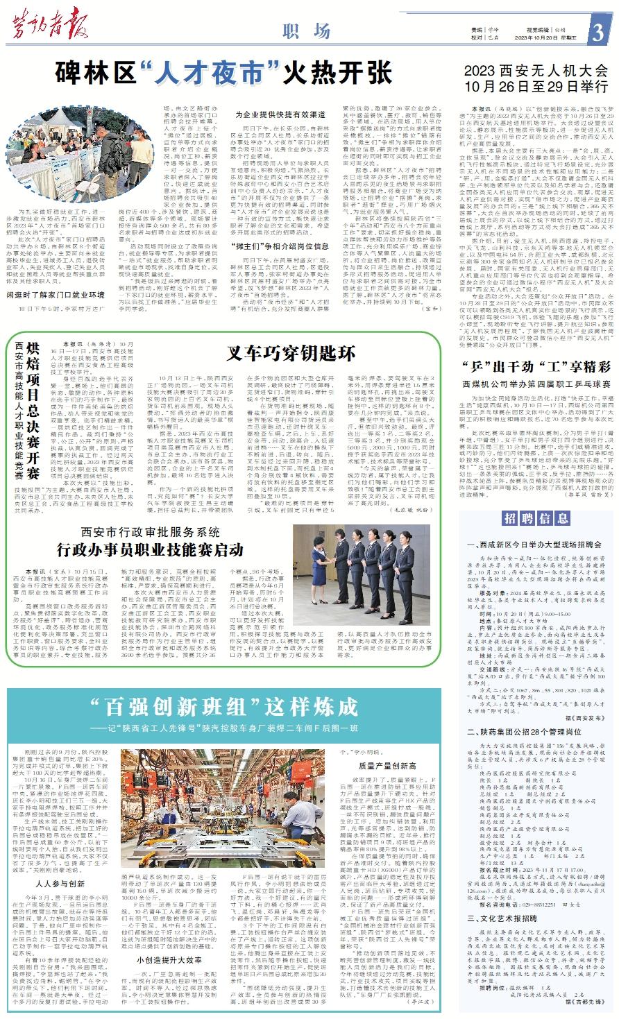 一、西咸新区今日举办大型现场招聘会 为加快西安-咸阳一体化进程,统筹创新资源开放共享,为用人企业和高校毕业生搭建桥梁,10月20日,西安-咸阳一体化共享人才市场2023年高校毕业生大型现场招聘会将在西咸新区举办。 服务对象:2024届高校毕业生、往届未就业高校毕业生、各类专业技术人才、有招聘需求的各类用人单位。 时间:10月20日(周五)9:00-15:00 地点:秦创原人才大市场 内容:预计组织100家西安、咸阳两地重点行业、重点产业优质企业参会,面向高校毕业生及各类求职者提供招聘岗位。现场设立“直播带岗”、政策咨询、就业指导、简历诊断等服务专区。 地址:西咸新区金湾科创区一期金湾三路秦创原人才大市场 交通路线:方式一:西安地铁16号线“西咸大厦”站A/D口出,步行至“西咸大厦”楼宇西侧100米即到。 方式二:公交1067、866、55、801、820、1021路在“西咸大厦”站下车即到。 方式三:自驾导航“西咸大厦”或“秦创原人才大市场”即可到达。 据《西安发布》二、陕药集团公招28个管理岗位 为大力实施陕药控股集团“156”发展战略,推动各业务板块高速发展,现面向社会公开招聘权属企业管理人员,共涉及6户权属企业28个管理岗位: 陕西医药控股医药研究院有限公司 院长 1名 副院长 1名 陕西孙思邈高新制药有限公司 总经理 1名 副总经理 2名 陕西医药控股集团天宁制药有限责任公司 销售副总 1名 陕药集团实业开发有限责任公司 副总经理 2名 陕西医药产业投资管理有限公司 副总经理 1名 投资经理 2名 财务会计 1名 陕西发电集团东方智慧能源有限公司 生产中心总监 1名 部门主任 2名 部门经理 13名 报名截止时间:2023年11月17日17:00。 报名采取网络报名方式,进入智联招聘/猎聘官网投递简历,或通过邮箱投递简历(shanyaohr@126.com),投递成功即报名成功,每位求职人员只能报名一个岗位。 报名咨询电话:029-88312251 田女士三、文化艺术报招聘 报纸主要面向文化艺术界专业人群,政界、学界、企业界文化人群及都市人群,倾力传播陕西及西北地区优秀文化,及时反映文化艺术界热点信息。报社现已建成文化艺术网、文化艺术报数字报、微博、微信公众号、抖音、视频号等全媒体矩阵。因报社发展需要,现面向社会公开招聘报纸编辑及记者站采编人员,诚邀广大英才加盟。 招聘岗位:报纸编辑 1名 咸阳记者站采编人员 2名 据《古都先锋》