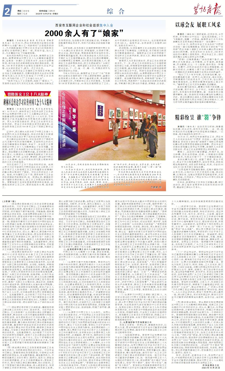 本报讯 (全媒体记者 苗莹 见习记者 常皓萱 焦芃滈) 10月26日,西安市互联网企业和社会组织集中入会暨“雁小工·两新相约”志愿服务活动上,几名刚刚拿到《中国工会会员证》的互联网企业和社会组织职工聚在一起,笑容洋溢,加入工会,代表着他们有了归属和保障。 此次活动由西安市总工会主办、雁塔区总工会承办,是贯彻落实中国工会十八大精神的重要举措,也是进一步提升工会服务水平、优化企业营商环境、助力全市经济和谐稳定发展的具体体现。现场,100余名互联网企业和社会组织代表庄严宣誓,在大家的见证下,成为工会会员。 随后,陕西省总工会基层工作部部长李琳,西安市总工会党组成员、经费审查委员会主任宋军等领导为新入会会员代表颁发了《中国工会会员证》,并为他们送上了“工会爱心大礼包”。 “我终于加入了工会组织,找到了‘娘家人’”。互联网企业会员代表武红文说,将积极主动参加工会各项活动,加强理论学习和技能培训,不断提升技能素质和业务水平,用自己的诚实劳动创造幸福生活。 宋军强调,全市各级工会组织要围绕中国工会十八大提出的主要任务,积极履职,在思想引领、建功立业、维护权益、帮困救助等方面发挥作用;要聚焦高质量发展,关心关注新业态人员的生活,不断扩大工会组织覆盖面;要大力弘扬劳模精神、劳动精神和工匠精神,培养更多的高技能人才;要深化工会品牌帮扶活动,把工会建设成为广大职工依赖的职工之家。她希望新入会的会员立足岗位、建功立业,干一行、爱一行、精一行,用勤劳双手为城市建设作出贡献。 今年4月份以来,雁塔区总工会对“三有”互联网企业和社会组织进行了深入调研和摸排,掌握企业现状和入会难点,集中力量攻坚克难,依法推动工会组建工作,不断延伸工会工作的触角。先后指导138家互联网企业、45家社会组织建立了工会,其中互联网企业吸纳会员1510人,社会组织吸纳会员580人。截至目前,全区新建工会组织249家,发展会员9610人。 活动现场,10余家基层工会志愿者队伍为职工群众开展了免费理发、口腔检查、血压和视力测试及中医推拿和问诊。雁塔区总工会坐班律师和干部还针对工会法律法规、建会入会、集体协商条例等工作进行宣讲。 雁塔区人大常委会副主任、区总工会主席张苗苗表示,下一步,区总工会将持续加大工会组建和服务职工力度,积极探索并破解新业态企业建会难的工作瓶颈,最大限度地把互联网企业和两新组织职工吸引到工会中来。同时号召全区各级工会组织要以本次活动为契机,认真贯彻落实中国工会十八大精神,全面推进互联网企业和平台企业建会扩面提质。健全基层组织体系,积极构建“全域+”工会工作机制,依法维护广大新业态劳动者的合法权益,不断提升职工群众的幸福感、获得感、安全感。
