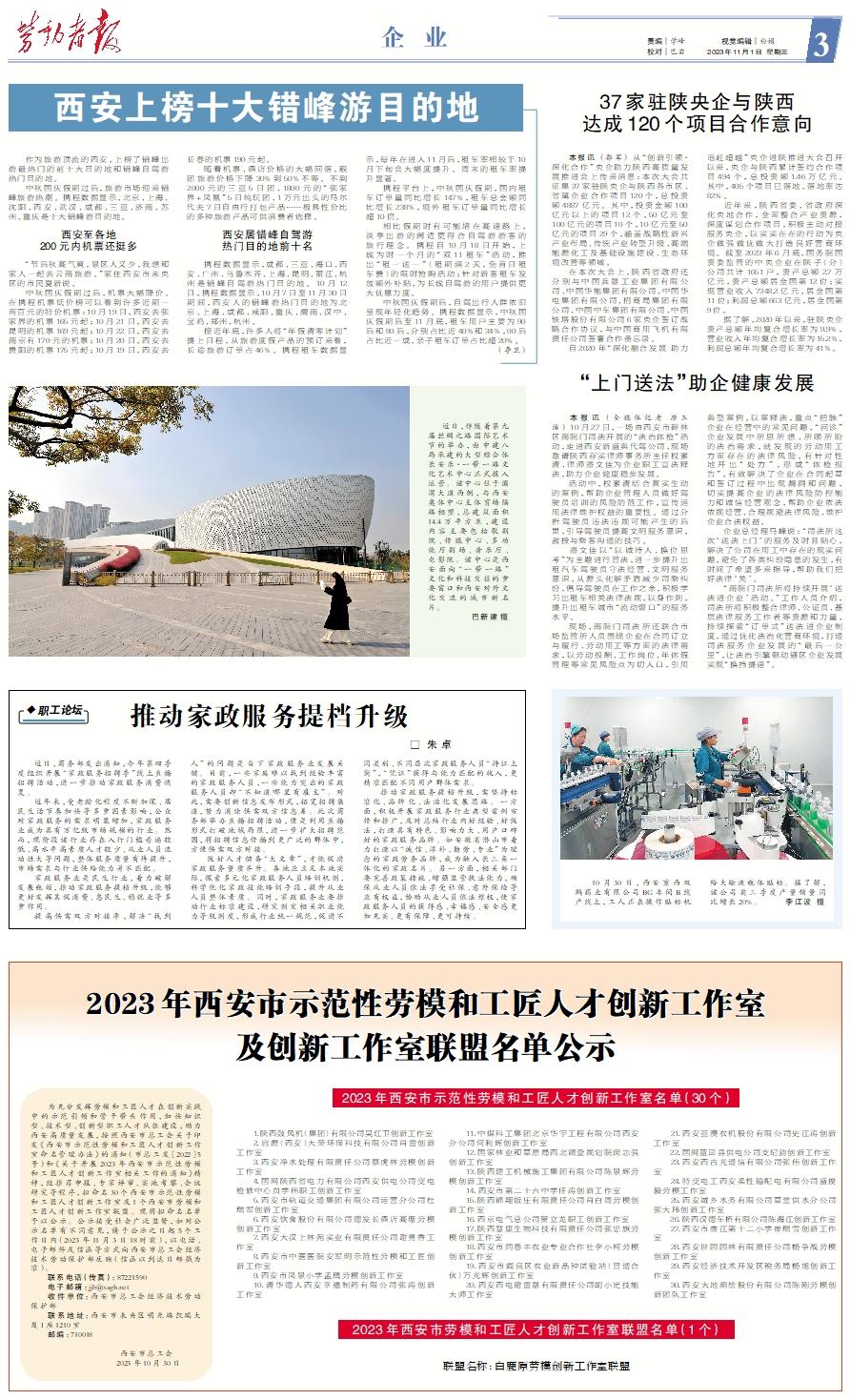 为充分发挥劳模和工匠人才在创新实践中的示范引领和骨干带头作用,加快知识型、技术型、创新型职工人才队伍建设,助力西安高质量发展,按照西安市总工会关于印发《西安市示范性劳模和工匠人才创新工作室命名管理办法》的通知(市总工发〔2022〕5号)和《关于开展2023年西安市示范性劳模和工匠人才创新工作室相关工作的通知》精神,经推荐申报、专家评审、实地考察、会议研究等程序,拟命名30个西安市示范性劳模和工匠人才创新工作室及1个西安市劳模和工匠人才创新工作室联盟。现将拟命名名单予以公示。公示接受社会广泛监督,如对公示名单有不同意见,请于公示之日起5个工作日内(2023年11月3日18时前),以电话、电子邮件或信函等方式向西安市总工会经济技术劳动保护部反映(信函以到达日邮戳为准)。 联系电话(传真):87221590 电子邮箱:jjb@xagh.net 收件单位:西安市总工会经济技术劳动保护部 联系地址:西安市未央区明光路凯瑞大厦I座1210室 邮编:710018 西安市总工会 2023年10月30日2023年西安市示范性劳模和工匠人才创新工作室名单(30个) 1.陕西鼓风机(集团)有限公司吴红卫创新工作室 2.启源(西安)大荣环保科技有限公司肖雷创新工作室 3.西安净水处理有限责任公司蔡虎林劳模创新工作室 4.国网陕西省电力有限公司西安供电公司变电检修中心贠学伟职工创新工作室 5.西安市轨道交通集团有限公司运营分公司杜瑞军创新工作室 6.西安饮食股份有限公司德发长酒店高珊劳模创新工作室 7.西安大汉上林苑实业有限责任公司谢勇香工作室 8.西安市中医医院安军明示范性劳模和工匠创新工作室 9.西安市凤景小学孟瑀劳模创新工作室 10.清华德人西安幸福制药有限公司张涛创新工作室 11.中煤科工集团北京华宇工程有限公司西安分公司何利辉创新工作室 12.国家林业和草原局西北调查规划院闵志强创新工作室 13.陕西建工机械施工集团有限公司陈景辉劳模创新工作室 14.西安市第二十六中学任涛创新工作室 15.陕西锦翔饭庄有限责任公司肖白周劳模创新工作室 16.西京电气总公司贺立龙职工创新工作室 17.陕西慧康生物科技有限责任公司张忠旗劳模创新工作室 18.西安市同春丰农业专业合作社李小柯劳模创新工作室 19.西安市阎良区农业新品种试验站(普通合伙)万光辉创新工作室 20.西安西电避雷器有限责任公司胡小定技能大师工作室 21.西安亚澳农机股份有限公司史江涛创新工作室 22.国网蓝田县供电公司支纪勃创新工作室 23.西安西古光通信有限公司张伟创新工作室 24.特变电工西安柔性输配电有限公司盛俊毅劳模工作室 25.西安城乡水务有限公司草堂供水分公司张大玮创新工作室 26.陕西汉德车桥有限公司陈海江创新工作室 27.西安市曲江第十二小学崔瑞雪创新工作室 28.西安世园园林有限责任公司杨争战劳模创新工作室 29.西安经济技术开发区税务局杨旭创新工作室 30.西安大地测绘股份有限公司陈刚劳模创新团队工作室2023年西安市劳模和工匠人才创新工作室联盟名单(1个)联盟名称:白鹿原劳模创新工作室联盟