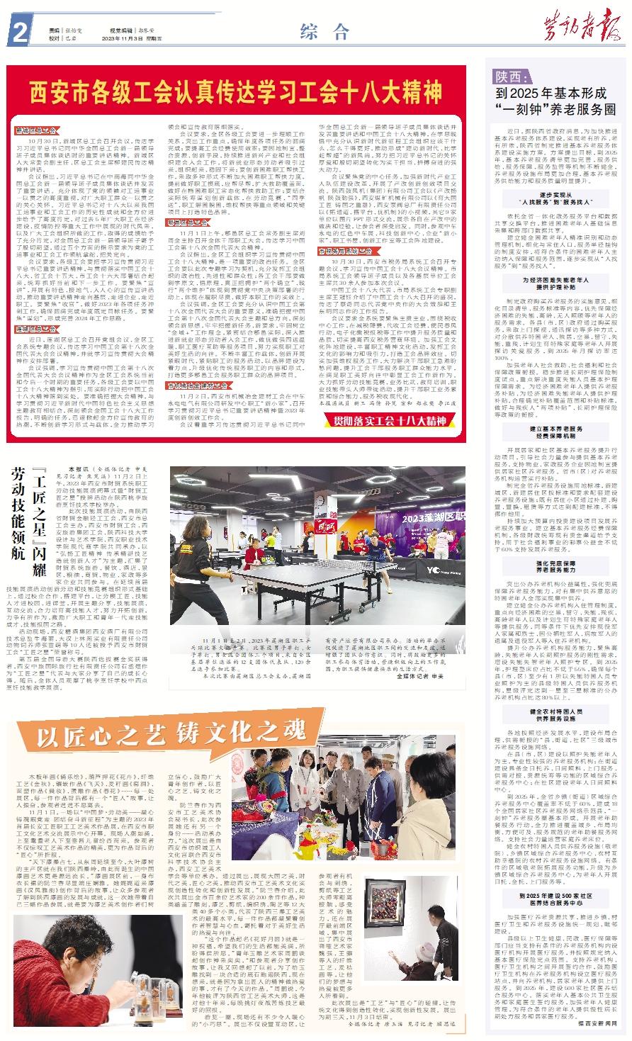 新城区总工会 10月30日,新城区总工会召开会议,传达学习习近平总书记同中华全国总工会新一届领导班子成员集体谈话时的重要讲话精神。新城区人大常委会副主任、区总工会主席柳建民传达精神并讲话。 会议指出,习近平总书记在中南海同中华全国总工会新一届领导班子成员集体谈话并发表了重要讲话。充分体现了党的领袖对工运事业一以贯之的高度重视,对广大职工群众一以贯之的关心关怀。习近平总书记对十八大以来我国工运事业和工会工作的历史性成就和全方位进步给予了高度肯定,对过去5年广大职工在经济建设、疫情防控等重大工作中展现的时代风采,以及广大工会组织所做的工作、取得的成绩给予了充分肯定,对全国总工会新一届领导班子寄予了殷切期望,通过五个方面的指示要求为党的工运事业和工会工作领航掌舵、把关定向。 会议要求,各级工会要把学习宣传贯彻习近平总书记重要讲话精神,与贯彻落实中国工会十八大、省工会十五大、市工会十六大部署结合起来,统筹抓好当前和下一步工作。要聚焦“宣讲”,开展有特色、接地气、入人心的宣传宣讲活动,推动重要讲话精神走向基层、走进企业、走近职工。要聚焦“收官”,做好2023年各项任务冲刺工作,确保圆满完成年度既定目标任务。要聚焦“谋划”,形成完善2024年工作思路。莲湖区总工会 近日,莲湖区总工会召开党组会议、全区工会系统专题会议,传达学习中国工会第十八次全国代表大会会议精神,并就学习宣传贯彻大会精神作安排部署。 会议强调,学习宣传贯彻中国工会第十八次全国代表大会会议精神作为全区工会系统当前和今后一个时期的重要任务,各级工会要以中国工会十八大精神为指引,用实际行动把中国工会十八大精神落到实处。要准确把握大会精神,与学习贯彻习近平新时代中国特色社会主义思想主题教育相结合,深刻领会全国工会十八大工作报告、明确的任务,迅速掀起全方位宣传教育的热潮,不断创新学习形式与载体,全力推动学习领会和宣传教育落细落实。 会议要求,全区各级工会要进一步理顺工作关系,突出工作重点,确保年度各项任务的圆满完成;要提高工会经费使用效率;要因地制宜、整合资源、创新手段,持续推进新兴产业和社会组织建会入会工作,将新就业形态劳动者吸引过来、组织起来、稳固下来;要创新困难职工帮扶工作,采取多种形式不断加大困难职工帮扶力度,提前做好职工摸底,应帮尽帮,扩大救助覆盖面,做好在档困难职工常态化帮扶救助工作;要结合实际统筹谋划创新载体,在劳动竞赛、“四季送”、职工解困脱困、维权帮扶等重点领域和关键项目上打造特色品牌。鄠邑区总工会 11月1日上午,鄠邑区总工会常务副主席刘周全主持召开全体干部职工大会,传达学习中国工会第十八次全国代表大会精神。 会议指出,全区工会组织学习宣传贯彻中国工会十八大精神,是一项重要的政治任务。全区工会要以此次专题学习为契机,充分发挥工会组织的政治性、先进性和群众性;各工会干部要做到学原文、悟原理,真正把拥护“两个确立”、践行“两个维护”体现到贯彻党中央决策部署的行动上,体现在履职尽责、做好本职工作的实效上。 会议强调,全区工会要充分认识中国工会第十八次全国代表大会的重要意义,准确把握中国工会第十八次全国代表大会主题和总方向,深刻领会新思想,牢牢把握新任务、新要求,牢固树立“全域+”工作理念,紧密结合鄠邑实际,深入推进新就业形态劳动者入会工作,做优做强四送温暖、职工医疗互助等服务项目,努力实现职工对美好生活的向往。不断丰富工作载体,创新开展紧跟时代、紧贴职工的服务活动,以品牌建设为着力点,升级优化传统服务职工的内容和形式,打造更多鄠邑工会服务职工群众的品牌项目。市机械冶金建材工会 11月2日,西安市机械冶金建材工会在中车永电电气有限公司研发中心职工“新小家”,召开学习贯彻习近平总书记重要讲话精神暨2023年度创新创效工作会。 会议着重学习传达贯彻习近平总书记同中华全国总工会新一届领导班子成员集体谈话并发表重要讲话和中国工会十八大精神,在学思践悟中充分认识新时代新征程工会组织应该干什么、怎么干得更好,推动形成“建功新时代、比学赶帮超”的新风尚,努力把习近平总书记的关怀厚爱和殷切期望转化为实干担当、拼搏奋进的强大动力。 会议聚焦党的中心任务,加强新时代产业工人队伍建设改革,开展了产改创新创效项目交流。陕西鼓风机(集团)有限公司工会以《产改扬帆 陕鼓劲强》、西安煤矿机械有限公司以《育大国工匠 铸国之重器》、西安泵阀总厂有限责任公司以《拓通道、搭平台、优机制》的小视频,其它9家单位以图片PPT形式交流,展示各自在产改中的做法和经验,让参会者深受启发。同时,参观中车永电的红色中车展、科技创新中心、企业“新小家”、职工书屋、创新工作室等工会阵地建设。市税务局系统工会 10月30日,西安市税务局系统工会召开专题会议,学习宣传中国工会十八大会议精神。市局系统工会领导班子成员以及各基层单位工会主席共30余人参加本次会议。 中国工会十八大代表、市局系统工会专职副主席王冠钰介绍了中国工会十八大召开的盛况,传达了蔡奇同志代表党中央作的大会致辞和王东明同志作的工作报