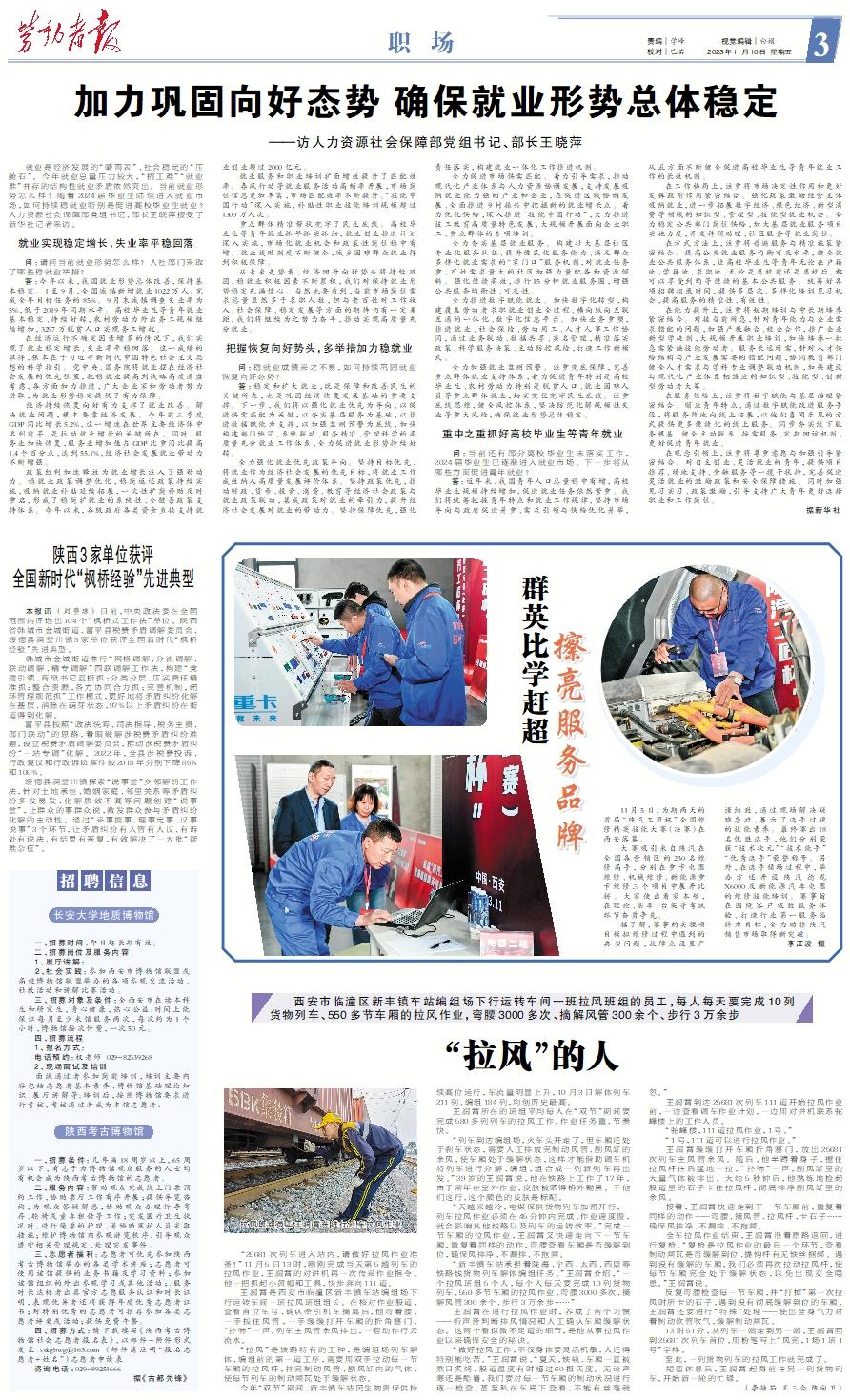 就业是经济发展的“晴雨表”、社会稳定的“压舱石”。今年就业总量压力较大,“招工难”“就业难”并存的结构性就业矛盾依然突出。当前就业形势怎么样?随着2024届毕业生陆续进入就业市场,如何持续稳就业特别是促进高校毕业生就业?人力资源社会保障部党组书记、部长王晓萍接受了新华社记者采访。就业实现稳定增长,失业率平稳回落 问:请问当前就业形势怎么样?人社部门采取了哪些稳就业举措? 答:今年以来,我国就业形势总体改善,保持基本稳定。1至9月,全国城镇新增就业1022万人,完成全年目标任务的85%。9月末城镇调查失业率为5%,低于2019年同期水平。高校毕业生等青年就业基本稳定、持续好转,农村劳动力外出务工规模继续增加,3297万脱贫人口实现务工增收。 在经济运行不确定因素增多的情况下,我们实现了就业稳定增长、失业率平稳回落。这一成绩的取得,根本在于习近平新时代中国特色社会主义思想的科学指引。党中央、国务院将就业摆在经济社会发展的优先位置,把稳就业提高到战略高度通盘考虑,各方面加力推进,广大企业家和劳动者努力进取,为就业形势稳定提供了有力保障。 经济持续恢复向好有力支撑了就业改善。解决就业问题,根本要靠经济发展。今年前三季度GDP同比增长5.2%,这一增速在世界主要经济体中名列前茅,是拉动就业增长的关键所在。同时,服务业加快恢复,服务业增加值占GDP比重同比提高1.4个百分点,达到55.1%,经济社会发展就业带动力不断增强。 政策红利加速释放为就业增长注入了强劲动力。稳就业政策调整优化,稳岗返还政策持续实施,吸纳就业补贴延续拓展,一次性扩岗补助及时重启,形成了稳岗扩就业的系统性、全链条政策支持体系。今年以来,各级政府各类资金直接支持就业创业超过2000亿元。 就业服务和职业培训扩面增效提升了匹配效率。春风行动等就业服务活动高频率开展,市场岗位信息更加丰富,市场匹配效率不断提升。“技能中国行动”深入实施,补贴性职业技能培训规模超过1300万人次。 重点群体精准帮扶兜牢了民生底线。高校毕业生等青年就业抓早抓实抓细,就业创业推进计划深入实施,市场化就业机会和政策性岗位稳中有增。就业援助制度不断健全,城乡困难群众就业得到积极保障。 从未来走势看,经济回升向好势头将持续巩固,稳就业积极因素不断累积,我们对保持就业形势稳定充满信心。当然也要看到,当前市场岗位需求总量虽然多于求职人数,但与老百姓对工作收入、社会保障、稳定发展等方面的期待仍有一定差距,我们将继续为之努力奋斗,推动实现高质量充分就业。把握恢复向好势头,多举措加力稳就业 问:稳就业成绩来之不易,如何持续巩固就业恢复向好态势? 答:稳定和扩大就业,既是保障和改善民生的关键所在,也是巩固经济恢复发展基础的重要支撑。下一步,我们将以强化就业优先为导向,以促进供需匹配为关键,以夯实基层服务为基础,以推进数据赋能为支撑,以加强监测预警为底线,加快构建部门协同、系统联动、服务精准、管理科学的高质量充分就业工作体系,全力促进就业形势持续好转。 全力强化就业优先政策导向。坚持目标优先,将就业作为经济社会发展的优先目标,将就业工作成效纳入高质量发展评价体系。坚持政策优先,推动财政、货币、投资、消费、教育等经济社会政策与就业政策联动,集成政策对就业的牵引力,提升经济社会发展对就业的带动力。坚持保障优先,强化责任落实,构建就业一体化工作推进机制。 全力促进市场供需匹配。着力引导需求,推动现代化产业体系与人力资源协调发展,支持发展吸纳就业能力强的产业和企业,在促进区域协调发展、全面推进乡村振兴中挖掘新的就业增长点。着力优化供给,深入推进“技能中国行动”,大力推进技工教育高质量特色发展,大规模开展面向企业职工、重点群体的专项培训。 全力夯实基层就业服务。构建壮大基层社区专业化服务队伍、提升便民化服务能力、满足群众多样化就业需求的“家门口”服务机制,对就业任务重、百姓需求量大的社区加强力量配备和资源倾斜。强化便捷高效,推行15分钟就业服务圈,增强公共服务均衡性、可及性。 全力推进数字赋能就业。加快数字化转型,构建覆盖劳动者求职就业创业全过程、横向纵向互联互通的一体化、数字化信息平台。加快业务重塑,推进就业、社会保险、劳动用工、人才人事工作协同,通过业务联动、数据共享、实名管理,精准落实政策、科学服务决策、主动防控风险,打造工作新模式。 全力加强就业监测预警。注重兜底保障,完善重点群体就业支持体系,着力促进青年特别是高校毕业生、农村劳动力特别是脱贫人口、就业困难人员等重点群体就业,切实兜住兜牢民生底线。注重底线思维,健全风控体系,坚决防范化解规模性失业等重大风险,确保就业形势总体稳定。重中之重抓好高校毕业生等青年就业 问:当前还有部分离校毕业生未落实工作,2024届毕业生已逐渐进入就业市场。下一步将从哪些方面促进青年就业? 答:近年来,我国青年人口总量稳中有增,高校毕业生规模持续增加,促进就业任务依然繁重。我们将统筹把握青年特点和就业工作规律,坚持市场导向与政府促进并重、需求引领与供给优化并举,从五方面不断健全促进高校毕业生等青年就业工作的长效