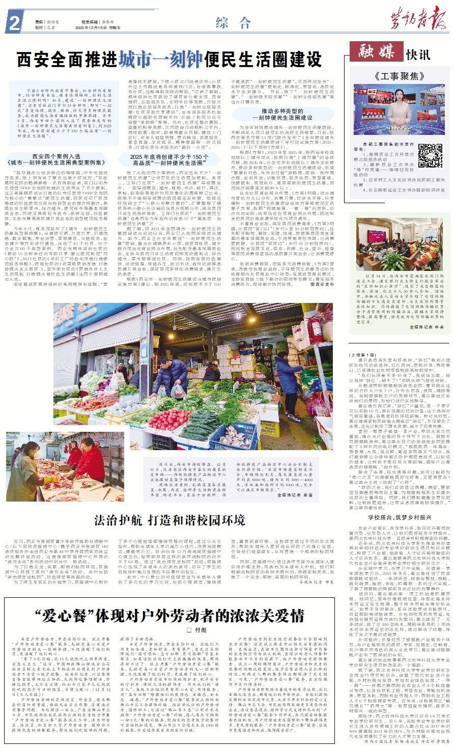 下楼5分钟内就有早餐店,10分钟内有超市,15分钟有书店、健身休闲场所,你的生活是这么便利吗?如今,建设“一刻钟便民生活圈”,让老百姓出门步行15分钟内,即可“一站式”享受休闲、娱乐、购物、社交等多种便民服务,成为提高生活幸福指数的重要举措。今年9月,西安市四个案例入选了商务部发布的《城市一刻钟便民生活圈典型案例集》,到2025年底,西安将创建不少于150个高品质“一刻钟便民生活圈”。西安四个案例入选《城市一刻钟便民生活圈典型案例集》 “我早晨办公就去旁边的咖啡馆,中午吃饭地方很多,晚上朋友来了聚会也是个好地方。”家住昆明花园的杨婷婷是一名自由职业者,家门口的叁伍壹壹TFEP文创园给她的生活带去了不少便利。这正是雁塔区试点打造的以叁伍壹壹TFEP文创园为核心的“集聚式”便民生活圈,园区将旧厂区改造成的特色建筑空间与创新型业态组合相融合,是既包含生鲜菜市、综合超市、便民夜市等基本保障类业态,同时又具备花市鱼市、品牌连锁、特色餐饮、文创市集等品质提升类业态的新型便民服务商圈。 今年9月,商务部发布了《城市一刻钟便民生活圈典型案例集》,从党建引领、共建共享、旧城改造、数字赋能、专业运营、菜场提质、公益服务、业态提升等方面进行提炼,优选了41个社区、19个企业共60个典型案例。西安市枫林绿洲社区的《推动15分钟半径内互助共享 圈出便民利民“同心圆”》,3511社区的《老旧工厂特色化改造打造便民服务样板》,建南社区的《老菜场更新改造 打造新烟火主义街区 》,嘉华街社区的《营造市井人文生活风貌 打造烟火巷特色生活圈》这四个案例成功入选。 家住高新区枫林绿洲的朱阿姨深有感触。“要是身体不舒服,下楼小区北门就是诊所;小区外过个马路就是各种餐饮门店,有啥难事联系社区,也能得到及时的帮助。”记者了解到,枫林绿洲社区联动了辖区非公党支部、民非组织、志愿服务队、文明单位等资源,共驻共建打造志愿服务体系,打造“一刻钟志愿服务圈·社区互助共享驿站”,包含很多服务比如搭建公益助农展销平台、在线上利用公众号设置“求助榜”等等。另外,社区还整合医院、康复机构等资源,共同建设日间照料云平台,围绕助医、助老、助餐等重点目标,提供上门诊疗、老年人健康管理、营养指导、家政服务、紧急救援、文化娱乐、精神慰藉等一站式服务,打通社区养老服务的“最后一公里”。2025年底将创建不少于150个高品质“一刻钟便民生活圈” 除了入选的四个案例外,西安还有不少“一刻钟便民生活圈”让老百姓的生活更加便利。本周二,玉祥门社区“一刻钟便民生活圈”导视图发布。一张导视图里,超市、商场、书店、银行、酒店、学校、影剧院等场所均用形象化的图案标记出来,现场不少拿到导视图的居民都连连称赞。现场还特别设立了“小修小补集合摊位”,汇聚整理了辖区各种小修小补店铺的信息在现场公示,满足居民日常生活各种需求。玉祥门社区的“一刻钟便民生活圈”也是西安今年发布的首批27个“高品质一刻钟便民生活圈”之一。 据了解,自2021年全国城市一刻钟便民生活圈建设试点启动以来,西安已入选国家级试点城市。如今,西安正在全面推进“一刻钟便民生活圈”建设,重点在城镇原有小区、新建居住区、城乡接合部优化商业网点布局,优先配齐基本保障类业态,支持与居民日常生活密切相关的便利店、综合超市、菜市场等进社区。同时,鼓励发展特色餐饮、运动健身、保健养生、新式书店、教育培训等品质提升类业态,满足居民多样化消费需求,提升生活品质。 根据《西安市一刻钟便民生活圈试点城市建设实施方案》提出,到2025年底,将创建不少于150个高品质“一刻钟便民生活圈”,示范带动全市“一刻钟便民生活圈”便利化、标准化、智慧化、品质化水平全面提升。 目前,除了“一刻钟便民生活圈”,“一刻钟政务服务圈”“一刻钟交通服务圈”等也在日臻完善。推动多种类型的一刻钟便民生活圈建设 为全面持续推进城市一刻钟便民生活圈建设,不断满足人民日益增长的美好生活需要,日前,陕西省商务厅等13部门联合发布了《全面推进城市一刻钟便民生活圈建设三年行动实施方案(2023-2025)》(以下简称《方案》)。 根据《方案》,2023年至2025年,陕西每年选取地级以上城市试点、按照打造“十城百圈”的总体目标,到2025年,在全省所有地级以上城市全面推开,推动多种类型的一刻钟便民生活圈建设,形成“圈圈有特色、市市有经验”新格局,建设一批布局合理、业态齐全,功能完善、服务优质,智慧高效、快捷便利,规范有序、商居和谐的便民生活圈,居民综合满意度达到90%以上。 优化社区商业网点布局。《方案》明确,试点城市要结合人口分布、消费习惯、经济水平等,科学编制一刻钟便民生活圈建设总体方案和便民生活圈子方案,按照“因城施策、一圈一策”的原则,结合当地实际,统筹优化社区商业网点布局,因地制宜把居民的需求清单转化为项目清单。 丰富商业业态,满足居民消费需求。《方案》明确,在居民“家门口”(步行5至10分钟范围内),优先配齐购物、餐饮、家政、快递、维修等居民关注度高的基本保障类业态,引进智能零售终端,让消费更便捷。在居民“家周边”(步行15分钟范围内),因地制宜发展文化、娱乐