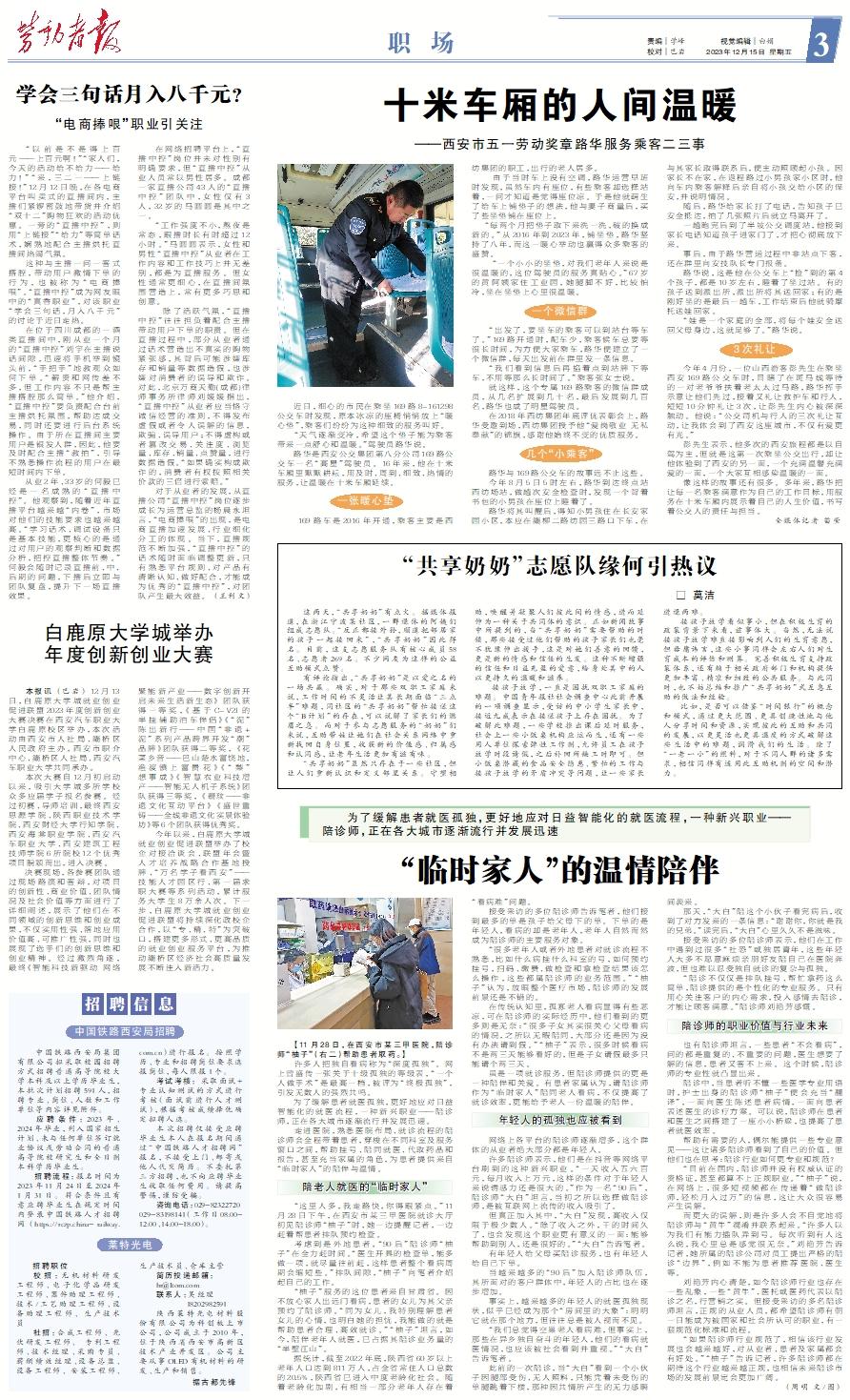 【11月28日,在西安市某三甲医院,陪诊师“柚子”(右二)帮助患者取药。】 许多人把独自看病称为“深度孤独”。网上曾盛传一张关于十级孤独的等级表,“一个人做手术”是最高一档,被评为“终极孤独”,引发无数人的强烈共鸣。 为了缓解患者就医孤独,更好地应对日益智能化的就医流程,一种新兴职业——陪诊师,正在各大城市逐渐流行并发展迅速。 走进医院,熟悉医院布局、就诊流程的陪诊师会全程带着患者,穿梭在不同科室及服务窗口之间,帮助挂号、陪同就医、代取药品和报告,甚至充当家属的角色,为患者提供来自“临时家人”的陪伴与温情。陪老人就医的“临时家人” “这里人多,我走路快,你得跟紧点。”11月28日下午,在西安市某三甲医院就诊大厅初见陪诊师“柚子”时,她一边提醒记者,一边赶着帮患者排队预约检查。 考虑到是外地患者,“90后”陪诊师“柚子”在全力赶时间。“医生开具的检查单,能多做一项,就尽量往前赶,这样患者整个看病周期会缩短些。”排队间隙,“柚子”向笔者介绍起自己的工作。 “柚子”服务的这位患者来自甘肃省。因不放心家人出远门看病,患者的女儿为其父亲预约了陪诊师。“同为女儿,我特别理解患者女儿的心情,也明白她的担忧,我能做的就是帮助患者合理、高效就诊。”“柚子”坦言,如今,陪伴老年人就医,已占据其陪诊业务量的“半壁江山”。 据统计,截至2022年底,陕西省60岁以上老年人口达到811万人,占全省常住人口总数的20.5%,陕西省已进入中度老龄化社会。随着老龄化加剧,有相当一部分老年人存在着“看病难”问题。 接受采访的多位陪诊师告诉笔者,他们接到最多的单是孩子给父母下的单。下单的是年轻人,看病的却是老年人,老年人自然而然成为陪诊师的主要服务对象。 “很多老年人或者外地患者对就诊流程不熟悉,比如什么病挂什么科室的号,如何预约挂号,扫码、缴费、做检查和拿检查结果该怎么操作,这些都属陪诊师的业务范围。”“柚子”认为,放眼整个医疗市场,陪诊师的发展前景还是不错的。 在传统认知里,孤寡老人看病显得有些悲凉,可在陪诊师的实际经历中,他们看到的更多则是无奈:“很多子女其实很关心父母看病的情况,之所以无暇陪同,大部分还是因为没有办法请到假。”“柚子”表示,很多时候看病不是两三天能够看好的,但是子女请假最多只能请个两三天。 虽是一项就诊服务,但陪诊师提供的更是一种陪伴和关爱。有患者家属认为,请陪诊师作为“临时家人”陪同老人看病,不仅提高了就诊效率,更能给予老人一份温暖的陪伴。年轻人的孤独也应被看到 网络上各平台的陪诊师逐渐增多,这个群体的从业者绝大部分都是年轻人。 许多陪诊师表示,他们是在抖音等网络平台刷到的这种新兴职业。“一天收入五六百元,每月收入上万元,这样的条件对于年轻人来说诱惑力还是很大的。”作为一名“90后”,陪诊师“大白”坦言,当初之所以选择做陪诊师,是被互联网上流传的收入吸引了。 但真正加入其中,“大白”发现,高收入仅限于极少数人。“除了收入之外,干的时间久了,也会发现这个职业更有意义的一面:能够帮助到别人,还是很好的。”“大白”告诉笔者。 有年轻人给父母买陪诊服务,也有年轻人给自己下单。 当越来越多的“90后”加入陪诊师队伍,其所面对的客户群体中,年轻人的占比也在逐步增加。 事实上,越来越多的年轻人的就医孤独现状,似乎已经成为那个“房间里的大象”:明明它就在那个地方,但往往总是被人视而不见。 “我们总觉得空巢老人看病难,但事实上,那些在异乡独自奋斗的年轻人,他们的看病就医情况,也应该被社会看到并重视。”“大白”告诉笔者。 此前的一次陪诊,当“大白”看到一个小伙子因腿部受伤、无人照料,只能凭着未受伤的单腿跳着下楼,那种因共情所产生的无力感瞬间袭来。 那天,“大白”陪这个小伙子看完病后,收到了对方发来的一条信息:“谢谢你,你就是我的兄弟。”读完后,“大白”心里久久不是滋味。 接受采访的多位陪诊师表示,他们在工作中遇到过很多“社恐”或独居青年,这些年轻人大多不愿意麻烦亲朋好友陪自己在医院奔波,但也难以忍受独自就诊的复杂与孤独。 “陪诊不仅仅是排队挂号、帮忙拿药这么简单,陪诊提供的是个性化的专业服务。只有用心关注客户的内心需求,投入感情去陪诊,才能让顾客满意。”陪诊师刘艳芳感慨。陪诊师的职业价值与行业未来 也有陪诊师坦言,一些患者“不会看病”,问的都是重复的、不重要的问题,医生想要了解的信息,患者又答不上来。这个时候,陪诊师的专业性就凸显出来。 陪诊中,当患者听不懂一些医学专业用语时,护士出身的陪诊师“柚子”便会充当“翻译”,一面向医生陈述患者病情,一面向患者表述医生的诊疗方案。可以说,陪诊师在患者和医生之间搭建了一座小小桥梁,也提高了患者就医效率。 帮助有需要的人,偶尔能提供一些专业意见——这让诸多陪诊师看到了自己的价值。但他们也在思考:陪诊行业如何更专业和规范? “目前在国内,陪诊师并没有权威认证的资格证,甚至都算不上正规职业。”“柚子”说,在网络上,很多短视频都在传递着“做陪诊师,轻松月入过万”的信息,这让大众很容易产生误解。 而更大的误解,则是许多人会不自觉地将陪诊师与“黄牛”混