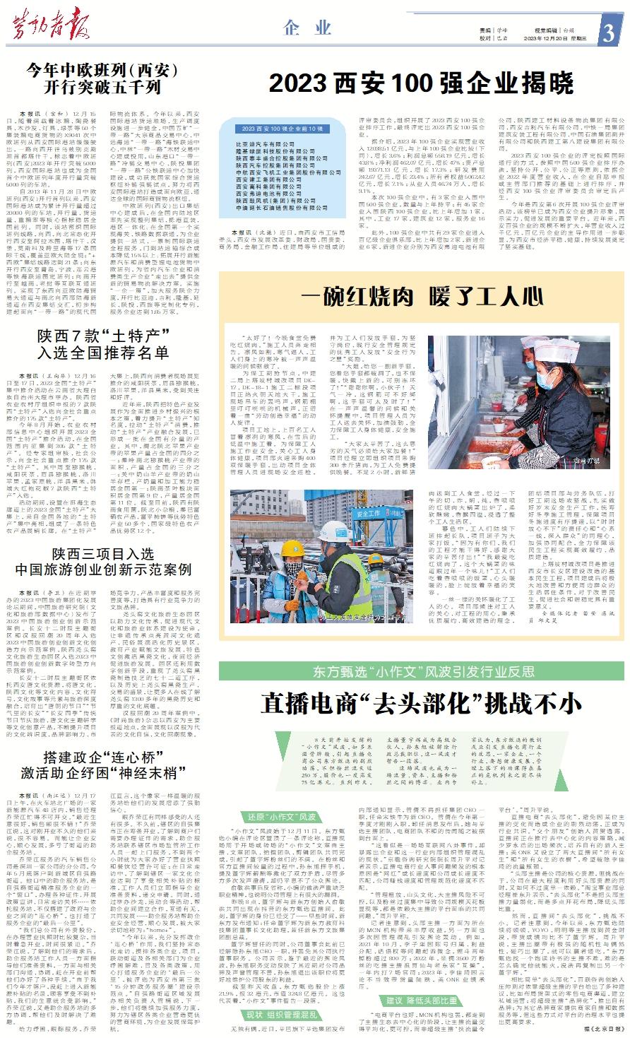 2023西安100强企业前10强 比亚迪汽车有限公司 隆基绿能科技股份有限公司 陕西泰丰盛合控股集团有限公司 陕西汽车控股集团有限公司 中航西安飞机工业集团股份有限公司 西安建工集团有限公司 西安高科集团有限公司 西安弗迪电池有限公司 陕西鼓风机(集团)有限公司 中油延长石油销售股份有限公司 本报讯 (沈谦) 近日,由西安市工信局牵头,西安市发展改革委、财政局、国资委、商务局、金融工作局、住建局等单位组成的评审委员会,组织开展了2023西安100强企业排序工作,最终评定出2023西安100强企业。 据介绍,2023年100强企业实现营业收入12038.51亿元,与上年100强企业比较(下同),增长3.6%;利润总额558.19亿元,增长43.8%;净利润462.07亿元,增长47%;资产总额19371.13亿元,增长17.3%;研发费用242.67亿元,增长23.4%;所有者权益5062.42亿元,增长7.1%;从业人员46.74万人,增长9.1%。 本次100强企业中,有3家企业入围中国500强企业,数量与上年持平;有45家企业入围陕西100强企业,比上年增加1家,其中,工业17家,建筑业12家,服务业16家。 此外,100强企业中共有29家企业进入百亿级企业俱乐部,比上年增加2家,新进企业6家,新进企业分别为西安弗迪电池有限公司、陕西建工材料设备物流集团有限公司、西安吉利汽车有限公司、中铁一局集团建筑安装工程有限公司、中国石油集团测井有限公司和陕西建工第八建设集团有限公司。 2023西安100强企业的评定按照国际通行的方式,参照中国500强企业排序办法,坚持公开、公平、公正等原则,依据企业2022年度营业收入,在企业自愿申报或主管部门推荐的基础上进行排序,并经西安100强企业评审委员会审定后产生。 今年是西安第6次开展100强企业评审活动,该榜单已成为西安企业提升形象、展示实力、促进发展的重要平台。近年来,西安百强企业的规模不断扩大,年营业收入过千亿元、百亿元企业的主导作用进一步彰显,为西安市经济平稳、健康、持续发展奠定了坚实基础。