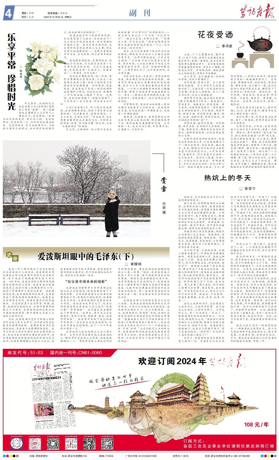 早上乘车,我读的是王安忆长篇小说《长恨歌》里的第二部分“邬桥”。有一段描写做豆腐那家二儿子阿二心事的句子,是这样的:“这难过比先前的更甚,有点咬心的。先前的难过,是茫茫然一片,如今却是水落石出的。先前的难过,是不知道要什么,只知道不要什么的难过,如今却是知道要什么,还知道要不到的难过。” 这里说的是阿二的前程和爱情。反反复复读了几遍后,我还读出了一点小说之外的其他意味,倒是颇贴切岁暮的心情。其实是有些琐碎的,无关前程和爱情这样的人生大事,但又是谁也别想摆脱的——这便是看起来平平无奇、淡淡然然,却千金难买的时光。 起初摆在面前的,是那样悠长,仿佛永不尽似的,可不就是茫茫然一大片望不到边的水域。可是人走着走着,突然就发现“山高月小,水落石出”,一年将尽,岁月已晚! 这时我才蓦然惊觉,这一年里,有很多事都还没来得及做,尤其是一些想要完成的心愿,还在心灵的某个角落被冷冷地搁置着。忙忙碌碌,慌里慌张,甚至连坐下来喝一杯茶的闲情逸致都鲜少有过,而时光之河,就那样一声不响地把人抛在了身后。突然间,我的目标清晰了,理想也明确了,可是时光一去不复返,河水东去永不归。 小说《长恨歌》中,阿二给王琦瑶讲诗,说好诗都有画意,讲到了李白写王昭君的诗:“汉家秦地月,流影照明妃。一上玉关道,天涯去不归。”仔细品味,我发现眼前展现的也是暮色沉沉、光影渐去的情景,既有“长河落日圆”的辽远,也有“大漠孤烟直”的幽寂。 合上书,上楼梯时,我心里不由自主地回旋着“行行重行行”这样的诗句——我们的生活也是一日日的“行行重行行”。“相去日已远,衣带日已缓。”“思君令人老,岁月忽已晚。”谁能说得清这些诗句里蕴含的情感是想念一个人,而不是怀念一段时光呢? 其实,我们生命里每个看似平淡如水的桥段,都能成为日后令人万般恋念的珍贵岁月。“此情可待成追忆,只是当时已惘然。”正如栀子花不知道自己有多香,很多时候,人们往往根本不知自己所拥有的有多珍贵,反而“为赋新词强说愁”,只有等到失去了,永不能追回时,才如梦方醒。 从车站出来后,我走进一条很安静的街道,两边都是饱经沧桑的老院落。枯黄的茅草在房顶上迎着清冷的晨风起舞,环卫工人专心地清扫着街边的角角落落。一个老人端着刚买回的热气腾腾的早餐,神情宁静地推开油漆斑驳的大门。街口,一棵高大的老树稳稳立着,坚实的树干、苍劲的枝丫,无不呈现出时光的质地。 平常即珍贵,看似淡如水的每一段时光都是垒起厚实人生的砖石。在朗然的时光里,我们走的每一步都有意义,过的每一秒都有韵味。 想到这,我抬起头,看见金黄的太阳从前方屋顶上猛然跃起,然后瞬间稳重下来,柔和地散发着温暖的光辉。又是新的一天,我应从细小事、平常事开始,认真投入,不负时光。