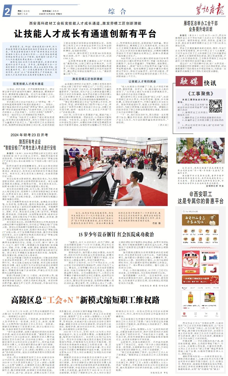 《工事聚焦》 本期工事聚焦的主要内容有: 1、西安市总工会开展“新就业形态劳动者关爱季”技能提升活动 2、雁塔区总工会开展心理服务工作 3、灞桥区总工会开展送温暖慰问活动 4、临潼区总工会开展劳模工匠进校园活动 5、西安经开区举行第七届“经开杯”职工足球友谊赛