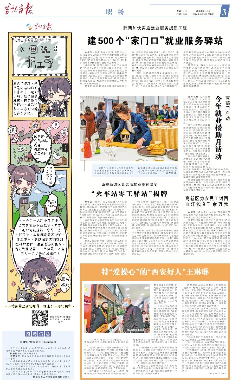 本报讯 (宗和) 西安市新城区“火车站零工驿站”日前在火车站游客服务中心正式揭牌,揭牌仪式上同时发布了新城区的“心诚零工”就业程序,用驿站充实“阵地延伸”,以就业程序贯穿“信息资源”,从线下和线上“双核双向”为来返务工人员、灵活就业人员提供“即时快办”的就业保障服务。 走进西安火车站游客服务中心的火车站零工驿站,屋内宽敞明亮,温暖舒适,随处可见各种形式的就业政策宣传整齐地摆放。求职人员神情专注地看着各种招聘信息,寻找符合自身实际的工作。工作人员耐心地为求职者答疑解惑,工资待遇、工种类型、工作时长等信息被介绍得仔仔细细,求职者听得明明白白。 据悉,驿站内设置了政策咨询、求职登记、综合服务窗口,动态发布政策、求职、用工信息,提供失业登记、培训登记、劳动维权等服务,建立人社局、火车站、解放门街道共同参与的“应急处置 就业帮扶”工作机制,协同联动促进“火车站零工驿站”发挥实效。 “零工驿站”采取“线上+线下”双驱动运行模式,“心诚零工”就业程序提供保姆、保洁、维修、装修、配送等多种灵活用工岗位信息,设置各种技能项目培训报名窗口,并链接了新城区已建成投入运营的就业创业服务驿站,帮助灵活就业人员借助数据信息系统找到合适岗位的同时,将就业创业服务驿站作为“阵地支撑”,为来返务工人员、灵活就业人员提供政策咨询、就业指导、求职招聘、技能培训等一站式“家门口就业”服务。 近年来,灵活用工已经成为许多企业生产经营中的重要组成部分,并影响着劳动者的工作和生活方式。西安市新城区人社局紧密结合区情实际和灵活用工这一主题,精准调研、精心组织,全市首家在车站交通枢纽创建“火车站零工驿站”、发布“心诚零工”就业程序,旨在让来返务工人员、灵活就业人员在西安火车站这一“入陕第一站”全面了解最新的就业创业政策、享受优质的公共就业服务。
