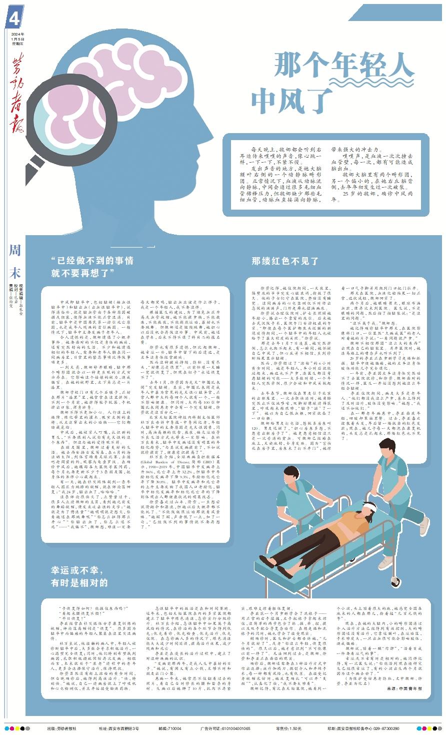 每天晚上,魏娜都会听到右耳边传来噗噗的声音,像心跳一样,一下一下,不紧不慢。 发出声音的地方,是她大脑额叶右侧的一个动静脉畸形团。正常情况下,血液从动脉流向静脉,中间会通过很多毛细血管稀释压力,但魏娜缺少那些毛细血管,动脉血直接涌向静脉,带来强大的冲击力。 噗噗声,是血液一次次撞击血管壁,每一次,都有可能造成脑出血。 魏娜大脑里有两个畸形团,另一个偏小的,在她右丘脑背侧,去年年初发生过一次破裂。 25岁的魏娜,确诊中风两年。“已经做不到的事情就不要再想了” 中风即脑卒中,包括脑梗(缺血性脑卒中)和脑出血(出血性脑卒中),说得通俗些,就是脑血管由于各种原因破损或阻塞,使得血液不能正常流通。目前,脑卒中是中国居民第一排位死亡原因,也是成年人残疾的首位病因。一般情况下,脑卒中主要发病于老年人。 令人遗憾的是,魏娜遭遇了小概率事件。她要面对的不仅是身体的病痛,还有突然转向的生活。不少和她遭遇相似的年轻人,需要和老年人躺在同一间病房里,日常里的禁忌事项比待做事项更多。 一到天亮,魏娜睁开眼睛,脑中那个畸形团就会以一种更直观的方式宣示存在。它影响这个姑娘的视力,造成偏盲。在她的视野里,左下角总是一片漆黑。 魏娜学校门口有几个石墩子,正好在那片“漆黑”里,她常常在这里摔倒。不到一个月前,她摔得鞋子脱落、手机掉出口袋、浑身淤青。 魏娜不得不更加小心。人行道上的路障、绿化带里的灌木、教室左侧的桌椅、从左边窜出来的小动物……它们都暗藏危险。 中风后,她被家人叮嘱,认识新的男生,“不要跟别人说你有先天性的这个东西”。但这与她的爱情观不符。 在朋友圈里,魏娜过着美好的生活。她去西安拍古装写真,在6月的海边晒太阳,到体育场看足球比赛,去酒吧赴闺蜜的约,观察乌龟叠罗汉。在确诊中风后,她辗转各大医院寻医问药,每个月也要更新不少于3条朋友圈,把身体的异样小心藏起来。 有一天,她在社交网络刷到一条年轻人因压力跳桥的视频,就在评论区回复:“我24岁,脑出血了,哈哈哈。” 这条评论很快火了,点赞量过千,很多人点进魏娜的主页,看到她之前发的舞蹈视频,便发来攻击性的文字:“她就是为了博流量”“她明明就是想火,你看她还在那跳舞呢”“你怎么扭得那么开心”“你脑出血了,你怎么还不死”……“我偏不”,魏娜想,难道一定要每天都哭吗,脑出血应该是什么样子,我是一个年轻人,我不要这样。 根据医生的建议,为了避免血压升高或血管收缩,她不能提重物,不能挨冻,不能熬夜,不能剧烈运动,最好也不要跳舞。但魏娜还是继续跳舞,她担心以后没机会再做这些事。中风前,她还在学车,后来不得不退了科目二的报名费。 徐萱也有很多遗憾,但比起魏娜,她幸运一些,脑卒中留下的后遗症,是左半边身体经常酸痛。 然而这种酸痛持续、隐秘、没有尽头,“好像总是很累”。以前忙碌一天睡一觉就恢复了,但现在似乎“永远恢复不了”。 去年1月,徐萱因为先天“卵圆孔未闭”突发脑梗。其实,卵圆孔未闭是成年人中最为常见的先天性心脏异常,正常人群中大约每四个人就有一个,一般不影响健康。但同时,大约每100位卵圆孔未闭患者中会有一个突发脑梗,徐萱就是这百分之一。 北京天坛医院神经内科副主任医师杜万良告诉中青报·中青网记者,年轻人脑卒中的主要原因是先天性因素,同时,高油高糖的饮食、熬夜、缺乏运动等不良生活方式也带来一定影响。在杜万良看来,脑卒中发病还没有明显的年轻化趋势,“与其说发病提前了,不如说就诊提前了,健康意识提高了”。 杜万良介绍,全球疾病负担数据库(Global Burden of Disease,简称GBD)显示,1990-2019年,中国脑卒中发病率上升86%,死亡率上升32.2%,但脑卒中年龄标化发病率下降9.3%,年龄标化死亡率下降39.8%。脑卒中发病率和死亡率的上升主要反映了我国人口老龄化,脑卒中标化发病率和标化死亡率的下降则体现出人群健康状况的明显改善。 徐萱喜欢过山车、滑雪,一直想尝试滑翔伞和漂流,但她以后大概率都不能玩了。“不能做极限运动那就看风景嘛。”她顿了顿,声音低了一点,加了一句,“已经做不到的事情就不要再想了。”那缕红色不见了 徐萱记得,她住院期间,一天夜里,隔壁床的爷爷突发心脏衰竭,抢救了很久。他的子女们守在医院,整宿没有睡觉。这间病房的心电监测仪不时传出急促的滴滴声,门外走廊也摆满病床。 徐萱说办理住院时,护士长照顾她年龄小,腾出一个靠窗的床位。后来她去武汉做手术,医院专门安排权威的专家。“即使在每个医护都焦头烂额的新冠疫情期间,一个脑卒中的年轻人也被给予了最大程度的关照。”徐萱说。 那是去年1月7日凌晨,她突然摔倒,怎么也爬不起来,有一瞬间,她怀疑自己中风了,但心底并不相信,直到诊断结果显示脑梗。 然而,徐萱错过了“溶栓”的6小时黄金时间。她是年轻人,半小时后就能站起来,病症也不严重,连医生都没考虑脑梗的可能——大多数时候,一个年轻人突然晕倒,很少会被和中风关联起来。 去年春节,魏娜住在男友位于北京的出租屋里。一次去取快递时,她肩膀突然止不住地哆嗦,双脚好像踩进棉花里,呼吸越来越艰难,“脑子‘滋’了一下”。她以为自己低血糖,回家就吞了一口白糖。 魏娜给男友打电话,想联系房东叫120。男友迟疑了,“担心房东多想,
