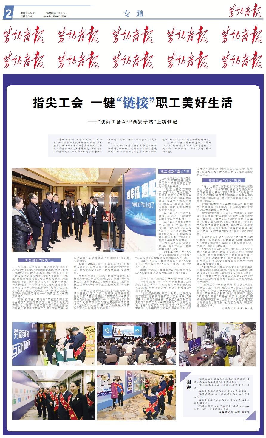 ①西安市总领导与参会嘉宾共同参观“陕西工会APP西安子站”普惠商城展板。 ②与会嘉宾在劳动者报社体验区参与互动。 ③与会嘉宾参观西安数字工会介绍展板。 ④活动现场,与会嘉宾观看西安工会形象宣传片。 ⑤与会劳模代表在西安数字工会介绍展板前合影留念。 ⑥莲湖区总工会干部观看“陕西工会APP西安子站”上线启动仪式直播。 全媒体记者 孙雯 臧慧 摄 律回春晖渐,万象始更新。1月23日,西安索菲特人民大厦会议厅内,座无虚席。随着西安市人大常委会副主任、市总工会党组书记、主席薛振虎,陕西省总工会党组成员、副主席王永岗等领导按下启动键,“陕西工会APP西安子站”正式上线。 这是西安市总工会落实中省群团会议精神,加强和改进新时期工会自身建设的又一生动实践,标志着西安工会智慧化、数字化进入了提质增速的新阶段。 实现了工会工作和服务职工“最后一公里”的连接,职工群众可享受到“一键入会”“一网全通”,高效、实时、精准的服务。工会建到“指尖”上 近年来,西安市总工会认真落实习近平总书记关于网络强国的重要战略思想,着力开拓数字工会建设新局面,加大网上工会平台建设和创新服务力度,按照“网聚职工正能量、网促奋进建功业、网上赋能促成长、网建服务新平台、网筑互动连心桥”的总体思路,初步构建了“一个数据中心、两大应用平台、三项运行体系、多个应用场景”的数字工会体系,建成了直达广大职工群众、集成工会工作全部内容的服务终端——“陕西工会APP西安子站”。 现场,位于主会场外的“西安工会网上工作主题展”,展出了西安工会网上工作的发展历程,与会嘉宾、劳模工匠代表、新就业形态劳动者代表观看了西安工会网上工作历程,在劳动者报社互动体验区、“普惠职工”平台展示区体验。 仪式上,成都市总工会、银川市总工会、榆林市总工会、汉中市总工会的嘉宾共同为“陕西工会APP西安子站”上线加油鼓劲,交流学习。 中华全国总工会网络工作部发来贺电,祝贺西安子站上线仪式圆满成功。同时,深圳市总工会、沈阳市总工会、杭州市总工会、厦门市总工会等20多个城市工会发来贺信,表示祝贺。 “西安工会在陕西工会数字化建设中,组织体量最大,工会会员人数最多,起着举足轻重的作用。”王永岗指出,“陕西工会APP西安子站”的上线,是西安2024年工会工作的“开门红”,对陕西数字工会落地见效具有示范意义,也为全省其他市(区)工会加快融入陕西数字工会一张网提供了借鉴。职工捧到“掌心”里 工会数字化转型,是加快工会改革和建设、提升工会工作和服务职工水平的一项具体举措。 “让工会服务直面职工、直抵人心、更加温暖。”分管此项工作的西安市总工会党组成员、副主席陈曦说,市总工会坚持实用性、高效性、需求性、安全性原则,高质量建设西安数字工会平台。 2019年9月,市总工会网络中心成立,并配强工会网上工作干部队伍。 2020年3月印发《西安工会网上工作规划(2020—2022年)》《西安市“网上工会”平台建设方案》制定网上工作实施步骤和建设目标,为网上工会建设与发展指明方向。 2020年“西安指尖工会(第一期)”“西安工会网站群系统”上线。 2021年“悦工友”“西安市劳模精神展示VR馆”“西安市总工会融媒体信息管理系统”上线。 2022年“西安工会法律服务平台”“西安工会科技创新平台”“西安工会统一用户中心”上线。 2023年“西安工会组织建设与会员管理系统”“西安工会劳动和技能竞赛平台”上线。 …… 2024年1月,“陕西工会APP西安子站”上线。 一个个建设目标、一项项具体措施,让西安数字工会从一个个小功能点聚集形成大的体系建设,取得了新突破、实现了新跨越、开启了新征程。 “让数据多跑路,职工少跑路。这不仅方便了职工,也提高了基层工会工作效率。”雁塔区人大常委会副主任、区总工会主席张苗苗见证了“陕西工会APP西安子站”上线激动地说,这是“传统工会”到“数字工会”的一次美丽蜕变,作为基层工会将主动适应数字化技术迅速发展的形势,把网上工会宣传好、运用好,通过线上线下深入融合发力,更好地服务职工群众。美好生活“点点”就来 “这太方便了,在手机上动动手指就能轻松加入工会。‘点点’屏幕,就能找到服务户外劳动者的爱心驿站,享受‘娘家人’的关爱。”启动仪式现场,来自西安顺路物流有限公司的职工闫佳高兴地说,网上工会的服务涉及方方面面,真贴心! 打开“陕西工会APP西安子站”,标准服务、工具服务、特色服务、本地服务和数字工会矩阵五个模块一目了然。 职工可享受网上入会、法律服务、技能培训、就业服务、互助保障、心灵驿站等多项工会专属服务。遇见love为职工打开交友渠道,心理关爱为职工打造心灵港湾,“工会地图”实现了各级工会组织、爱心驿站、母婴室等一键查询,让职工能够轻松导航到离自己最近的站点,及时享受“娘家人”暖心、贴心的服务。 目前“陕西工会APP西安子站”集成38项工会线上服务功能,形成高效、实时、精准的“一终端全维服务”,实现了工会服务体系化、品牌化、创新化、数字化。 “‘陕西工会APP西安子站’将开启西安工会的‘数字’时代,数字工会将会更好地为职工服务,更好地助推西安工会高质量发展。”银川市总工会