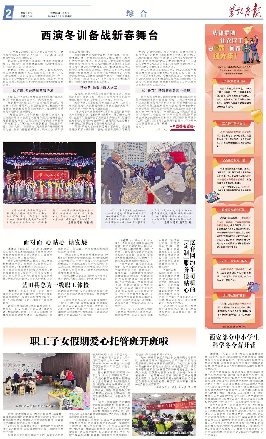 临潼区总工会七彩假期“工力量”助成长爱心托管班雁塔区漳浒寨街道华洲城领誉社区托管班 近日,正值寒假来临,西安市碑林区、临潼区、雁塔区漳浒寨街道和灞桥区洪庆街道总工会组织开展的职工子女假期爱心托管班相继开班,有效解决了辖区内职工子女看护难题。 1月29日,临潼区总工会七彩假期“工力量”助成长爱心托管班,在临潼区职工之家一楼职工书屋正式开班。 临潼区总工会副主席杨飞介绍,首期爱心托管班为期5天(1月29日至2月2日),共有25名学生参加,周一到周五每天上午9:00-12:00、下午2:00-6:00开放,针对辖区职工在读一年级至六年级学龄儿童子女。 爱心托管班现有面积170平方米,分为学习和活动区域,此次爱心托管由辖区5名高校大学生志愿者组成专职服务人员,根据孩子年龄段和成长规律开设课程,课程包含了阅读、文明礼仪、舞蹈、绘画等多方面知识和技能的教学和辅导,满足孩子们多样化、个性化发展需求。 “每年一到寒暑假,我们双职工家庭就特别犯愁,让孩子一个人在家不放心,老人上岁数了精力有限,带到单位又不方便,这次工会办的这个爱心托管班真是解决了我们的大难题。”学生家长潘乐菊如是说。 “办寒假爱心托管班,就是为了减轻职工家庭寒假陪护压力,不断提升职工生活品质,缓解职工上班顾虑,帮小朋友们度过一个安全充实的寒假。”杨飞说,假期幼儿托管班,是工会充分发挥组织优势,顺应职工需要,以小切口彰显大民生,为职工群众办实事、解难题,提高职工幸福指数的一项创新、务实举措和具体行动。 此外,碑林区总工会联合张小蔚劳模志愿服务队,在碑林区青少年服务中心按照年龄、年级分类有序开班,每个年龄段都按照青少年的特点制定各种有益孩子成长的文体活动、兴趣爱好培养、拓展训练等课程和活动;雁塔区漳浒寨街道总工会联合多方力量、汇聚各方资源在响塘、文兴巷、华洲城领誉等10个社区开办托管班,解决职工子女寒假无人看管、作业无人辅导难题;灞桥区洪庆街道总工会携手洪庆悦湾社区,开展了“爱有所托,暖冬护航”爱心托管服务。 全媒体记者 臧慧 通讯员 梁立萍