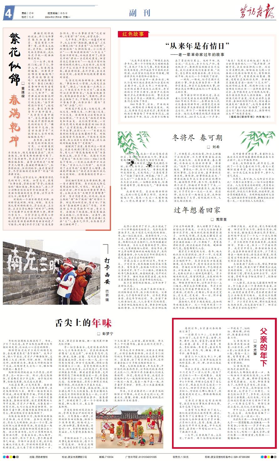 “从来年是有情日。”即便是在战争年代,那一个个伴随战火硝烟的春节,虽然少了红火气象,更没有满桌的美味佳肴,但洋溢在节日里的浓浓情谊,也让官兵们感到分外温暖,增添许多战斗豪情和必胜信心。 红军长征途中一渡赤水后,部队行至四川叙永县城南79公里处的石厢子时,已是大年三十的傍晚。当时的石厢子地处大山深处,老百姓的日子苦不堪言,连除夕之夜的爆竹声也是稀稀拉拉的。警卫员好不容易才弄来一碗腊肉,却被毛泽东同志送给了伤员。 1941年春节,延安。中央机关演戏,四周的老乡都赶来看戏。晚上,毛泽东同志走进礼堂,看到前面的座位都留给了中央领导同志,接着坐的是干部、战士,而老乡们都坐在了靠后的位置上。他对干部、战士说:“同志们,老乡们生产忙,看戏机会少,要跑很远的路过来不容易,我们应该让他们坐最前面。”说完,自己带头坐到最后面,老乡们也被干部、战士们一个个请到了前排。 一碗肉、一场戏,似乎是微不足道的小事,但在毛泽东等老一辈革命家看来,却是不容忽略的大事,折射出战士和群众在他们心中至高无上的位置。 春节蕴含辞旧迎新之意,表达着人们对美好未来的憧憬和祝愿。1949年的大年初一,在解放区人民欢天喜地迎新年时,被国民党反动派关押在重庆渣滓洞集中营的革命志士们,举行了一场特殊的春节联欢会。他们先用嘹亮的歌声迎接新年的到来,200多人汇成一个声音:“起来!饥寒交迫的奴隶!起来!全世界受苦的人……”歌声雄浑、冲破牢笼,让反动派胆战心惊。而后大家互赠礼物,纷纷把自己精心准备的小礼物送给难友们,有香烟纸做成的贺卡,有黄泥做的象棋、围棋,还有纸壳做的扑克牌。余祖胜是监狱里首屈一指的“工艺大师”,他制作的五角星、利剑和小红心备受难友们的欢迎……这样的春节联欢会,在中国历史上可能绝无仅有,至今读来依然让人热泪盈眶。在黑暗逼仄的牢房里,迸发出世界上最炽热、最灿烂的信仰之光,绽放着山城最美的“报春花”,也鸣奏着革命者心中最动听的“红梅赞”,反映着志士们“愿以我血献后土,换得神州永太平”的英勇豪迈。 (摘编自《解放军报》 向贤彪/文)