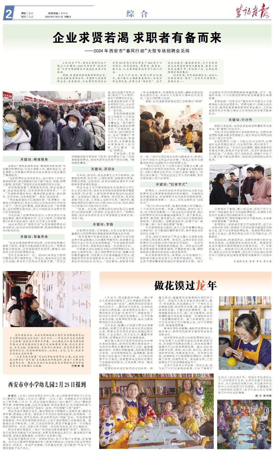 2月18日下午,西安大明宫万达广场上人头攒动,2024年西安市“春风行动”大型专场招聘系列活动在这里正式启动。 现场,隆基绿能科技股份有限公司、比亚迪股份有限公司、中国燃气控股有限公司、京东物流、万达商管陕西分公司等260家用人单位带来了6400余个工作岗位,涉及制造业、商贸业、服务业、医疗业、人力资源服务业等多个热门行业。 当天下午14时,各用人单位已就位,每个展位上都摆着桌椅和一沓岗位信息登记表,并有几名“面试官”。由于企业比较多,展区特别长,不少求职者首先来到最前面的大展板前,查看心仪的企业展位号,并记录下来,以便在现场精准找到展台。 记者发现,今年的招聘会上,企业人才需求越发“精准”,求职者手持简历,有备而来……关键词:精准服务 这场以“春风送岗促就业 精准服务助发展”为主题的招聘活动,为返乡求职人员、高校毕业生、就业困难人员等重点群体就近就业和返乡创业提供了精准服务。 “这次招聘会主办方很用心,每个展位上的用工需求很详细,通过展板我们就了解了岗位、待遇、招聘人数等,很方便。”家住附近前来求职的张女士说。 活动现场设置了政策服务咨询、职业技能培训、就业创业指导、劳务品牌展示等专区,“一对一”为求职者提供专业、精准的职业指导、岗位推介、社保咨询、劳务维权等“一条龙”就业服务。 “原来被辞退还可以拿到补偿。”张师傅在一家餐饮公司做保洁,年前公司口头告知其年后不用来上班了。“因为这件事情,我年都没过好。”张师傅说,这次招聘会没白来,开工后他就去企业维护自己的合法权益。 当天的线上直播带岗活动中,6家优质名企走进直播间,提供机械设计员、工艺工程师、行政助理等270余个就业岗位,吸引18万余人次观看。 2024年西安市“春风行动”大型专场招聘系列活动期间,全市将举办现场招聘、网络招聘等至少350场次活动。关键词:有备而来 “年前就看到招聘活动信息,过年期间我精心准备了简历,希望今天能找到合适的工作。”招聘会现场记者发现,众多求职者手持简历,穿梭在260家用人单位的招聘展位间。 王先生就是其中一位。他2022年毕业于陕西中医药大学心理学专业。“毕业后,我虽然有过几段工作实践,但与自己的专业匹配度不高。”王先生说,他之前做了很多功课,细化了个人简历,研究了招聘会的企业,就是想找到与自己专业相关的工作,在应用心理学方面,应当有自己一席之地。 王思琦和畅欣茹在工作岗位上已经实习了7个月,马上面临着就业。“我们是特意请假过来参加招聘会的。”王思琦说,实习期间,他们都很用功,也向“师傅们”学习了不少知识,但岗位有限,大家基本没有留到岗位上的可能,所以最近一直“赶”招聘会。 记者发现,王思琦和畅欣茹不但制作了简历,还特意化了妆。“虽然是现场招聘会,但首先要给对方留下好的印象。”畅欣茹笑着说。关键词:新职业 近年来,新经济、新业态催生出不少新职业,如整理收纳师、陪诊师、儿童陪伴师、健康照护师等。招聘会现场,这些灵活、自由的新职业成为不少求职者首要考虑的职业。 西安市总工会中顺家政服务有限责任公司工作人员告诉记者,很多前来咨询的求职者都对整理收纳师、陪诊师、儿童陪伴师等新职业比较感兴趣。“这些职业门槛低、学得快、相对自由,而且很多是日结工资,工资收入也相当可观。”她介绍,整理收纳师的日薪为500元到1000元之间,陪诊师的日工资是270元到380元之间。 “我是一位宝妈,选择这样的岗位我可以根据自己的时间选择上班时间,比较适合自己。”招聘会现场,住在未央区的王女士希望能通过家政培训,尽快上岗。关键词:求稳 在招聘会现场,记者看到,大型企业和科技含量高的公司招聘展位都被求职者围得水泄不通。 “我不但看中有稳定的收入,还看中企业在职业晋升通道和暖人心的福利待遇方面,我觉得在这样的企业工作有安全感获得感。”今年技校即将毕业的小王坦然,希望毕业后能找一份安稳的工作。 中航富士达科技股份有限公司招聘展位前,咨询的人络绎不绝。该公司招聘专员介绍,随着公司的高质量发展,对技能人才的需求量随之增大,现场递简历的年轻求职者有40多人,公司那边今天参加面试的就有30多人。“总的看来,求职者不是一味追求高薪水,而是理性地求稳,青睐有职业发展前景的企业,向往以人为本有人情味的企业文化。”该公司招聘人员说。 现场,有的求职者求稳还把工作和婚恋“捆绑”在一起。“你们公司的男女比例大概是多少,我想在工作中寻找个志同道合的对象。”男技工张先生郑重地询问比亚迪股份公司的招聘人员。 “我们公司工会十分关心职工的婚恋大事,通过开展形式多样的文体活动,举办青年交友联谊活动,为职工搭建交友平台,让职工感到‘娘家人’的关心就在身边。”听完比亚迪工作人员的解释,张先生愉快递上自己的简历。关键词:“拉家常式” 招聘会上,来自经济技术开发区的某大型企业招聘专员认真解答求职者的各种提问。当她通过简历遇见专业、年龄等条件较为相符的求职者时,就会和求职者多聊上一会儿,初面过程秒变“拉家常式”。 “我们公司在未央区,我看你家离公司不算远,上下班还比较方便。你是二胎妈妈,那你出来上班,孩子谁给你看啊……”通过走访记者发现,现在的招聘