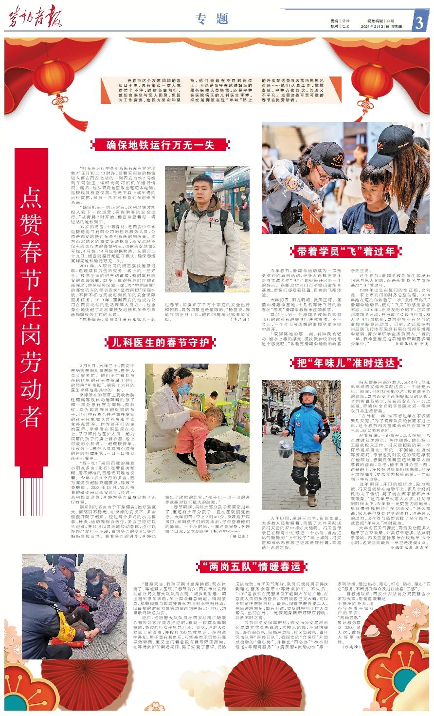 在春节这个万家团圆的喜庆日子里,总有那么一群人依然忙个不停,踔厉负重前行,他们也渴望与亲人团聚,但因为工作需要,也因为使命和坚持,他们奋战在不同的岗位上。不论是值守在地铁站场的服务保障人员杨雷,还是守护在医院病区的儿科医生李婷,抑或是奔波在送“年味”路上的外卖配送员冯天雷冯彬彬兄弟俩……他们认真工作,默默奉献,守护万家灯火,普通又不平凡。点赞这些可亲可敬的春节在岗劳动者。确保地铁运行万无一失 “机车在运行中牵引系统有没有异常现象?”正月初二10时许,背着双肩包的杨雷进入停在西安北站的一列西安地铁2号线列车驾驶室,详细询问司机机车运行情况。随后,他从双肩包里取出笔记本电脑、连接线及检查仪器,先是下载上线车辆的运行数据,然后一丝不苟检查列车的牵引系统。 “确保机车一切正常后,这列地铁才能投入到下一次运营,确保乘客的安全出行。”从清晨7时开始,杨雷排查着每一辆进站的地铁列车。 35岁的杨雷,中等身材,是西安中车永电捷通电气有限公司的售后服务人员,公司是西安地铁列车牵引系统的制造商。作为西北地区的重要交通枢纽,西安北站不仅有四通八达的高铁列车,也是西安地铁2号线、4号线、14号线的换乘站。从腊月二十九日,杨雷就履行起值守模式,确保春运高峰期地铁运行万无一失。 2011年,入职公司的杨雷强技能思进取,迅速成长为售后服务一线上的一把好手。技术全面的他主动请缨,暂时离开西安的温暖家庭,20多斤重的挎包陪伴他走南闯北,冲在服务保障一线,为“中国速度”的高铁列车的牵引系统“望闻问切”保驾护航,不折不扣地完成每列机车的安全保障服务任务。2019年,回到西安的他成为公司在西安北站的驻站保障人员之一,他全身心地挑起了北站高铁及地铁机车牵引系统保障服务工作的大梁。 “屈指算来,虽然3年没有和家人一起过春节,却换来了千万个家庭的安全出行和团圆,再苦再累也是值得的。”杨雷说,等值守到正月十五,他再回渭南老家看望父母。 (李江波)儿科医生的春节守护 2月9日,大年三十,西安中医脑病医院儿童医院里,医护人员步履匆忙。他们正忙着给留在病区里的孩子准备属于他们的特殊“年夜饭”,脑病十六科的医生李婷也是其中的一位。 李婷所在的院区主要收治脑性瘫痪等肢体功能障碍的孩子和一部分患有智力障碍、孤独症、染色体病等其他疾病的孩子,他们中有些合并严重并发症的孩子只能靠吃营养粉和半流食补充营养。作为孩子们的主治医师,李婷看在眼里疼在心上,早早和其他医护人员一起为病区的孩子们换上新衣服,送上可爱的小玩偶,一起迎接新年。年夜饭上,医护人员将精心准备的鱼肉打成糊状,一口一口喂到孩子们嘴里。 “好~吃!”来自西藏的藏族小朋友多吉(化名)吃着鱼肉糊糊,用不标准的普通话艰难地说着。今年1岁8个月的多吉,因为高烧引起脑脊髓膜炎,导致下身瘫痪。2023年12月,家人带着他辗转来到西安治疗,经过一系列检查评估,李婷为多吉量身定制了治疗方案。 刚来时的多吉由于下身瘫痪,治疗强度大,情绪很不稳定,在李婷的安抚下,多吉慢慢开朗了起来。经过两个多月的小儿推拿、针灸、运动等综合治疗,多吉已经可以坐起来,并且可以灵活地转动身体,也可以慢慢地爬行一小段,看到多吉的变化,多吉妈妈喜极而泣。看着多吉的进步,李婷也露出了欣慰的笑容,“孩子们一点一点的进步就是对我们最大的鼓励。” 春节期间,虽然大部分孩子都回家过年了,但还有少部分孩子一直在医院康复治疗。大年初四,早上7时40分,李婷推开病房门,来到孩子们的病床前,仔细查看他们的情况。一个小时后,一圈巡查完毕,李婷喝了口水,又立刻赶往了托养中心…… (骆红燕)带着学员“飞”着过年 今年春节,滑翔伞运动成为一项备受欢迎的新兴活动,许多人选择在龙年新春尝试这种“飞行”体验来开启新一年的好运。在湖北省荆门市圣镜山滑翔伞基地,游客们感受到轻盈、自由的飞翔体验。 大年初五,阳光明媚,微风正好。圣镜山滑翔伞基地,十几名等待飞行的游客在“围观”滑翔伞教练余江颖教学。 草地上,另一个滑翔伞教练给即将飞行的体验者讲解飞行注意事项。不一会儿,一个个五彩斑斓的滑翔伞便在空中展开。 “双脚离地的那一刻,有种我会轻功,能水上漂的感觉,凌波微步说的就是这个感觉吧。”体验完滑翔伞运动的游客李先生说。 这个春节,滑翔伞教练余江颖没有回家与家人团圆,而是带着13名学员在基地“飞”着过年。 1988年出生在厦门的余江颖,之前是一家上市公司的财务总监助理。2014年她在尼泊尔体验了一次“教练带你飞”滑翔伞运动后,便对“飞天”的感觉恋恋不忘。2016年,在朋友的介绍下,正式学习滑翔伞运动,并考取了C级飞行员、双人伞飞行员执照,成为业界小有名气的滑翔伞职业运动员。目前,余江颖在杭州亚联飞行体育发展有限公司担任滑翔伞培训、青少年研学业务负责人。“新的一年,我希望能把这项运动带到更多青少年中。” 全媒体记者 申美把“年味儿”准时送达 大年初四,凌晨三点半,夜色如墨,大多数人还酣睡着,而饿了么外卖配送员冯天雷的家中却灯火通明。冯天雷母亲已在厨房中忙碌近一个小时,当她把热气腾腾的“上车饺子”端上桌时,冯天雷和弟弟冯彬彬已经准备好行囊,即将踏上返岗之旅。 冯天雷