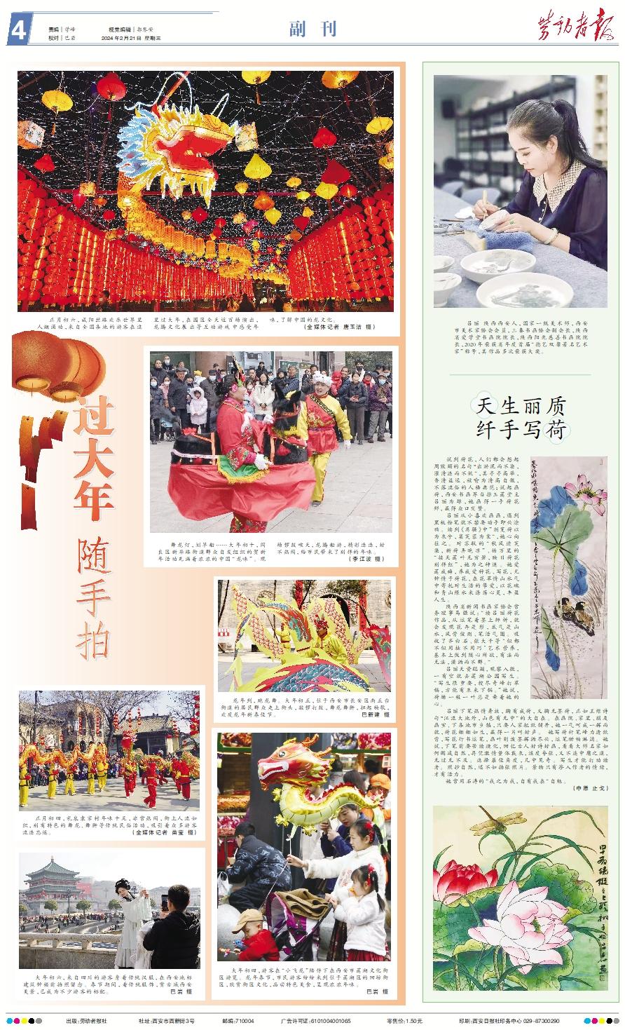 正月初六,咸阳丝路欢乐世界里人潮涌动,来自全国各地的游客在这里过大年,在园区全天近百场演出,龙腾文化展出等互动游戏中感受年味,了解中国的龙文化。 (全媒体记者 唐玉洁 摄) 舞龙灯,划旱船……大年初十,阎良区新华路街道群众自发组织的贺新年活动充满着浓浓的中国“龙味”。现场锣鼓喧天,龙腾船游,精彩连连,好不热闹,给市民带来了别样的年味。 (李江波 摄) 龙年到,跑龙舞。大年初五,位于西安市长安区南五台街道的居民群众走上街头,敲锣打鼓,舞龙舞狮,扭起秧歌,欢度龙年新春佳节。 巴新建 摄 正月初四,礼泉袁家村年味十足,非常热闹,街上人流如织,别有特色的舞龙、舞狮等传统民俗活动,吸引着众多游客流连忘返。 (全媒体记者 苗莹 摄) 大年初六,来自四川的游客身着传统汉服,在西安地标建筑钟楼前拍照留念。春节期间,着传统服饰,赏古城西安美景,已成为不少游客的标配。 巴岩 摄 大年初四,游客在“小飞龙”陪伴下在西安市莲湖文化街区游览。龙年春节,市民游客纷纷来到位于莲湖区的回坊街区,欣赏街区文化,品尝特色美食,呈现浓浓年味。 巴岩 摄