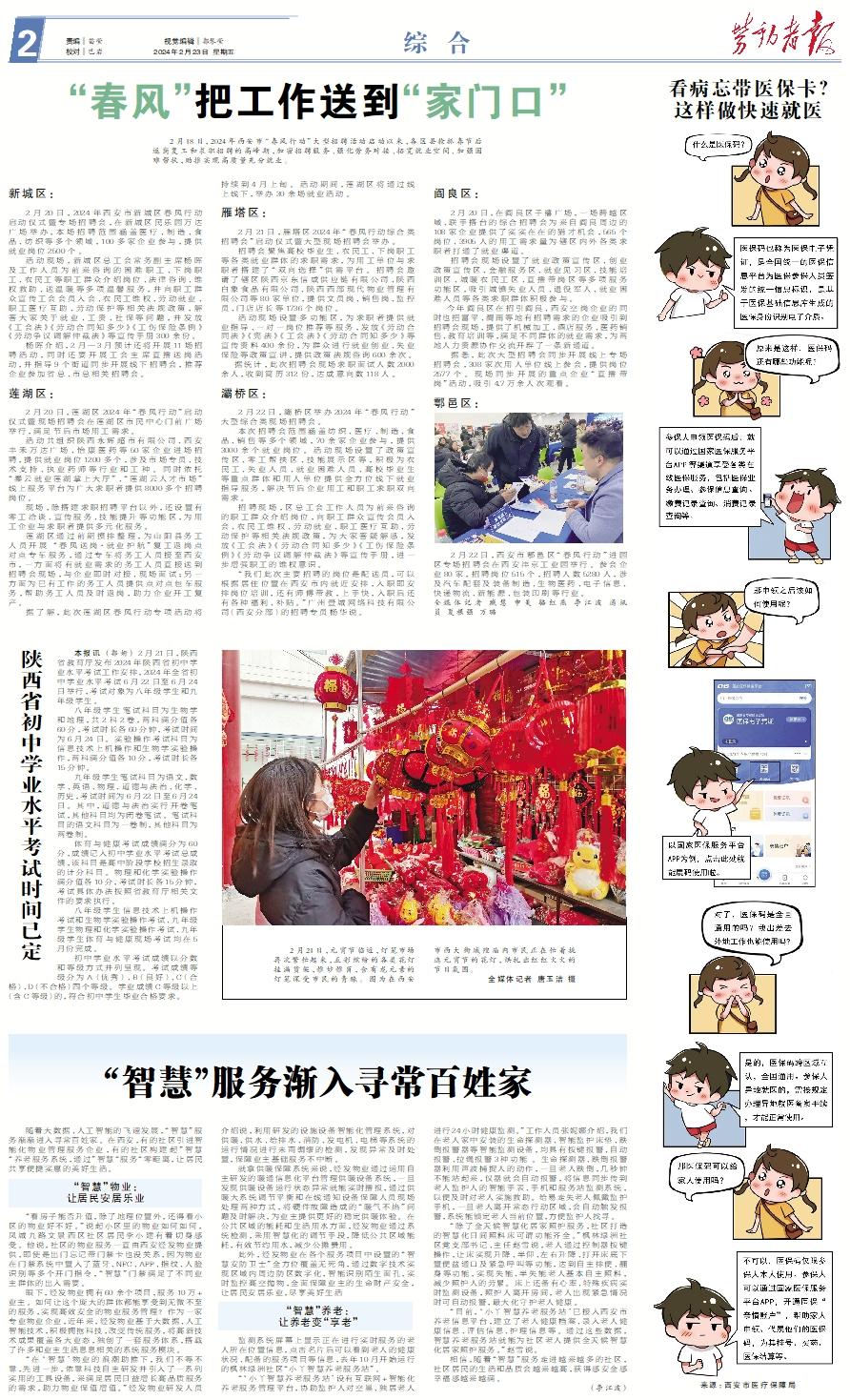 2月18日,2024年西安市“春风行动”大型招聘活动启动以来,各区县抢抓春节后返岗复工和求职招聘的高峰期,加密招聘服务、强化劳务对接、拓宽就业空间、加强困难帮扶,助推实现高质量充分就业。新城区: 2月20日,2024年西安市新城区春风行动启动仪式暨专场招聘会,在新城区民乐园万达广场举办,本场招聘范围涵盖医疗、制造、食品、纺织等多个领域,100多家企业参与,提供就业岗位2500个。 活动现场,新城区总工会常务副主席杨晖及工作人员为前来咨询的困难职工、下岗职工、农民工等职工群众介绍岗位、法律咨询、维权救助、送温暖等多项温馨服务,并向职工群众宣传工会会员入会、农民工维权、劳动就业、职工医疗互助、劳动保护等相关法规政策,解答大家关于就业、工资、社保等问题,并发放《工会法》《劳动合同知多少》《工伤保险条例》《劳动争议调解仲裁法》等宣传手册300余份。 杨晖介绍,2月—3月预计还将开展11场招聘活动,同时还要开展工会主席直播送岗活动,并指导9个街道同步开展线下招聘会,推荐企业参加省总、市总相关招聘会。莲湖区: 2月20日,莲湖区2024年“春风行动”启动仪式暨现场招聘会在莲湖区市民中心门前广场举行,满足节后市场用工需求。 活动共组织陕西永辉超市有限公司、西安丰禾万达广场、怡康医药等50家企业进场招聘,提供就业岗位1200多个,涉及市场专员、技术支持、执业药师等行业和工种。同时依托“秦云就业莲湖掌上大厅”、“莲湖云人才市场”线上服务平台为广大求职者提供8000多个招聘岗位。 现场,除搭建求职招聘平台以外,还设置有零工洽谈、宣传服务、技能提升等功能区,为用工企业与求职者提供多元化服务。 莲湖区通过前期摸排整理,为山阳县务工人员开展 “春风送岗·就业护航”复工返岗点对点专车服务,通过专车将务工人员接至西安市,一方面将有就业需求的务工人员直接送到招聘会现场,与企业即时对接、现场面试;另一方面为已有工作的务工人员提供点对点包车服务,帮助务工人员及时返岗,助力企业开工复产。 据了解,此次莲湖区春风行动专项活动将持续到4月上旬。活动期间,莲湖区将通过线上线下,举办30余场就业活动。雁塔区: 2月21日,雁塔区2024年“春风行动综合类招聘会”启动仪式暨大型现场招聘会举办。 招聘会聚焦高校毕业生、农民工、下岗职工等各类就业群体的求职需求,为用工单位与求职者搭建了“双向选择”供需平台。招聘会邀请了辖区陕西京东信成供应链有限公司、陕西白象食品有限公司、陕西西部现代物业管理有限公司等80家单位,提供文员岗、销售岗、监控员、门店店长等1736个岗位。 活动现场设置多功能区,为求职者提供就业指导、一对一岗位推荐等服务,发放《劳动合同法》《宪法》《工会法》《劳动合同知多少》等宣传资料400余份,为群众进行就业创业、失业保险等政策宣讲,提供政策法规咨询600余次。 据统计,此次招聘会现场求职面试人数2000余人,收到简历312份,达成意向数118人。灞桥区: 2月22日,灞桥区举办2024年“春风行动”大型综合类现场招聘会。 本次招聘会范围涵盖纺织、医疗、制造、食品、销售等多个领域,70余家企业参与,提供3000余个就业岗位。活动现场设置了政策宣传区、零工帮扶区、技能展示区等,积极为农民工、失业人员、就业困难人员、高校毕业生等重点群体和用人单位提供全方位线下就业指导服务,解决节后企业用工和职工求职双向需求。 招聘现场,区总工会工作人员为前来咨询的职工群众介绍岗位,向职工群众宣传会员入会、农民工维权、劳动就业、职工医疗互助、劳动保护等相关法规政策,为大家答疑解惑,发放《工会法》《劳动合同知多少》《工伤保险条例》《劳动争议调解仲裁法》等宣传手册,进一步增强职工的维权意识。 “我们此次主要招聘的岗位是配送员,可以根据居住位置在西安市内就近安排,入职即安排岗位培训,还有师傅带教,上手快,入职后还有各种福利、补贴。”广州壹城网络科技有限公司(西安分部)的招聘专员杨华说。阎良区: 2月20日,在阎良区千禧广场,一场跨越区域、联手搭台的综合招聘会为来自阎良周边的108家企业提供了实实在在的猎才机会,565个岗位、3905人的用工需求量为辖区内外各类求职者打通了就业渠道。 招聘会现场设置了就业政策宣传区、创业政策宣传区、金融服务区、就业见习区、技能培训区、城暖农民工区、直播带岗区等多项服务功能区,吸引城镇失业人员、退役军人、就业困难人员等各类求职群体积极参与。 今年阎良区在招引阎良、西安空岗企业的同时也把富平、渭南等地有招聘需求的企业吸引到招聘会现场,提供了机械加工、酒店服务、医药销售、教育培训等,满足不同群体的就业需求,为两地人力资源协作交流开辟了一条新通道。 据悉,此次大型招聘会同步开展线上专场招聘会,308家次用人单位线上参会,提供岗位2577个。现场同步开展的重点企业“直播带岗”活动,吸引4.7万余人次观看。鄠邑区: 2月22日,西安市鄠邑区“春风行动”进园区专场招聘会在西安沣京工业园举行。参会企业80家,招聘岗位515个,招聘人数5280人,涉及汽车配套及装备制造、生物医药、电子信息、快递物流、新能源、包装印刷等行业。 全媒体记者 臧慧 申美 骆红燕 李江波 通讯员 夏根强 万璐