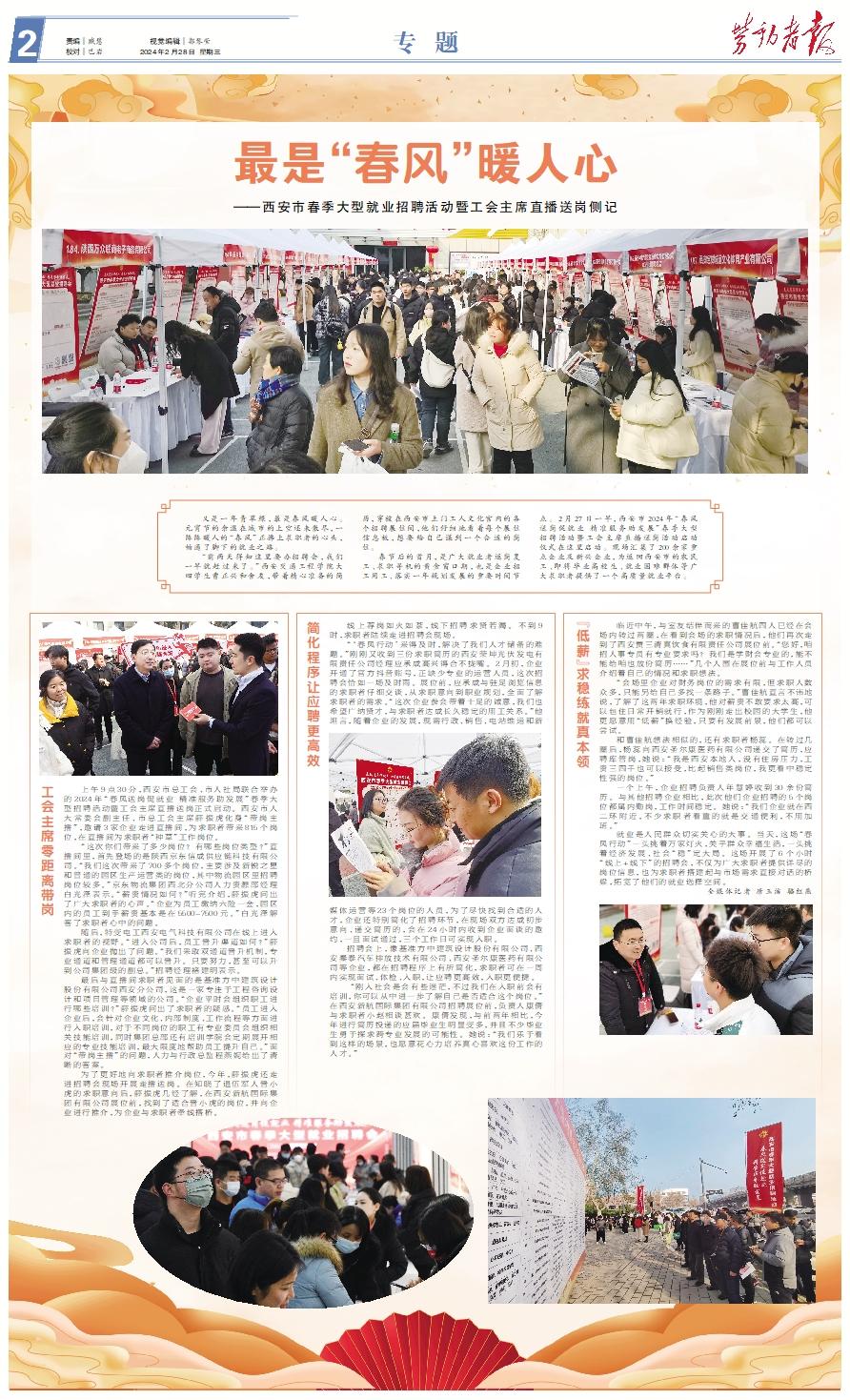 又是一年青草绿,最是春风暖人心。元宵节的余温在城市的上空还未散尽,一阵阵暖人的“春风”正拂上求职者的心头,畅通了脚下的就业之路。 “前两天得知这里要办招聘会,我们一早就赶过来了。”西安交通工程学院大四学生曹正兴和舍友,带着精心准备的简历,穿梭在西安市土门工人文化宫内的各个招聘展位间,他们仔细地看着每个展位信息板,想要给自己谋到一个合适的岗位。 春节后的首月,是广大就业者返岗复工、求职寻机的黄金窗口期,也是企业招工用工、落实一年规划发展的重要时间节点。2月27日一早,西安市2024年“春风送岗促就业 精准服务助发展”春季大型招聘活动暨工会主席直播送岗活动启动仪式在这里启动。现场汇集了200余家重点企业及新兴企业,为返回西安市的农民工、即将毕业高校生、就业困难群体等广大求职者提供了一个高质量就业平台。 工会主席零距离带岗 上午9点30分,西安市总工会、市人社局联合举办的2024年“春风送岗促就业 精准服务助发展”春季大型招聘活动暨工会主席直播送岗正式启动。西安市人大常委会副主任、市总工会主席薛振虎化身“带岗主播”,邀请3家企业走进直播间,为求职者带来815个岗位,在直播间为求职者“种草”工作岗位。 “这次你们带来了多少岗位?有哪些岗位类型?”直播间里,首先登场的是陕西京东信成供应链科技有限公司。“我们这次带来了700多个岗位,主要涉及新锐之星和普通的园区生产运营类的岗位,其中物流园区里招聘岗位较多。”京东物流集团西北分公司人力资源部经理白光泽表示。“薪资情况如何?”听完介绍,薛振虎问出了广大求职者的心声。“企业为员工缴纳六险一金,园区内的员工到手薪资基本是在5500-7500元。”白光泽解答了求职者心中的问题。 随后,特变电工西安电气科技有限公司在线上进入求职者的视野。“进入公司后,员工晋升渠道如何?”薛振虎向企业抛出了问题。“我们采取双通道晋升机制,专业通道和管理通道都可以晋升。只要努力,甚至可以升到公司集团级的副总。”招聘经理褚建明表示。 最后与直播间求职者见面的是基准方中建筑设计股份有限公司西安分公司,这是一家专注于工程咨询设计和项目管理等领域的公司。“企业平时会组织职工进行哪些培训?”薛振虎问出了求职者的疑惑。“员工进入企业后,会针对企业文化、内部制度、工作流程等方面进行入职培训,对于不同岗位的职工有专业委员会组织相关技能培训,同时集团总部还有培训学院会定期展开相应的专业技能培训,最大限度地帮助员工提升自己。”面对“带岗主播”的问题,人力与行政总监程燕妮给出了清晰的答案。 为了更好地向求职者推介岗位,今年,薛振虎还走进招聘会现场开展走播送岗。在知晓了退伍军人晋小虎的求职意向后,薛振虎几经了解,在西安新航国际集团有限公司展位前,找到了适合晋小虎的岗位,并向企业进行推介,为企业与求职者牵线搭桥。简化程序让应聘更高效 线上荐岗如火如荼,线下招聘求贤若渴。不到9时,求职者陆续走进招聘会现场。 “‘春风行动’来得及时,解决了我们人才储备的难题。”刚刚又收到三份求职简历的西安荣坤光伏发电有限责任公司经理应承成高兴得合不拢嘴。2月初,企业开通了官方抖音账号,正缺少专业的运营人员,这次招聘会恰如一场及时雨。展位前,应承成与驻足浏览信息的求职者仔细交谈,从求职意向到职业规划,全面了解求职者的需求。“这次企业参会带着十足的诚意,我们也希望广纳贤才,与求职者达成长久稳定的用工关系。”他坦言,随着企业的发展,现需行政、销售、电站维运和新媒体运营等23个岗位的人员,为了尽快找到合适的人才,企业还特别简化了招聘环节,在现场双方达成初步意向、递交简历的,会在24小时内收到企业面谈的邀约,一旦面试通过,三个工作日可实现入职。 招聘会上,像基准方中建筑设计股份有限公司、西安秦泰汽车排放技术有限公司、西安圣尔康医药有限公司等企业,都在招聘程序上有所简化,求职者可在一周内实现面试、体检、入职,让应聘更高效,入职更便捷。 “刚入社会是会有些迷茫,不过我们在入职前会有培训,你可以从中进一步了解自己是否适合这个岗位。”在西安新航国际集团有限公司招聘展位前,负责人康倩与求职者小赵相谈甚欢。康倩发现,与前两年相比,今年进行简历投递的应届毕业生明显变多,并且不少毕业生勇于探求跨专业发展的可能性。她说:“我们乐于看到这样的场景,也愿意花心力培养真心喜欢这份工作的人才。”“低薪”求稳练就真本领 临近中午,与室友结伴而来的曹佳航四人已经在会场内转过两圈,在看到会场的求职情况后,他们再次走到了西安贾三清真饮食有限责任公司展位前。“您好,咱招人事专员有专业要求吗?我们是学财会专业的,能不能给咱也放份简历……”几个人围在展位前与工作人员介绍着自己的情况和求职想法。 “会场里企业对财务岗位的需求有限,但求职人数众多,只能另给自己多找一条路子。”曹佳航直言不讳地说,了解了这两年求职环境,他对薪资不敢要求太高,可以包住日常开销就行,作为刚刚走出校园的大学生,他更愿意用“低薪”换经验,只要有发展前景,他们都可以尝试。 和曹佳航想法相似的,还有求职者杨蕊。在转过几圈后,杨蕊向西安圣尔康