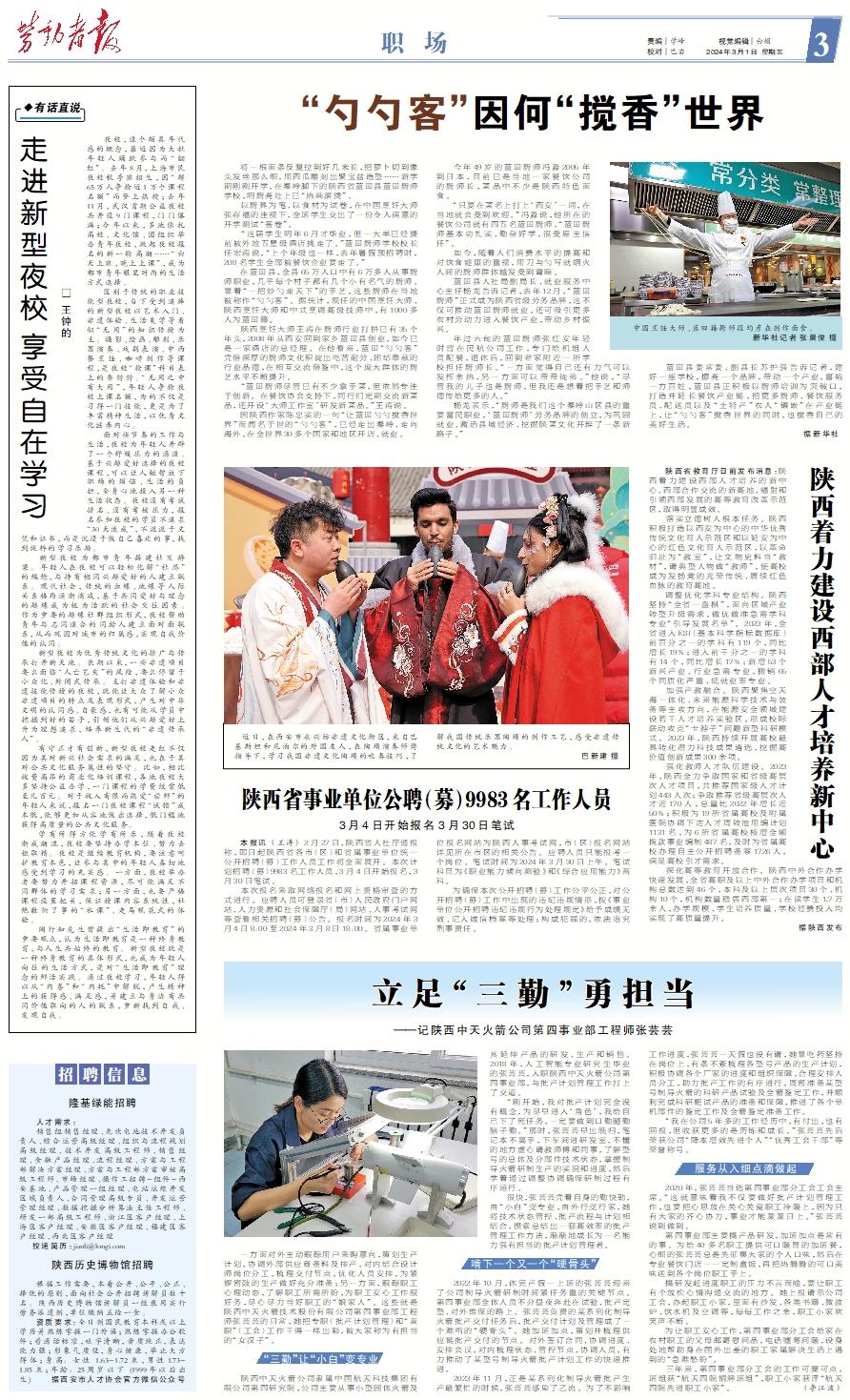 中国烹饪大师、蓝田籍厨师段均彦在制作面食。 新华社记者 张晨俊 摄 将一根面条反复拉到好几米长,把萝卜切到像头发丝那么细,用西瓜雕刻出聚宝盆造型……新学期刚刚开学,在秦岭脚下的陕西省蓝田县蓝田厨师学校,明厨亮灶上已“热辣滚烫”。 以厨具为笔、以食材为试卷,在中国烹饪大师张存福的注视下,全班学生交出了一份令人满意的开学测试“答卷”。 “这届学生明年6月才毕业,但一大半已经提前被外地五星级酒店挑走了。”蓝田厨师学校校长任宏涛说,“上个年级也一样,去年暑假预招聘时,208名学生全部被餐饮企业要走了。” 在蓝田县,全县65万人口中有6万多人从事厨师职业,几乎每个村子都有几个小有名气的厨师。靠着“一把炒勺走天下”的手艺,这些厨师在当地被称作“勺勺客”。据统计,现任的中国烹饪大师、陕西烹饪大师和中式烹调高级技师中,有1000多人为蓝田籍。 陕西烹饪大师王涛在厨师行业打拼已有35个年头,2008年从西安回到家乡蓝田县创业,如今已是一家酒店的总经理。在他看来,蓝田“勺勺客”凭借深厚的厨师文化积淀出吃苦耐劳、团结奉献的行业品德,在相互交流借鉴中,这个庞大群体的厨艺水平不断提升。 “蓝田厨师尽管已有不少拿手菜,但依然专注于创新。在餐饮协会支持下,同行们定期交流新菜品,还开设‘大师工作室’研发新菜品。”王涛说。 因陕西作家陈忠实的一句“让蓝田勺勺搅香世界”而闻名于世的“勺勺客”,已经走出秦岭、走向海外,在全世界30多个国家和地区开店、就业。 今年49岁的蓝田厨师冯淼2005年到日本,目前已是当地一家餐饮公司的厨师长,菜品中不少是陕西特色面食。 “只要在菜名上打上‘西安’一词,在当地就会受到欢迎。”冯淼说,他所在的餐饮公司就有四五名蓝田厨师,“蓝田厨师基本功扎实、勤奋好学,很受雇主信任”。 如今,随着人们消费水平的提高和对饮食健康的重视,用刀与勺写就烟火人间的厨师群体越发受到青睐。 蓝田县人社局副局长、就业服务中心主任杨龙告诉记者,去年12月,“蓝田厨师”正式成为陕西省级劳务品牌,这不仅可推动蓝田厨师就业,还可吸引更多农村劳动力进入餐饮产业,带动乡村振兴。 年过六旬的蓝田厨师张红安年轻时曾在民航公司工作,专门给机组人员配餐,退休后,回到老家附近一所学校担任厨师长。“一方面觉得自己还有力气可以发挥余热,另一方面可以带带徒弟。”他说,“尽管我的儿子也是厨师,但我还是想着把手艺和师德传给更多的人。” 杨龙表示,“厨师是我们这个秦岭山区县的重要富民职业,‘蓝田厨师’劳务品牌的创立,为巩固就业、激活县域经济、挖掘陕菜文化开辟了一条新路子。” 蓝田县委常委、副县长苏护强告诉记者,建好一座学校,擦亮一个品牌,带动一个产业,富裕一方百姓,蓝田县正积极以厨师培训为突破口,打造并延长餐饮产业链,把更多厨师、餐饮服务员、配送员以及“土特产”农人“镶嵌”在产业链上,让“勺勺客”搅香世界的同时,也搅香自己的美好生活。 据新华社