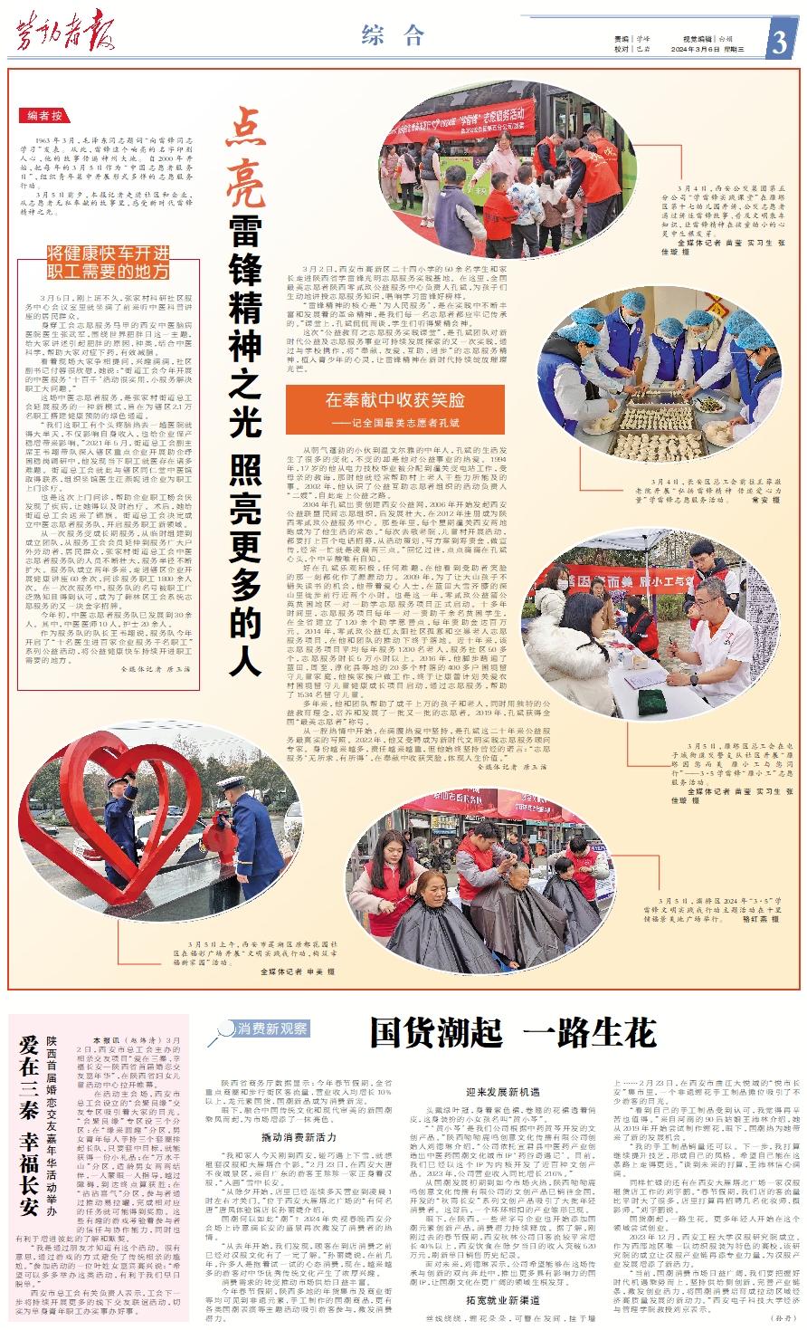 编者按 1963年3月,毛泽东同志题词“向雷锋同志学习”发表。从此,雷锋这个响亮的名字印刻人心,他的故事传遍神州大地。自2000年开始,把每年的3月5日作为“中国志愿者服务日”,组织青年集中开展形式多样的志愿服务行动。 3月5日前夕,本报记者走进社区和企业,从志愿者无私奉献的故事里,感受新时代雷锋精神之光。将健康快车开进职工需要的地方 3月5日,刚上班不久,张家村科研社区服务中心会议室里就坐满了前来听中医科普讲座的居民群众。 身穿工会志愿服务马甲的西安中医脑病医院医生张武军,围绕世界肥胖日这一主题,给大家讲述引起肥胖的原因、种类,结合中医科学,帮助大家对症下药,有效减脂。 看着现场大家争相提问,兴趣满满,社区副书记付蓉很欣慰,她说:“街道工会今年开展的中医服务‘十百千’活动很实用,小服务解决职工大问题。” 这场中医志愿者服务,是张家村街道总工会延展服务的一种新模式,旨在为辖区2.1万名职工搭建健康预防的绿色通道。 “我们这职工有个头疼脑热去一趟医院就得大半天,不仅影响自身收入,也给企业保产稳增带来影响。”2021年5月,街道总工会副主席王韦翔带队深入辖区重点企业开展助企纾困稳岗调研中,他发现当下职工就医存在诸多难题。街道总工会就此与辖区同仁堂中医馆取得联系,组织坐馆医生汪燕妮进企业为职工上门诊疗。 也是这次上门问诊,帮助企业职工杨会侠发现了疾病,让她得以及时治疗。术后,她给街道总工会送来了锦旗。街道总工会决定成立中医志愿者服务队,开启服务职工新领域。 从一次服务变成长期服务,从临时组建到成立团队,从服务工会会员延伸到服务广大户外劳动者、居民群众,张家村街道总工会中医志愿者服务队的人员不断壮大,服务半径不断扩大。服务队成立两年多来,走进辖区企业开展健康讲座60余次,问诊服务职工1800余人次。在一次次服务中,服务队的名号被职工广泛熟知且得到认可,成为了碑林区工会系统志愿服务的又一块金字招牌。 今年初,中医志愿者服务队已发展到30余人。其中,中医医师10人,护士20余人。 作为服务队的队长王韦翔说,服务队今年开启了“十名医生进百家企业服务千名职工”系列公益活动,将公益健康快车持续开进职工需要的地方。 全媒体记者 唐玉洁在奉献中收获笑脸——记全国最美志愿者孔斌 3月2日,西安市高新区二十四小学的50余名学生和家长走进陕西省学雷锋光明志愿服务实践基地。在这里,全国最美志愿者陕西零贰玖公益服务中心负责人孔斌,为孩子们生动地讲授志愿服务知识,唱响学习雷锋好榜样。 “雷锋精神的核心是‘为人民服务’,是在实践中不断丰富和发展着的革命精神,是我们每一名志愿者都应牢记传承的。”课堂上,孔斌侃侃而谈,学生们听得聚精会神。 这次“公益教育之志愿服务实践课堂”,是孔斌团队对新时代公益及志愿服务事业可持续发展探索的又一次实践,通过与学校携作,将“奉献、友爱、互助、进步”的志愿服务精神,植入青少年的心灵,让雷锋精神在新时代持续绽放璀璨光芒。 从朝气蓬勃的小伙到温文尔雅的中年人,孔斌的生活发生了很多的变化,不变的却是他对公益事业的热爱。1994年,17岁的他从电力技校毕业被分配到潼关变电站工作,受母亲的教诲,那时他就经常帮助村上老人干些力所能及的事。2002年,他认识了公益互助志愿者组织的活动负责人“二嫂”,自此走上公益之路。 2004年孔斌出资创建西安公益网,2006年开始发起西安公益联盟民间志愿组织,后发展壮大,在2012年注册成为陕西零贰玖公益服务中心。那些年里,每个星期潼关西安两地跑成为了他生活的常态。“每次去敬老院、儿童村开展活动,都要打上百个电话招募,从活动策划、写方案到筹资金、做宣传,经常一忙就是凌晨两三点。”回忆过往,点点滴滴在孔斌心头,个中辛酸唯有自知。 好在孔斌乐观积极,任何难题,在他看到受助者笑脸的那一刻都化作了源源动力。2009年,为了让大山孩子不错失读书的机会,他带着爱心人士,在蓝田大雪齐膝的深山里徒步前行近两个小时。也是这一年,零贰玖公益蒲公英贫困地区一对一助学志愿服务项目正式启动。十多年时间里,志愿服务项目每年一对一资助千余名贫困学生,在全省建立了120余个助学慈善点,每年资助金达百万元。2014年,零贰玖公益红太阳社区孤寡和空巢老人志愿服务项目,在他和团队的推动下终于落地。近十年来,该志愿服务项目平均每年服务1200名老人,服务社区50多个,志愿服务时长5万小时以上。2016年,他脚步踏遍了蓝田、周至、淳化县等地的20多个村落的400多户困境留守儿童家庭,他挨家挨户做工作,终于让康蕾计划关爱农村困境留守儿童健康成长项目启动,通过志愿服务,帮助了1534名留守儿童。 多年来,他和团队帮助了成千上万的孩子和老人,同时用独特的公益教育理念,培养和发展了一批又一批的志愿者。2019年,孔斌获得全国“最美志愿者”称号。 从一腔热情中开始,在满腹热爱中坚持,是孔斌这二十年来公益服务最真实的写照。2022年,他又受聘成为新时代文明实践志愿服务顾问专家。身份越来越多,责任越来越重,但他始终坚持曾经的诺言:“志愿服务‘无所求、有所得’,在奉献中收获笑脸,体现人生价值。” 全媒体记者 唐玉洁 3月4日,西安公交集团第五分公司“学雷锋实践课堂”在雁塔