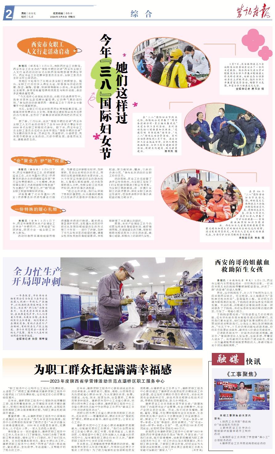 西安市女职工人文行走活动启动 本报讯 (顾思远) 3月6日,由陕西省总工会指导,西安市总工会主办的“致敬巾帼劳动者”西安市女职工人文行走活动启动仪式在陕西张裕瑞那城堡酒庄举行。西安市总工会经费审查委员会主任、女职工委员会主任宋军出席活动。 现场打卡处吸引了在场众多女职工拍照留念。随后,女职工们纷纷步入酒庄大道,积极参与沿途的射箭、投壶、蹴鞠、套圈、保龄球等趣味小游戏,并走进酒庄主城堡,参观张裕葡萄酒相关展览与制作流程,品尝多款精品葡萄酒。 “今天很开心来到此次活动,在刚才的品酒环节中,我非常喜欢这款低醇白葡萄酒,它的香气真的很特别。”参加活动的新城区西一路街道工会干部李女士拿着手中的高脚杯说。 当天,女职工们还前往陕西历史博物馆秦汉馆,近距离欣赏珍贵的出土文物,观看通过虚拟现实技术还原的古代场景,全方位了解秦汉时期陕西绚烂的历史文化。 据了解,三月以来,此次“致敬巾帼劳动者”西安市女职工人文行走活动吸引了全市500多家企事业单位6000余名女职工积极报名参与。接下来,西安市总工会女职工委员会还将在全市开展以“致敬巾帼劳动者”为主题的创先争优、普法宣传、关爱慰问、公益课堂、风采展示和联谊交友活动,共话巾帼发展、感受历史文化、提高品质生活。“会”聚全力 护“她”权益 本报讯 (骆红燕) 3月5日下午,西安市灞桥区总工会、纺织城街道总工会、北京市盈科(西安)律师事务所联合在纺织城街道开展“学习宣传贯彻党的二十大精神,依法保障女职工合法权益和特殊利益”为主题的“会”聚全力,护“她”权益女职工权益保障知识讲座。 讲座邀请了北京市盈科(西安)律师事务所律师马潇进行授课。马潇通过讲解理论知识、剖析案例、互动交流相结合的方式,围绕妇女权益保障法的主要内容,从六个方面宣传解读妇女的政治权利、人身和人格权益等,结合典型案例深入分析,传授女职工运用法律知识,维护自身合法权益。 “通过这次讲座,我们认识到了维权的重要性,以后遇到问题我们会用法律武器维护自身的合法权益,努力做知法、懂法、守法的合法公民。”参与此次活动的女职工纷纷表示。 活动现场,区总工会还设置了法律宣传咨询台,向女职工发放了《妇女权益保障法》等宣传资料,为女职工释法解惑,进一步提升女职工的法律意识,深化女职工法治宣传教育,增强依法维护自身合法权益的能力和水平。一份特殊的暖心礼物 本报讯 (宗和) 3月5日下午,西安市雁塔区未来产业城总工会举办“巾帼同行,共享健康”知识讲座,园区企业一线女职工30余人参加。 活动特邀国家高级健康管理师高敏老师进行授课。高老师从紧急救护知识、女性重大疾病的早期征兆及预防和健康的生活方式等三个方面一一进行了讲解,剖析了当代女性常见的健康问题,提高女性朋友关注自身健康意识,并现场解答了大家提出的疑问。 据悉,未来产业城总工会今后将更加关注自身健康状况、做好情绪管理,养成健康生活习惯,保持积极稳定和乐观向上的生活态度,做身心健康、积极向上的新时代女性。 3月7日,长安路街道总工会向辖区女性劳动者送去了一系列关爱服务。联合西安交通大学口腔医院为女职工开展口腔健康义诊及科普讲座,向新业态女性劳动者送上护肤用品,组织女职工开展剪窗花等活动,增强节日氛围,丰富女职工健康文化生活。 全媒体记者 唐玉洁 摄 在“三八”国际妇女节到来之际,西煤机公司开展了“踔厉奋进新征程·勇立潮头展风采”关爱女职工系列活动。系列活动包括心理健康知识讲座、“党建引领 书香玫瑰”读书会、“庆三八”趣味运动会等活动。系列活动将持续到3月下旬。通过女职工合法权益宣传、女职工特殊疾病保险、女职工岗位建新功等活动,深耕文化建设、助力提素建功。 郭军凤 摄 在第114个“三八”国际劳动妇女节来临之际,碑林区文艺路街道总工会组织辖区保洁员代表、商场信息员代表、社区工作者代表等50余人开展了守护女性健康——宫颈癌疾病预防知识专题讲座。西北妇女儿童医院健康教育科蔡文娟为加深大家对相关内容的记忆与理解,通过有奖问答形式,对参与人员发放定制健康礼品,全面守护女性同胞的身体健康。 本报通讯员 常来 摄