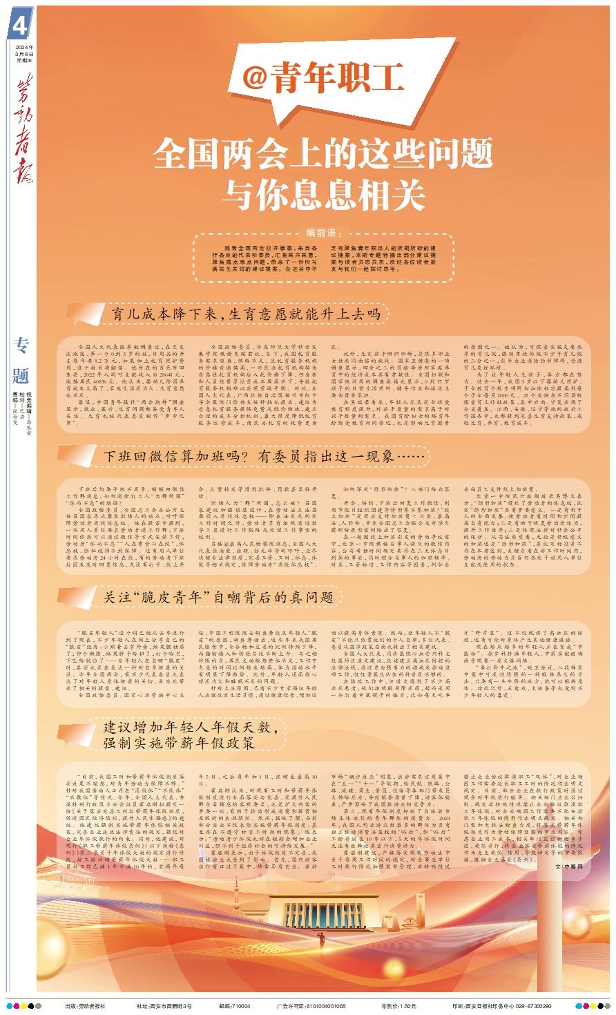 随着全国两会拉开帷幕,来自各行各业的代表和委员,汇集民声民意,聚焦痛点难点问题,带来了一份份写满民生关切的建议提案。在这其中不乏有聚焦青年职场人的所期所盼的建议提案,本期专题特摘出部分建议提案与读者共思共享,欢迎各位读者朋友与我们一起探讨思考。育儿成本降下来,生育意愿就能升上去吗 全国人大代表陆弟敏调查过,在欠发达地区,养一个0到3岁的娃,日用品的开支每年要1.2万元,如果加上托育照护费用,这个数目要翻倍。他所在的百色市田东县,2022年人均可支配收入为28641元,城镇居民40836元。他认为,婴幼儿阶段养育成本太高了,家庭生活压力大,生育意愿也不足。 最近,中国青年报社“两会期待”调查显示,就业、医疗、生育问题都备受青年人关注。生育也被代表委员视作“重中之重”。 全国政协委员、华东师范大学社会发展学院教授吴瑞君说,当下,我国托育服务需求旺盛,供给不足,且托育服务机构的价格普遍偏高,一些民办托育机构转为普惠性托育机构后入托价格下降,但房租和人员经费等运营成本居高不下,导致托育服务机构难以实现营收平衡。对此,全国人大代表、广西壮族自治区梧州市红十字会医院门诊部主任钟灿也提出,建议为普惠托育服务提供免费或低价场地,建立合理的成本分担机制,最大限度降低托育服务运营成本,使民办托育的收费更亲民。 此外,生完孩子回归职场,是很多职业女性共同面临的挑战。国家卫健委的一项调查显示,四分之三的育龄母亲对家庭养育中的经济成本具有贡献性。全国妇联和国家统计局的调查数据也显示,0到17岁孩子的日常生活照料、辅导作业和接送主要由母亲承担。 在吴瑞君看来,年轻人尤其是女性受教育程度提升,对孩子质量的需求高于对孩子数量的需求。我国育龄妇女的婚育年龄随受教育时间推迟,也是影响生育因素的原因之一。她认为,可探索实施夫妻共享的育儿假,强制男性休假不少于育儿假的三分之一,引导企业消除隐形障碍,营造育儿友好环境。 为了让年轻人生孩子,各方都在努力。过去一年,我国3岁以下婴幼儿照护、子女教育个税专项附加扣除标准提高到每个子女每月2000元。21个省份在不同层级探索育儿补贴政策,其中云南、宁夏实现了全省覆盖。江西、安徽、辽宁等地的政府工作报告中,也都提到完善生育支持政策,减轻生育、养育、教育成本。下班回微信算加班吗?有委员指出这一现象…… 下班后仍要手机不离手,频频回微信工作群消息,如何消除打工人“为群所困”“休而不息”的烦恼? 全国政协委员、全国总工会办公厅主任吕国泉再次聚焦职场人的痛点,呼吁保障劳动者离线休息权。他在提案中提到,一些用人单位要求劳动者进工作群,下班时间依然可以通过微信等方式安排工作,劳动者“休而不息”“人在曹营心在汉”,休息权、隐私权得不到保障。还有用人单位要求劳动者24小时在线,有的劳动者下班后因未及时回复信息,或没有打卡、线上开会、点赞转发等遭到批评、罚款甚至被开除。 职场人为“群”所困,怎么破?吕国泉建议加强顶层设计,在劳动法立法层面引入离线休息权——即在法定或约定工作时间之外,劳动者享有拒绝通过数字工具进行工作联络或处理工作事宜的权利。 另据@最高人民检察院消息,全国人大代表张海荣、张晓、孙元华等均呼吁,应尽快健全法律制度,完善工资、工时、休息、休假等相关规定,保障劳动者“离线休息权”。 如何界定“隐形加班”?三部门给出答复。 开会、培训、下班后回复工作微信、利用节假日组织团建等情形算不算加班?“线上加班”是否应支付加班费?日前,最高法、人社部、中华全国总工会联合发布涉欠薪纠纷典型案例给出了答复。 在一起因线上加班引发的劳动争议案中,北京一中院根据当事人提交的微信内容、公司考勤时间确定其存在三天休息日到岗的事实,同时综合当事人的加班频率、时长、工资标准、工作内容等因素,判令企业向员工支付线上加班费。 北京一中院民六庭副庭长吴博文表示,“隐形加班”侵犯了劳动者的休息权,认定“隐形加班”具有重要意义。一是有利于人的全面发展,使劳动者有时间和空间提高自身能力;二是有助于恢复劳动者体力,提升工作效率;三是体现法律对社会公平的保护。从司法角度看,无论是传统意义的加班还是“隐形加班”,其认定标准并不存在本质区别,关键是看在非工作时间内,劳动者的劳动力是否仍然处于被用人单位支配或使用的状态。关注“脆皮青年”自嘲背后的真问题 “脆皮年轻人”这个词已经从去年流行到了现在,不少年轻人在网上分享自己的“脆皮”经历:小跑着去拿外卖,结果腿抽筋了;伸个懒腰,结果脖子给扭了;打个哈欠,下巴给脱臼了……当年轻人在自嘲“脆皮”时,其实也是在表达一种对自身健康的关注。今年全国两会,有不少代表委员也表达了对年轻人身体健康的关切,并为此带来了相关的提案、建议。 全国政协委员、国家心血管病中心主任、中国工程院院士胡盛寿谈及年轻人“脆皮”的原因,胡盛寿指出,近些年来我国居民膳食中,全谷物和豆类的比例持续下降,而脂肪摄入和供能占比不断上升。与之相伴随的是,居民主动锻炼整体不足,工作中久坐的时间比例越来越高,体力活动水平有明显下降趋势。此外,年轻人还面临心理压力大和睡眠不足的问