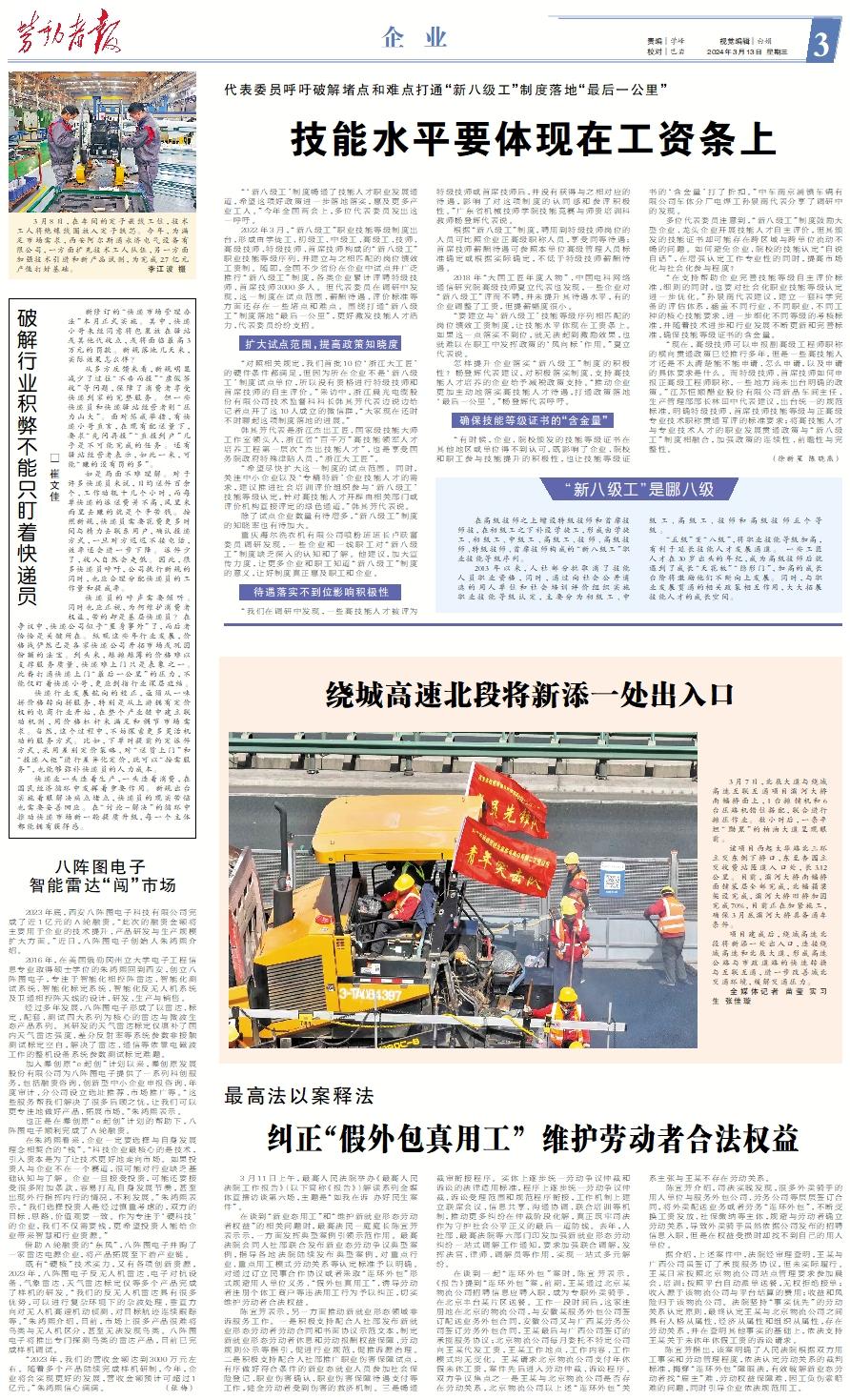 “‘新八级工’制度畅通了技能人才职业发展通道,希望这项好政策进一步落地落实,惠及更多产业工人。”今年全国两会上,多位代表委员发出这一呼吁。 2022年3月,“新八级工”职业技能等级制度出台,形成由学徒工、初级工、中级工、高级工、技师、高级技师、特级技师、首席技师构成的“新八级工”职业技能等级序列,并建立与之相匹配的岗位绩效工资制。随即,全国不少省份在企业中试点并广泛推行“新八级工”制度,各类企业累计评聘特级技师、首席技师3000多人。但代表委员在调研中发现,这一制度在试点范围、薪酬待遇、评价标准等方面还存在一些堵点和难点。围绕打通“新八级工”制度落地“最后一公里”,更好激发技能人才活力,代表委员纷纷支招。扩大试点范围,提高政策知晓度 “对照相关规定,我们首批10位‘浙江大工匠’的硬件条件都满足,但因为所在企业不是‘新八级工’制度试点单位,所以没有资格进行特级技师和首席技师的自主评价。”采访中,浙江晨光电缆股份有限公司技术监督科科长韩其芳代表边说边给记者点开了这10人成立的微信群,“大家现在还时不时聊起这项制度落地的进展。” 韩其芳代表是浙江杰出工匠、国家级技能大师工作室领头人、浙江省“百千万”高技能领军人才培养工程第一层次“杰出技能人才”,也是享受国务院政府特殊津贴人员、“浙江大工匠”。 “希望尽快扩大这一制度的试点范围。同时,关注中小企业以及‘专精特新’企业技能人才的需求,建议推进社会培训评价组织参与‘新八级工’技能等级认定,针对高技能人才开辟由相关部门或评价机构直接评定的绿色通道。”韩其芳代表说。 除了试点企业数量有待增多,“新八级工”制度的知晓率也有待加大。 重庆海尔洗衣机有限公司喷粉班班长卢跃富委员调研发现,一些企业和一线职工对“新八级工”制度缺乏深入的认知和了解。他建议,加大宣传力度,让更多企业和职工知道“新八级工”制度的意义,让好制度真正惠及职工和企业。待遇落实不到位影响积极性 “我们在调研中发现,一些高技能人才被评为特级技师或首席技师后,并没有获得与之相对应的待遇,影响了对这项制度的认同感和参评积极性。”广东省机械技师学院技能竞赛与师资培训科教师杨登辉代表说。 根据“新八级工”制度,聘用到特级技师岗位的人员可比照企业正高级职称人员,享受同等待遇;首席技师薪酬待遇可参照本单位高级管理人员标准确定或根据实际确定,不低于特级技师薪酬待遇。 2018年“大国工匠年度人物”、中国电科网络通信研究院高级技师夏立代表也发现,一些企业对“新八级工”评而不聘,并未提升其待遇水平,有的企业调整了工资,但提薪幅度很小。 “要建立与‘新八级工’技能等级序列相匹配的岗位绩效工资制度,让技能水平体现在工资条上。如果这一点落实不到位,就无法起到激励效果,也就难以在职工中发挥政策的‘风向标’作用。”夏立代表说。 怎样提升企业落实“新八级工”制度的积极性?杨登辉代表建议,对积极落实制度、支持高技能人才培养的企业给予减税政策支持。“推动企业更加主动地落实高技能人才待遇,打通政策落地‘最后一公里’。”杨登辉代表呼吁。确保技能等级证书的“含金量” “有时候,企业、院校颁发的技能等级证书在其他地区或单位得不到认可,既影响了企业、院校和职工参与技能提升的积极性,也让技能等级证书的‘含金量’打了折扣。”中车南京浦镇车辆有限公司车体分厂电焊工孙景南代表分享了调研中的发现。 多位代表委员注意到,“新八级工”制度鼓励大型企业、龙头企业开展技能人才自主评价,但其颁发的技能证书却可能存在跨区域与跨单位流动不畅的问题。如何避免企业、院校的技能认定“自说自话”,在增强认定工作专业性的同时,提高市场化与社会化参与程度? “在支持帮助企业完善技能等级自主评价标准、细则的同时,也要对社会化职业技能等级认定进一步优化。”孙景南代表建议,建立一套科学完备的评估体系,涵盖不同行业、不同职业、不同工种的核心技能要求,进一步细化不同等级的考核标准,并随着技术进步和行业发展不断更新和完善标准,确保技能等级证书的含金量。 “现在,高级技师可以申报副高级工程师职称的横向贯通政策已经推行多年,但是一些高技能人才还是不太清楚能不能申请、怎么申请,以及申请的具体要求是什么。而特级技师、首席技师如何申报正高级工程师职称,一些地方尚未出台明确的政策。”江苏恒顺醋业股份有限公司新品车间主任、生产管理部部长林田中代表建议,出台统一的规范标准,明确特级技师、首席技师技能等级与正高级专业技术职称贯通互评的标准要求;将高技能人才与专业技术人才的职业发展贯通政策与“新八级工”制度相融合,加强政策的连续性、前瞻性与完整性。 (徐新星 陈晓燕)“新八级工”是哪八级 在高级技师之上增设特级技师和首席技师技,在初级工之下补设学徒工,形成由学徒工、初级工、中级工、高级工、技师、高级技师、特级技师、首席技师构成的“新八级工”职业技能等级序列。 2013年以来,人社部分批取消了技能人员职业资格,同时,通过向社会公开遴选的用人单位和社会培训评价组织实施职业技能等级认定,主要分为