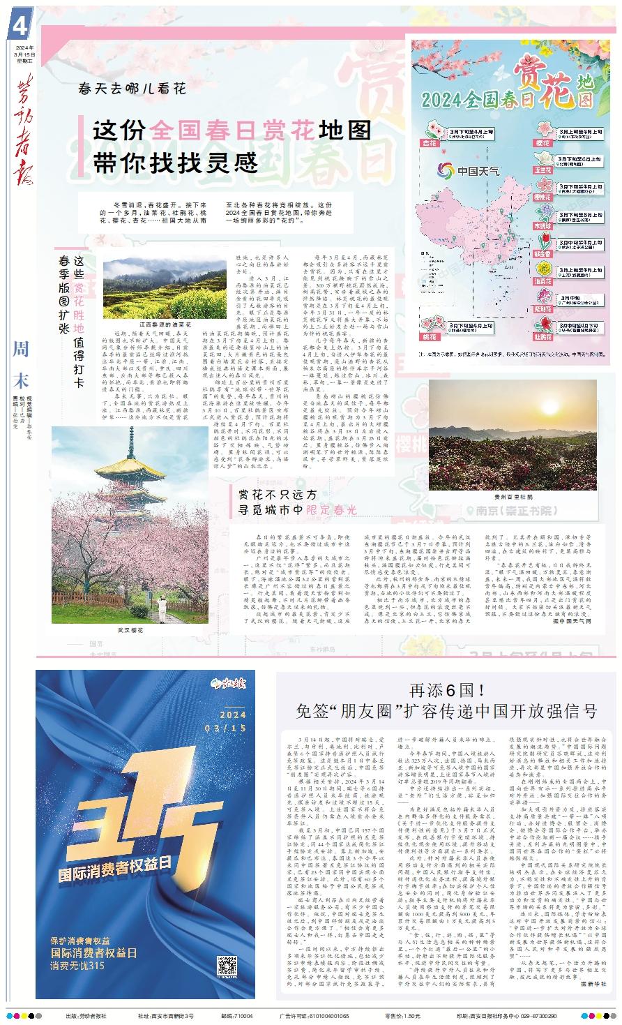 江西婺源的油菜花武汉樱花 贵州百里杜鹃 冬雪消退,春花盛开。接下来的一个多月,油菜花、杜鹃花、桃花、樱花、杏花……祖国大地从南至北各种春花将竞相绽放。这份2024全国春日赏花地图,带你奔赴一场绚丽多彩的“花约”。春季版图扩张这些赏花胜地值得打卡 近期,随着天气回暖,春天的版图也不断扩大。中国天气网气象分析师李靓介绍,目前春季的最前沿已经跨过淮河抵达华北平原一带,江淮、江南、华南大部以及贵州、重庆、四川东部、云南大部等都已投入春的怀抱,而华北、黄淮也即将踏进春天的门槛。 春来无事,只为花忙。眼下,全国各地的赏花游热度上涨。江西婺源、西藏林芝、新疆伊犁……这些地方不仅是赏花胜地,也是许多人心之向往的春游好去处。 进入3月,江西婺源的油菜花已经次第开放,满目金黄的花田率先吸引了无数游客的目光。眼下正是婺源平原地区油菜花的盛花期,而梯田上的油菜花花期偏晚,预计盛花期在3月下旬至4月上旬。婺源最美的还要数篁岭山上的油菜花田,大片嫩黄色的花朵包围着白墙黑瓦古村落,直接定格成经典的语文课本封面,展现出迷人的春日风光。 绵延上百公里的贵州百里杜鹃享有“地球彩带·世界花园”的美誉,每年春天,贵州的花海旅游在这里被唤醒。今年3月10日,百里杜鹃景区宣布正式进入赏花季,预计花期将持续至4月下旬。百里杜鹃花开时,不同花形、不同颜色的杜鹃花在阳光的沐浴下交相辉映,气势磅礴。置身林间花径,可以感受到“花香醉游客,鸟语惊人梦”的山水之乐。 每年3月至4月,西藏林芝都会吸引众多游客不远千里前去赏花。因为,只有在这里才能见到桃花掩映下的雪山之景。300万棵野桃花蔚然成海,树高花繁,宣告着藏域之春的怦然降临。林芝桃花的最佳观赏期是在3月下旬至4月上旬,今年3月31日,一年一度的林芝桃花节又将盛大开幕,不妨约上三五好友去赴一场与雪山为伴的桃花盛宴。 几乎每年春天,新疆的杏花都会美上热搜。3月下旬至4月上旬,当进入伊犁杏花的最佳观赏期,漫山遍野的杏花从帕米尔高原的塔什库尔干河谷一路蔓延,越过雪山、冰川、森林、草甸,一幕一景像是走进了油画里。 青岛崂山的樱桃花仿佛是当地春天的风信子,每年都是最先绽放。预计今年崂山樱桃花的观赏期为3月下旬至4月上旬,最出片的大崂樱桃谷将在3月18日左右进入始花期,盛花期在3月23日前后。置身樱桃谷,仿佛步入陶渊明笔下的世外桃源,阵阵春风中,寻芳草鲜美、赏落英缤纷。赏花不只远方寻觅城市中限定春光 春日的繁花盛景不可辜负,即使无暇踏足远方,也不要错过城市中这些近在身边的花事。 广州是最早步入春季的大城市之一,这里不仅“花样”繁多,而且花期长,绝对是“城市赏花界”的佼佼者。眼下,海珠湿地公园3.2公里的紫荆花长廊是广州不容错过的春日盛景之一。行走其间,看着漫天宫粉紫荆如精灵般起舞,不时几片花瓣带着幽香飘落,仿佛是春天送来的礼物。 谈起城市的最美花景,肯定少不了武汉的樱花。随着天气渐暖,这座城市里的樱花日渐盛放。今年的武汉东湖樱花节已于3月7日开幕,预计到3月中下旬,东湖樱花园染井吉野等品种将迎来盛花期,届时粉色花瓣挂满枝头,满园樱花如云似霞,行走其间可尽情感受春色浪漫。 此外,杭州的郁金香、南京的木绣球等也都将在3月中旬或下旬迎来最佳观赏期,当地的小伙伴们可不要错过了。 相比于南方城市,北方城市的春色虽晚到一些,但春花的浪漫丝毫不减。像是北京的白玉兰,它仿佛京城春天的信使,玉兰花一开,北京的春天就到了。尤其开在颐和园、潭柘寺等名胜古迹中的玉兰花,洁白如雪、清香四溢,在古建筑的映衬下,更显高雅与朴素。 “春春花开岂有极,日日我醉终无涯。”眼下气温回暖、万物复苏、春意渐盛,未来一周,我国大部地区气温将较常年偏高,特别是内蒙古中东部、河北南部、山东西部和河南大部温暖程度甚至堪比常年四月,正是出门赏花的好时候。大家不妨密切关注最新天气预报,不要错过这份春天独有的浪漫。 据中国天气网