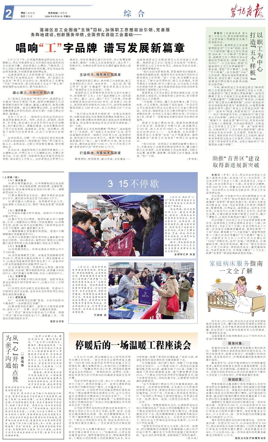 3月11日下午,在环城西路街道西仪坊与大庆路路口,西安市莲湖区总工会开展的就业服务活动正火热进行着。活动现场人头攒动、气氛热烈,工作人员耐心解答求职者的各种问题,并宣传就业创业相关政策,介绍辖区最新招聘信息。 这是莲湖区总工会持续推进“县级工会加强年”专项工作走深走实的一项举措。自“县级工会加强年”专项工作启动以来,莲湖区总工会聚焦“五强”目标任务,努力把县级工会这个“桥头堡”建设得更加充满活力、更为强劲有力。凝心聚力,思想引领有力度 在“县级工会加强年”专项工作中,莲湖区总工会锚定“政治引领强”目标,组织劳模和职工代表参观党员教育学习基地、重温入党誓词、参观劳模精神展示馆等。成立劳模故事宣讲团,在全区开展劳模故事宣讲系列活动,团结引领广大职工群众听党话、跟党走。 去年7月28日,一场别开生面的宣讲活动在莲湖区委党校开讲。马玲、刘自立、薛振西、韩建军、李雪瑶、胡红亮6位来自不同行业的劳动模范,用朴素的语言、真挚的情感、生动的事例讲述了自己立足本职、爱岗敬业、争创一流的事迹,展现了新时代劳动者风采,打动了在场的企业职工。 宣讲结束后,劳模一同上台诵读红色经典诗歌《红船从南湖起航》,持续推进“四史”学习教育入脑入心、走深走实,让职工增强理论基础,坚定理想信念。 仅2023年,莲湖区各级工会组织开展党的二十大精神宣讲,中国工会十八大精神宣讲,劳模工匠进企业、车间、校园、班组等各类宣传教育活动80余场,参与职工5万余人。宣讲者通过分享学习心得体会,讲述自身成长成才的经历,用小故事诠释大情怀,激励广大职工立足本职岗位,埋头苦干,积极作为,为推动全区经济社会高质量发展注入新动能。主动作为,服务维权有温度 “竭诚服务职工群众、维护职工合法权益,是工会组织的初心所在、使命所系。一直以来,把‘职工呼声’变成‘幸福掌声’是全区各级工会的共识。”莲湖区总工会主席张广宁说。 莲湖区总工会积极开展劳动争议多元化解工作,持续推进“工会+人社”裁前调解工作,运用耐心、细心、换心、交心、暖心“五心”工作法,目前成功调解各类劳动纠纷640余件,涉及职工700余人,挽回各类经济损失约1260万元,法律咨询和政策服务职工1500余人次,将工会维权工作干在实处。 “我们通过开展系列调研进一步落实协商机制,将推动新就业形态领域开展集体协商纳入工作重点,着力推动集体协商制度在新就业形态领域落地落实,切实维护新就业形态劳动者合法权益。”张广宁说。 莲湖区总工会还持续擦亮“四季送”、就业援助等“工”字品牌。自“县级工会加强年”以来,双节送温暖活动慰问一线职工9100余人次,发放慰问金、慰问品共计185.35余万元。组织“春风送真情援助暖民心”线上、线下招聘会14场,参与企业296家;提供就业岗位11345个,为17名农民工申请“求学圆梦行动”学历补贴1.7万元。打造阵地,夯基固本有深度 精准摸排、规范组建、重点突破、全面覆盖——这是莲湖区总工会推进建会入会的创新工作思路。莲湖区总工会以“县级工会加强年”为契机,推动建会入会工作向农民工、新就业形态劳动者、社会组织领域延伸。 “我们主动与区税务局、区委组织部对接联系,取得相关数据信息,根据不同企业采取不同的方式推动建会工作开展。”张广宁说,针对规模企业实地走访,了解企业经营状况、职工生活情况,手把手指导工会组建;针对小微企业,以行业性工会联合会建设为抓手,最大限度把新就业形态劳动者及各类职工组织到工会中来。 莲湖区总工会还从职工多样化需求出发,打通服务职工新途径,打造服务职工新阵地,吸引更多职工加入工会组织。 “可取暖,可纳凉,渴了有地方喝水,累了可以休息,在工会驿站,我找到了家的感觉。”外卖员苏志平在浦发银行西安北大街支行工会爱心驿站里说。近年来,莲湖区总工会已累计建成为户外劳动者提供休息、补给的工会爱心驿站80家,平均每公里2家,织成了一张能够就近提供服务劳动者的关爱网。 建成工会爱心驿站80家,建成各级模范职工之家30家、各级职工书屋73家,新增基层工会252家,新入会会员10603人,其中新就业形态劳动者3914人……一连串数据,生动诠释了莲湖区总工会紧扣“加强”这个明确要求,高质高效推动“县级工会加强年”专项工作走深走实。 “我们将进一步增强工会组织的凝聚力和向心力,不断强化工会组织的桥梁纽带作用,着力提升职工生活品质,立足困难职工的实际需要,为职工办实事、做好事、解难事,增强职工的幸福感、获得感。”张广宁说。 (李旭东)