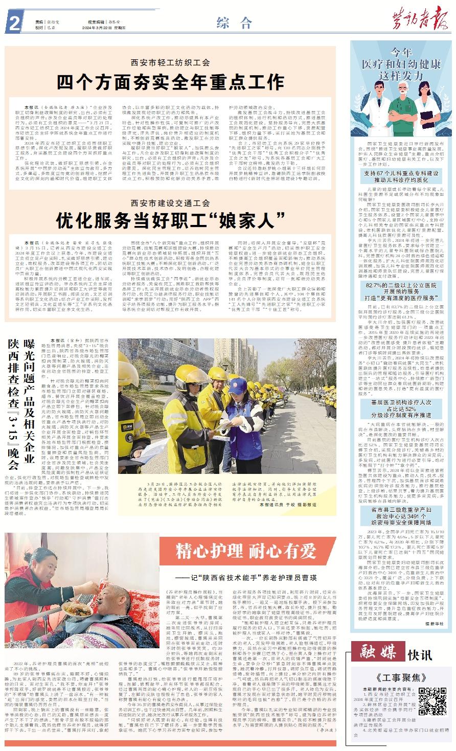 《工事聚焦》 本期新闻的主要内容有: 1.西安市轻工纺织工会2024年度工作会议召开 2.碑林区总工会开展“服务实体经济 律企携手同行”专项普法活动 3.灞桥区总工会开展公益法律宣传服务 4.北关街道总工会举办家门口就业招聘会