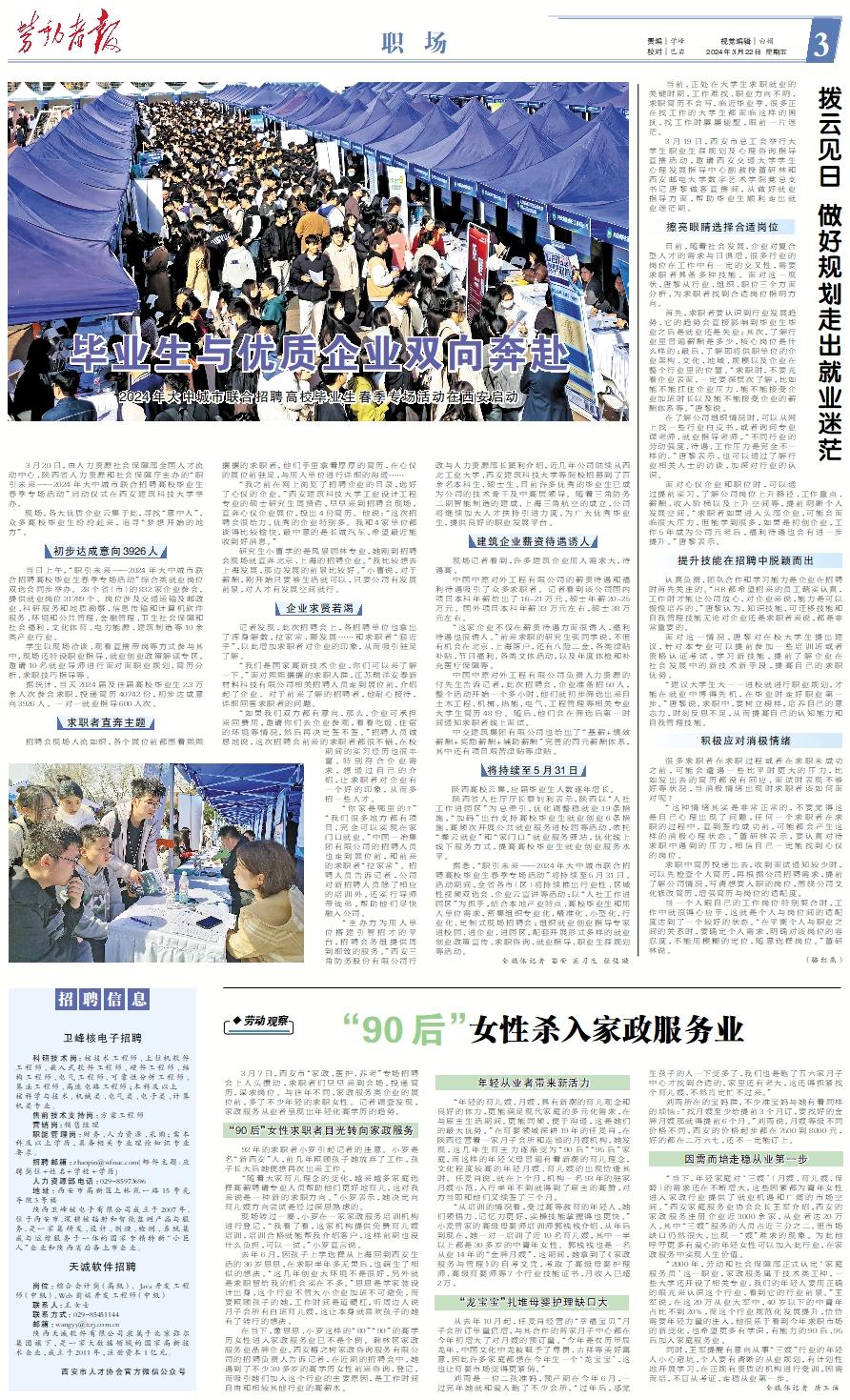 3月7日,西安市“家政、医护、养老”专场招聘会上人头攒动,求职者们早早来到会场,投递简历,谋求岗位。与往年不同,家政服务类企业的展位前,多了不少年轻的求职女性。记者调查发现,家政服务从业者呈现出年轻化高学历的趋势。“90后”女性求职者目光转向家政服务 92年的求职者小罗引起记者的注意。小罗是名“新西安”人,前几年照顾孩子她放弃了工作,孩子长大后她便想再次出来工作。 “随着大家育儿理念的变化,越来越多家庭选择高薪聘请专业人员帮助他们更好地育儿,这对我来说是一种新的求职方向。”小罗表示,她决定向育儿嫂方向尝试是经过深思熟虑的。 现场转过一圈,小罗在一家家政服务培训机构进行登记,“我看了看,这家机构提供免费育儿嫂培训,培训合格就能帮我介绍客户,这样前期也没什么负担,可以一试。”小罗直言说。 去年6月,因孩子上学选择从上海回到西安生活的36岁思思,在求职半年多无果后,也萌生了相似的想法。“这几年创业大环境不是很好,另外就是求职留给我的机会实在不多。”思思是学家装设计出身,这个行业不管大小企业加班不可避免,而要照顾孩子的她,工作时间是道硬杠,听周边人说月子会所有白班育儿嫂,这让本身就喜欢孩子的她有了转行的想法。 在当下,像思思、小罗这样的“80”“90”的高学历女性进入家政服务业已不是个例。碑林区家政服务业品牌企业,西安榕之树家政咨询服务有限公司的招聘负责人告诉记者,在近期的招聘会中,她遇到了不少30多岁的高学历女性前来咨询、登记,而吸引她们加入这个行业的主要原因,是工作时间自由和相较其他行业的高薪水。年轻从业者带来新活力 “年轻的育儿嫂、月嫂,具有新潮的育儿观念和良好的体力,更能满足现代家庭的多元化需求,在与雇主生活期间,更能同频,便于沟通,这是她们的最大优势。”在育婴领域深耕19年的任麦肖,在陕西经营着一家月子会所和连锁的月嫂机构,她发现,这几年生育主力逐渐变为“90后”“95后”家庭,而这样的年轻父母普遍有着新潮的育儿理念,文化程度较高的年轻月嫂、育儿嫂的出现恰逢其时。任麦肖说,就在上个月,机构一名93年的驻家月嫂小范,入行半年不到就得到了雇主的高赞,对方当即和他们又续签了三个月。 “从培训的情况看,受过高等教育的年轻人,她们领悟力、记忆力更好,实操技能掌握得也更快。”小麦管家的高级母婴师培训师郭钱钱介绍,从年后到现在,她一对一培训了近10名育儿嫂,其中一半以上都是30多岁的中青年女性。郭钱钱也是一名从业14年的“金牌月嫂”,这期间,她拿到了《家政服务与管理》的自考文凭,考取了高级母婴护理师、高级育婴师等7个行业技能证书,月收入已超2万。“龙宝宝”扎堆母婴护理缺口大 从去年10月起,任麦肖经营的“幸福宝贝”月子会所订单量倍增,与其合作的两家月子中心都在今年初增大了对月嫂的预订量。“今年是农历甲辰龙年,中国文化中龙被赋予了尊贵、吉祥等美好寓意,因此许多家庭都想在今年生一个‘龙宝宝’,这也让育婴市场变得更紧俏。” 刘雨是一位二孩准妈,预产期在今年6月,一过完年她就和爱人跑了不少会所,“过年后,感觉生孩子的人一下变多了,我们也是跑了五六家月子中心才找到合适的,家里还有老大,这还得抓紧找个育儿嫂,不然肯定忙不过来。” 刘雨所在的宝妈群,不少准宝妈与她有着同样的烦恼:“找月嫂至少给提前3个月订,要找好的金牌月嫂那就得提前6个月。”刘雨说,月嫂等级不同价格不同,西安的价格起步都在7500到8000元,好的都在二万六七,还不一定能订上。因需而培走稳从业第一步 “当下,年轻家庭对‘三嫂’(月嫂、育儿嫂、保姆)的需求还在不断增大,这些因素都为青年女性进入家政行业提供了就业机遇和广阔的市场空间。”西安家庭服务业协会会长王军介绍,西安的家政服务注册企业近3000余家,从业者达20万人,其中“三嫂”服务的人员占近三分之二,但市场缺口仍然很大,出现一“嫂”难求的现象。为此他呼吁更多有爱心的年轻女性可以加入此行业,在家政服务中实现人生价值。 “2000年,劳动和社会保障部正式认定‘家庭服务员’这一职业,家政服务属于技术类工种,一些大学还开设了相关专业,我们的年轻人要用正确的眼光来认识这个行业,看到它的行业前景。”王军说,在这20万从业大军中,40岁以下的中青年占比不到20%,而这个行业规范化发展提升,恰恰需要年轻力量的注入,他很乐于看到今年求职市场的新变化,也希望更多有学识,有能力的90后、95后加入家庭服务业。 同时,王军提醒有意向从事“三嫂”行业的年轻人小心避坑,个人要有清晰的从业规划,有计划性地开展学习,在正规有资质的机构进行受训,因需而培,不盲从考证,走稳从业第一步。 全媒体记者 唐玉洁