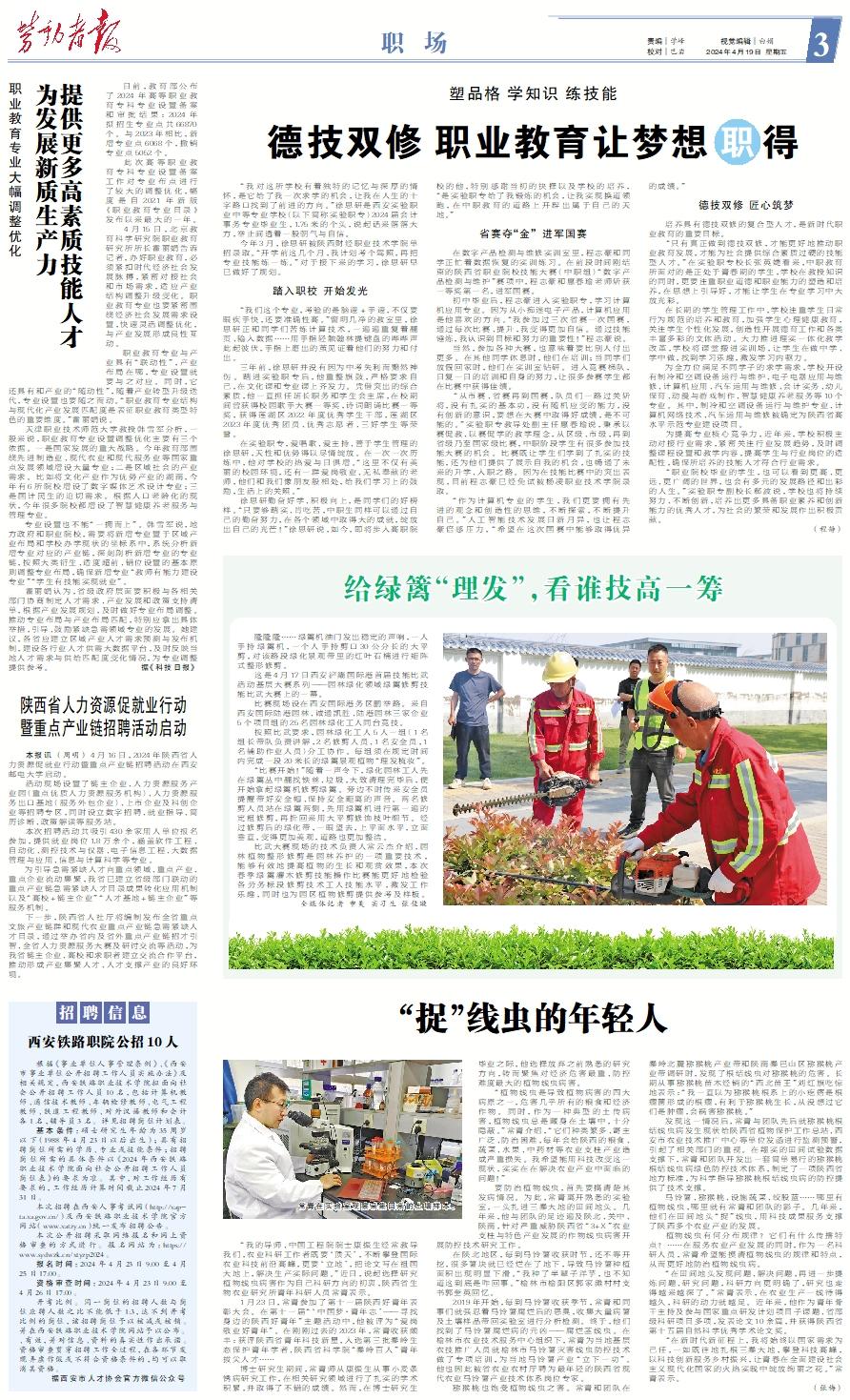 “我对这所学校有着独特的记忆与深厚的情怀,是它给了我一次求学的机会,让我在人生的十字路口找到了前进的方向。”徐思研是西安实验职业中等专业学校(以下简称实验职专)2024届会计事务专业毕业生,1.75米的个头,说起话来落落大方,举止间透着一股朝气与自信。 今年3月,徐思研被陕西财经职业技术学院单招录取。“开学前这几个月,我计划考个驾照,再把专业技能练一练。”对于接下来的学习,徐思研早已做好了规划。踏入职校 开始发光 “我们这个专业,考验的是脑速+手速,不仅要眼疾手快,还要准确性高。”窗明几净的教室里,徐思研正和同学们苦练计算技术,一遍遍重复着翻页、输入数据……用手指轻触翰林提键盘的哗哗声此起彼伏,手指上磨出的茧见证着他们的努力和付出。 三年前,徐思研并没有因为中考失利而黯然神伤。踏进实验职专后,他重整旗鼓,严格要求自己,在文化课和专业课上齐发力。凭借突出的综合素质,他一直担任班长职务和学生会主席,在校期间曾获得校园歌手大赛一等奖,诗词朗诵比赛一等奖,获得莲湖区2022年度优秀学生干部,莲湖区2023年度优秀团员、优秀志愿者、三好学生等荣誉。 在实验职专,爱唱歌、爱主持、善于学生管理的徐思研,天性和优势得以尽情绽放。在一次一次历练中,他对学校的热爱与日俱增。“这里不仅有美丽的校园环境,还有一群爱岗敬业、无私奉献的老师,他们和我们像朋友般相处,给我们学习上的鼓励,生活上的关照。” 徐思研勤奋好学、积极向上,是同学们的好榜样。“只要够踏实、肯吃苦,中职生同样可以通过自己的勤奋努力,在各个领域中取得大的成就,绽放出自己的光芒!”徐思研说,如今,即将步入高职院校的他,特别感谢当初的抉择以及学校的培养,“是实验职专给了我锻炼的机会,让我实现换道领跑,在中职教育的道路上开辟出属于自己的天地。”省赛夺“金” 进军国赛 在数字产品检测与维修实训室里,程志豪和同学正忙着数据恢复的实训练习。在前段时间刚结束的陕西省职业院校技能大赛(中职组)“数字产品检测与维护”赛项中,程志豪和惠春瑜老师斩获一等奖第一名,进军国赛。 初中毕业后,程志豪进入实验职专,学习计算机应用专业。因为从小痴迷电子产品,计算机应用是他喜欢的方向。“我参加过三次省赛一次国赛,通过每次比赛、提升,我变得更加自信。通过技能锤炼,我认识到目标和努力的重要性!”程志豪说。 当然,参加各种大赛,也意味着要比别人付出更多。在其他同学休息时,他们在培训;当同学们放假回家时,他们在实训室钻研。进入竞赛梯队,日复一日的培训和自身的努力,让很多参赛学生都在比赛中获得佳绩。 “从市赛、省赛再到国赛,队员们一路过关斩将,没有扎实的基本功,没有随机应变的能力,没有创新的意识,要想在大赛中取得好成绩,是不可能的。”实验职专教导处副主任惠春瑜说,秉承以赛促教、以赛促学的教学理念,从区级、市级,再到省级乃至国家级比赛,中职阶段学生有很多参加技能大赛的机会。比赛既让学生们学到了扎实的技能,还为他们提供了展示自我的机会,也畅通了未来的升学、入职之路。因为在技能比赛中的突出表现,目前程志豪已经免试被杨凌职业技术学院录取。 “作为计算机专业的学生,我们更要拥有先进的观念和创造性的思维,不断探索,不断提升自己。”人工智能技术发展日新月异,也让程志豪倍感压力,“希望在这次国赛中能够取得优异的成绩。”德技双修 匠心筑梦 培养具有德技双修的复合型人才,是新时代职业教育的重要目标。 “只有真正做到德技双修,才能更好地推动职业教育发展,才能为社会提供综合素质过硬的技能型人才。”在实验职专校长张英婕看来,中职教育所面对的是正处于青春期的学生,学校在教授知识的同时,更要注重职业道德和职业能力的塑造和培养,在思想上引导好,才能让学生在专业学习中大放光彩。 在长期的学生管理工作中,学校注重学生日常行为规范的培养和教育,加强学生心理健康教育,关注学生个性化发展,创造性开展德育工作和各类丰富多彩的文体活动。大力推进理实一体化教学改革,学校将课堂搬进实训场,让学生在做中学、学中做,找到学习乐趣,激发学习内驱力。 为全方位满足不同学子的求学需求,学校开设有制冷和空调设备运行与维护、电子电器应用与维修、计算机应用、汽车运用与维修、会计实务、幼儿保育、动漫与游戏制作、智慧健康养老服务等10个专业。其中,制冷和空调设备运行与维护专业、计算机网络技术、汽车运用与维修被确定为陕西省高水平示范专业建设项目。 为提高专业核心竞争力,近年来,学校积极主动对接行业需求,紧密关注行业发展趋势,及时调整课程设置和教学内容,提高学生与行业岗位的适配性,确保所培养的技能人才符合行业需求。 “职业院校毕业的学生,也可以看到更高、更远、更广阔的世界,也会有多元的发展路径和出彩的人生。”实验职专副校长郗波说,学校也将持续努力、不断创新,培养出更多具备职业素养和创新能力的优秀人才,为社会的繁荣和发展作出积极贡献。 (程静)