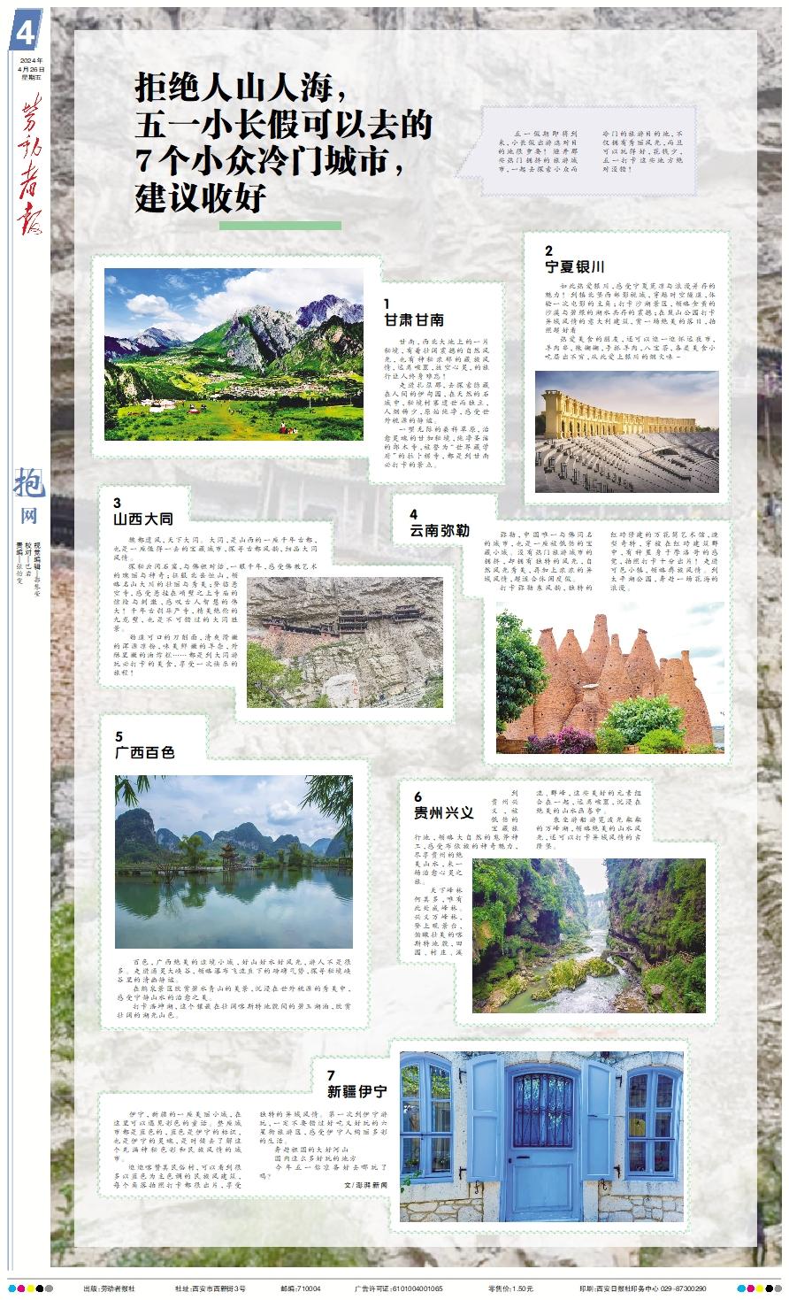 五一假期即将到来,小长假出游选对目的地很重要!避开那些热门拥挤的旅游城市,一起去探索小众而冷门的旅游目的地,不仅拥有秀丽风光,而且可以玩得好,花钱少,五一打卡这些地方绝对没错!甘肃甘南 甘南,西北大地上的一片秘境,有着壮阔震撼的自然风光,也有神秘浓郁的藏族风情,远离喧嚣,放空心灵,的旅行让人终身难忘! 走进扎尕那,去探索隐藏在人间的伊甸园,在天然的石城中,秘境村寨遗世而独立,人烟稀少,原始纯净,感受世外桃源的静谧。 一望无际的桑科草原,治愈灵魂的甘加秘境,纯净圣洁的郎木寺,被誉为“世界藏学府”的拉卜楞寺,都是到甘南必打卡的景点。宁夏银川 如此热爱银川,感受宁夏荒凉与浪漫并存的魅力!到镇北堡西部影视城,穿越时空隧道,体验一次电影的主角;打卡沙湖景区,领略金黄的沙漠与碧绿的湖水共存的震撼;在岚山公园打卡异域风情的意大利建筑,赏一场绝美的落日,拍照超好看 热爱美食的朋友,还可以逛一逛怀远夜市,羊肉串,辣糊糊,手抓羊肉,八宝茶,各类美食小吃层出不穷,从此爱上银川的烟火味~山西大同 魏都遗风,天下大同。大同,是山西的一座千年古都,也是一座值得一去的宝藏城市,探寻古都风韵,细品大同风情。 探秘云冈石窟,与佛祖对话,一眼千年,感受佛教艺术的瑰丽与神奇;征服北岳恒山,领略名山大川的壮丽与秀美;登临悬空寺,感受悬挂在峭壁之上寺庙的惊险与刺激,感叹古人智慧的伟大!千年古刹华严寺,精美绝伦的九龙壁,也是不可错过的大同胜景。 劲道可口的刀削面,清爽滑嫩的浑源凉粉,味美鲜嫩的羊杂,外酥里嫩的油炸糕……都是到大同游玩必打卡的美食,享受一次快乐的旅程!云南弥勒 弥勒,中国唯一与佛同名的城市,也是一座被低估的宝藏小城。没有热门旅游城市的拥挤,却拥有独特的风光,自然风光秀美,再加上浓浓的异域风情,超适合休闲度假。 打卡弥勒东风韵,独特的红砖修建的万花筒艺术馆,造型奇特,穿梭在红砖建筑群中,有种置身于摩洛哥的感觉,拍照打卡十分出片!走进可邑小镇,领略彝族风情。到太平湖公园,奔赴一场花海的浪漫。广西百色 百色,广西绝美的边境小城,好山好水好风光,游人不是很多。走进通灵大峡谷,领略瀑布飞流直下的磅礴气势,探寻秘境峡谷里的清幽静谧。 在鹅泉景区欣赏碧水青山的美景,沉浸在世外桃源的秀美中,感受宁静山水的治愈之美。 打卡浩坤湖,这个镶嵌在壮阔喀斯特地貌间的碧玉湖泊,欣赏壮阔的湖光山色。贵州兴义 到贵州兴义,被低估的宝藏旅行地,领略大自然的鬼斧神工,感受布依族的神奇魅力,尽享贵州的绝美山水,来一场治愈心灵之旅。 天下峰林何其多,唯有此处成峰林。兴义万峰林,登上观景台,俯瞰壮美的喀斯特地貌,田园、村庄、溪流、群峰,这些美好的元素组合在一起,远离喧嚣,沉浸在绝美的山水画卷中。 乘坐游船游览波光粼粼的万峰湖,领略绝美的山水风光,还可以打卡异域风情的吉隆堡。新疆伊宁 伊宁,新疆的一座美丽小城,在这里可以遇见彩色的童话。整座城市都是蓝色的,蓝色是伊宁的标识,也是伊宁的灵魂,是时候去了解这个充满神秘色彩和民族风情的城市。 逛逛喀赞其民俗村,可以看到很多以蓝色为主色调的民族风建筑,每个角落拍照打卡都很出片,享受独特的异域风情。第一次到伊宁游玩,一定不要错过好吃又好玩的六星街旅游区,感受伊宁人绚丽多彩的生活。 奔赴祖国的大好河山 国内这么多好玩的地方 今年五一你准备好去哪玩了吗? 文/澎湃新闻